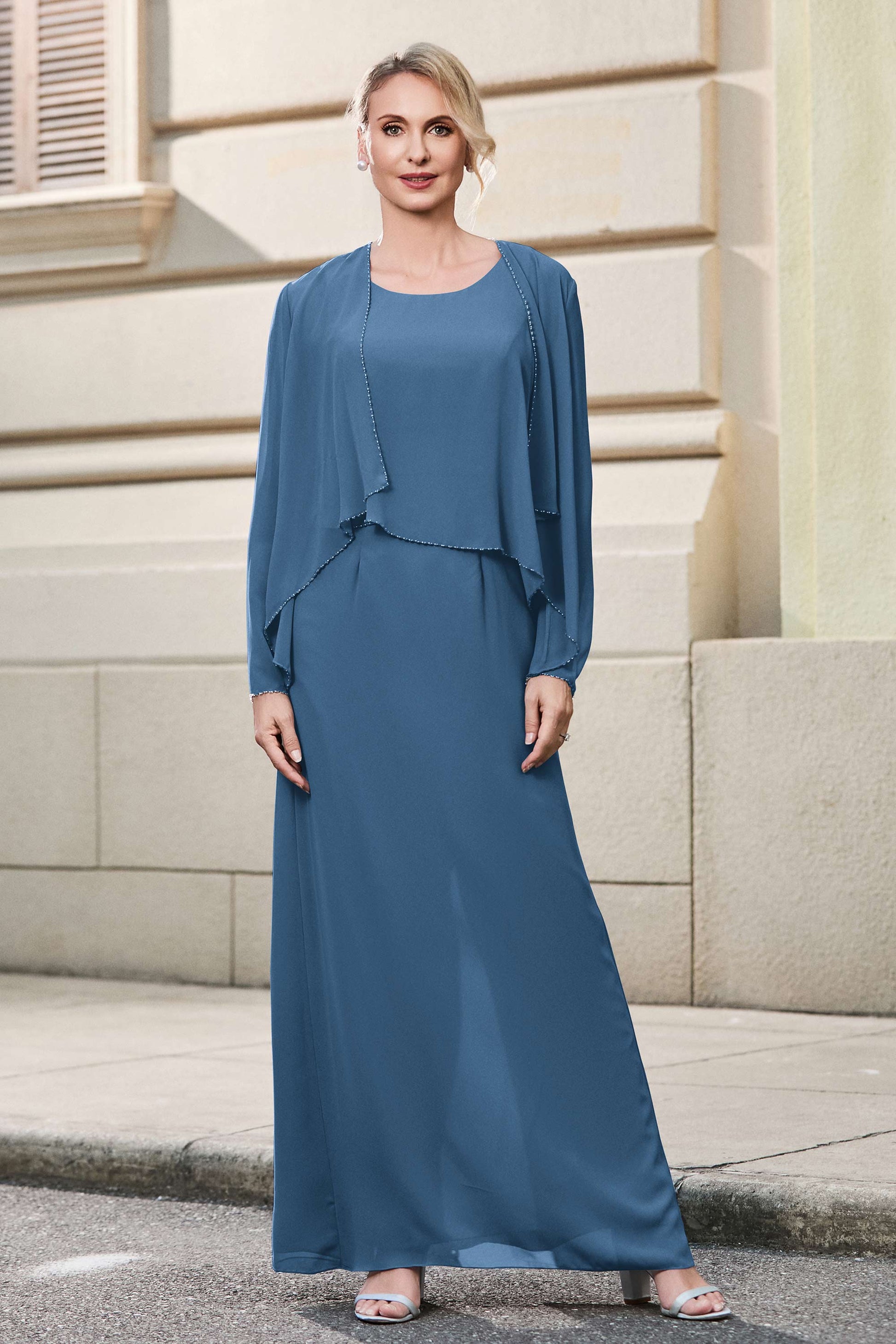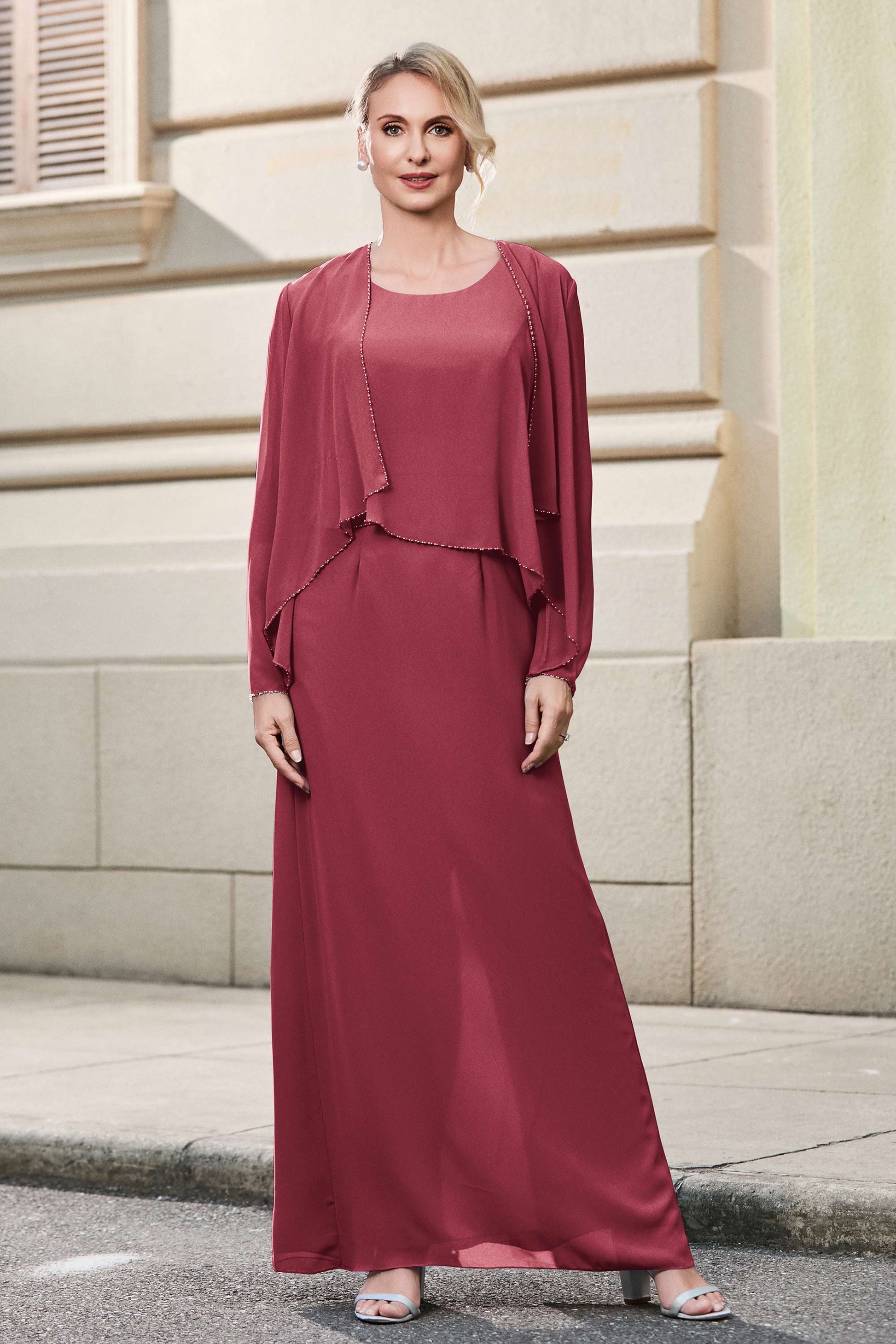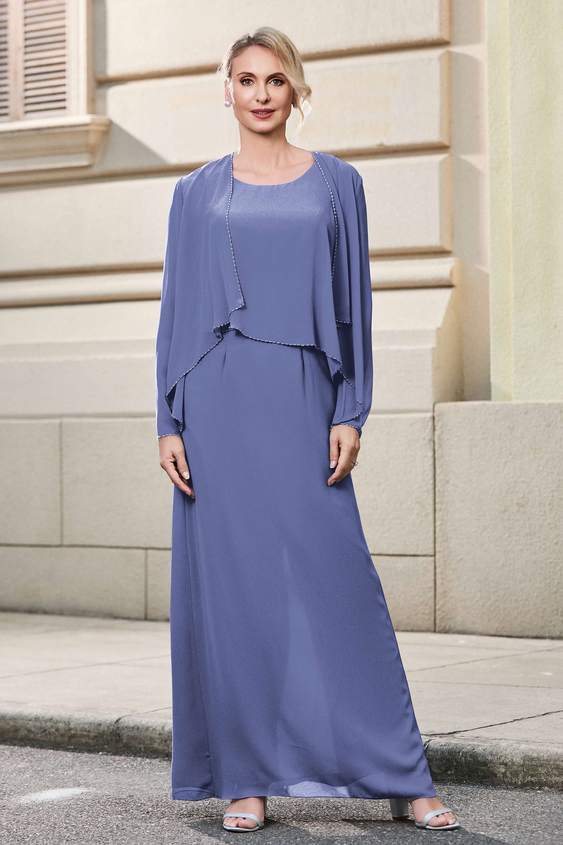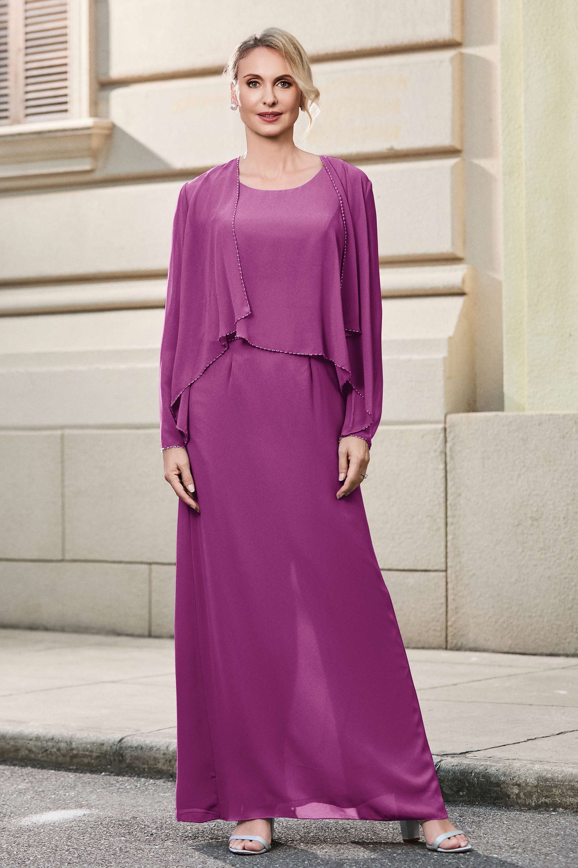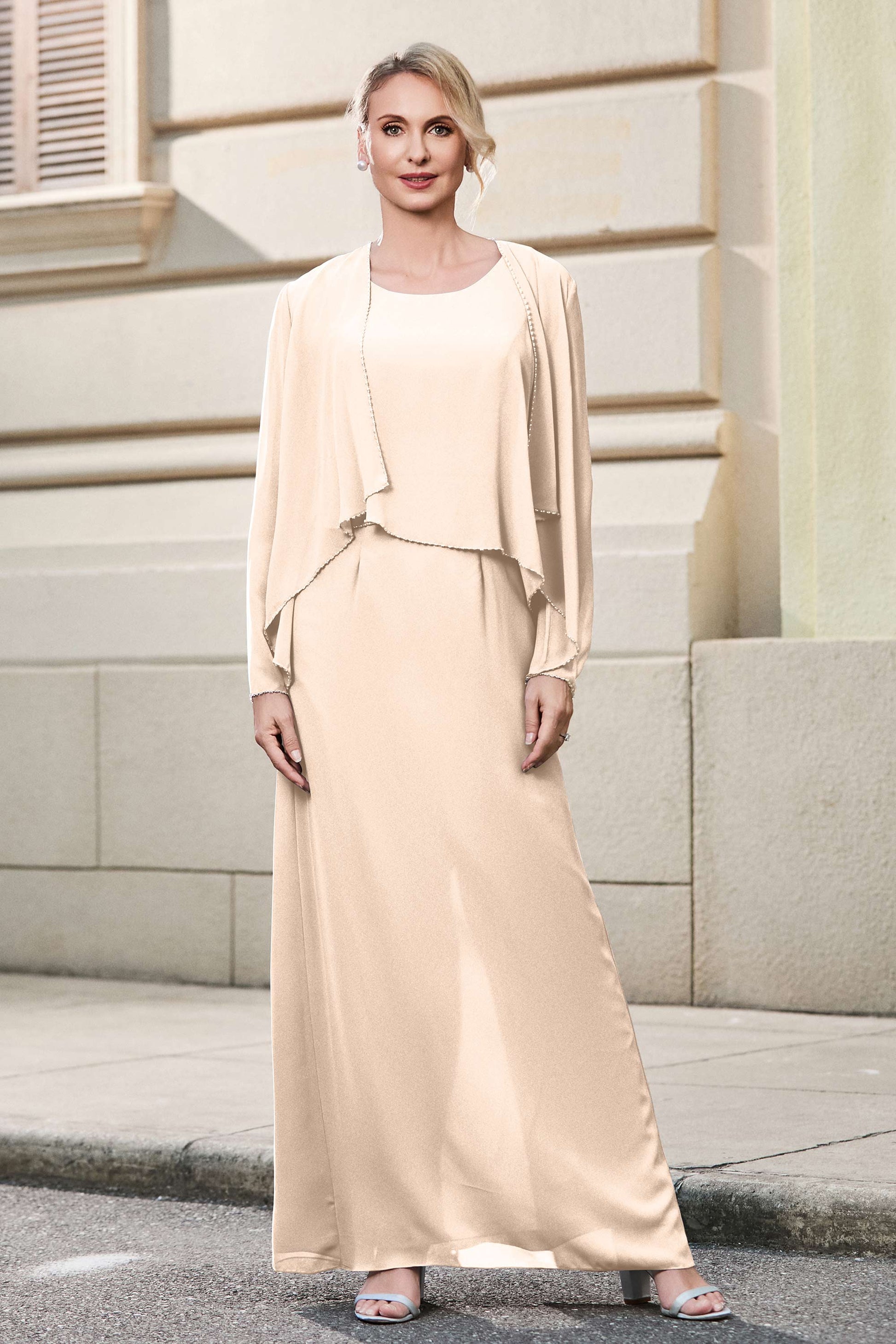 This dress offers an effortlessly chic and sophisticated look. The scoop neckline adds a flattering touch, while the back slit provides a modern, daring twist. Paired with a matching jacket, this dress is perfect for those who seek elegance with a hint of contemporary style.