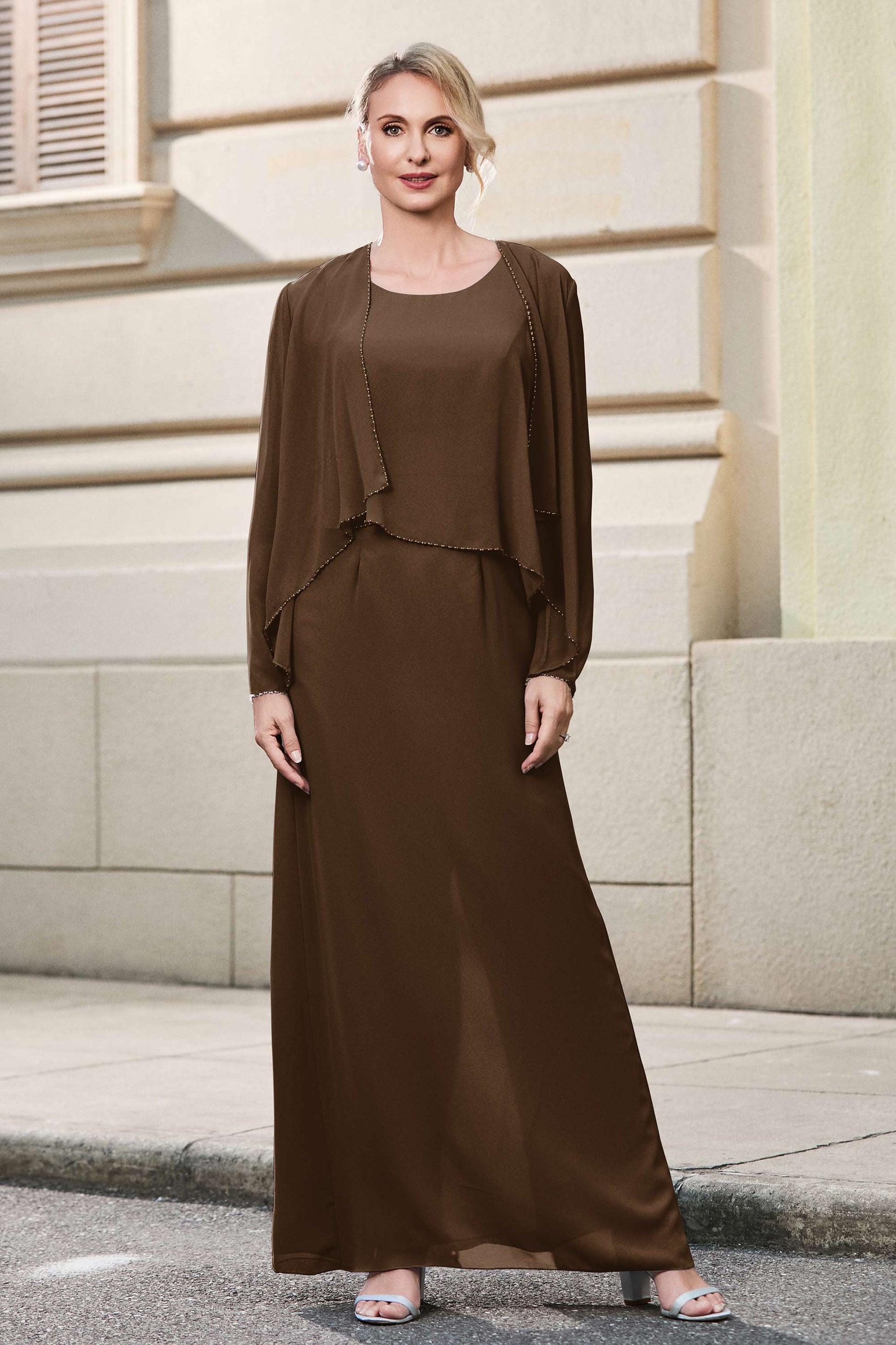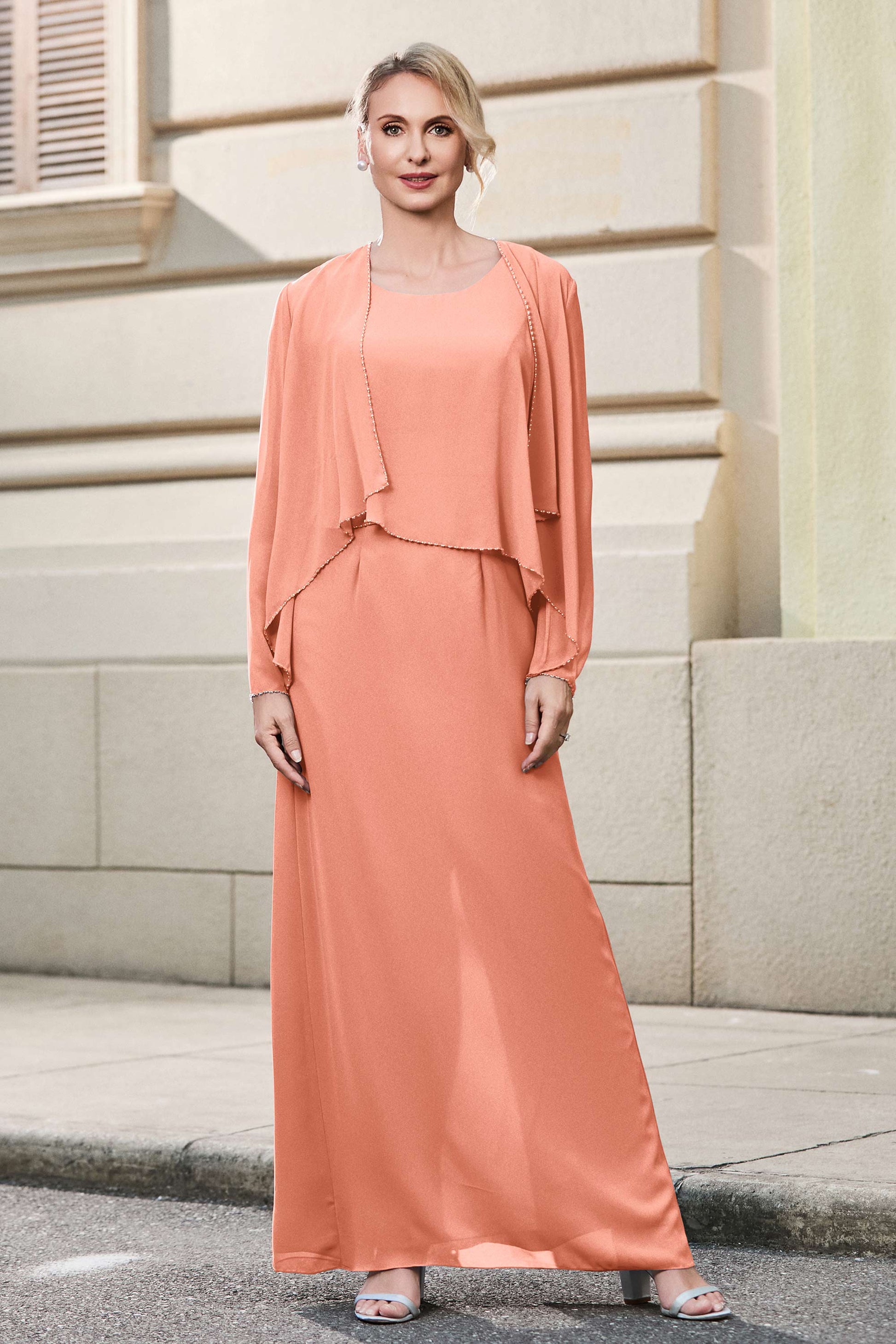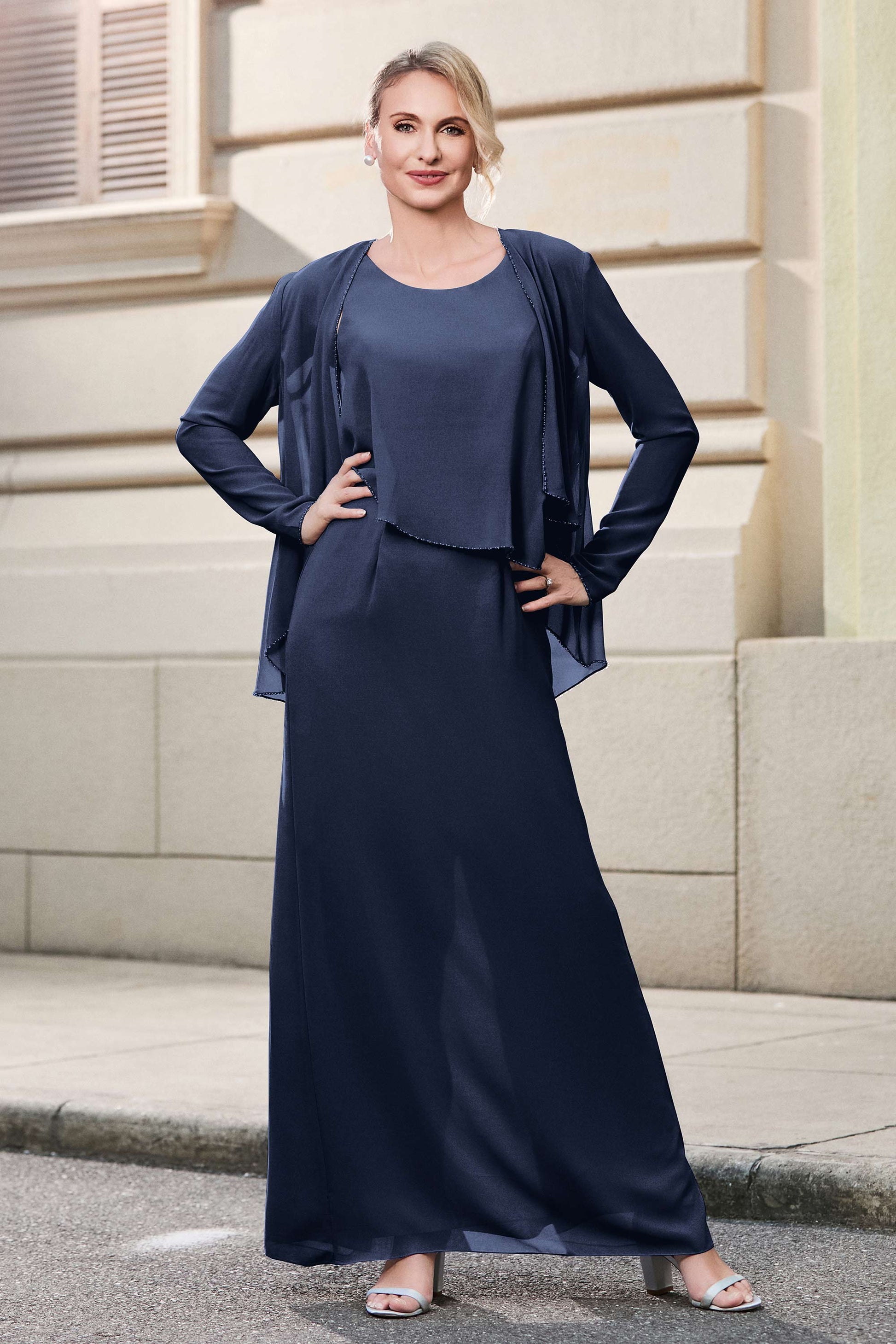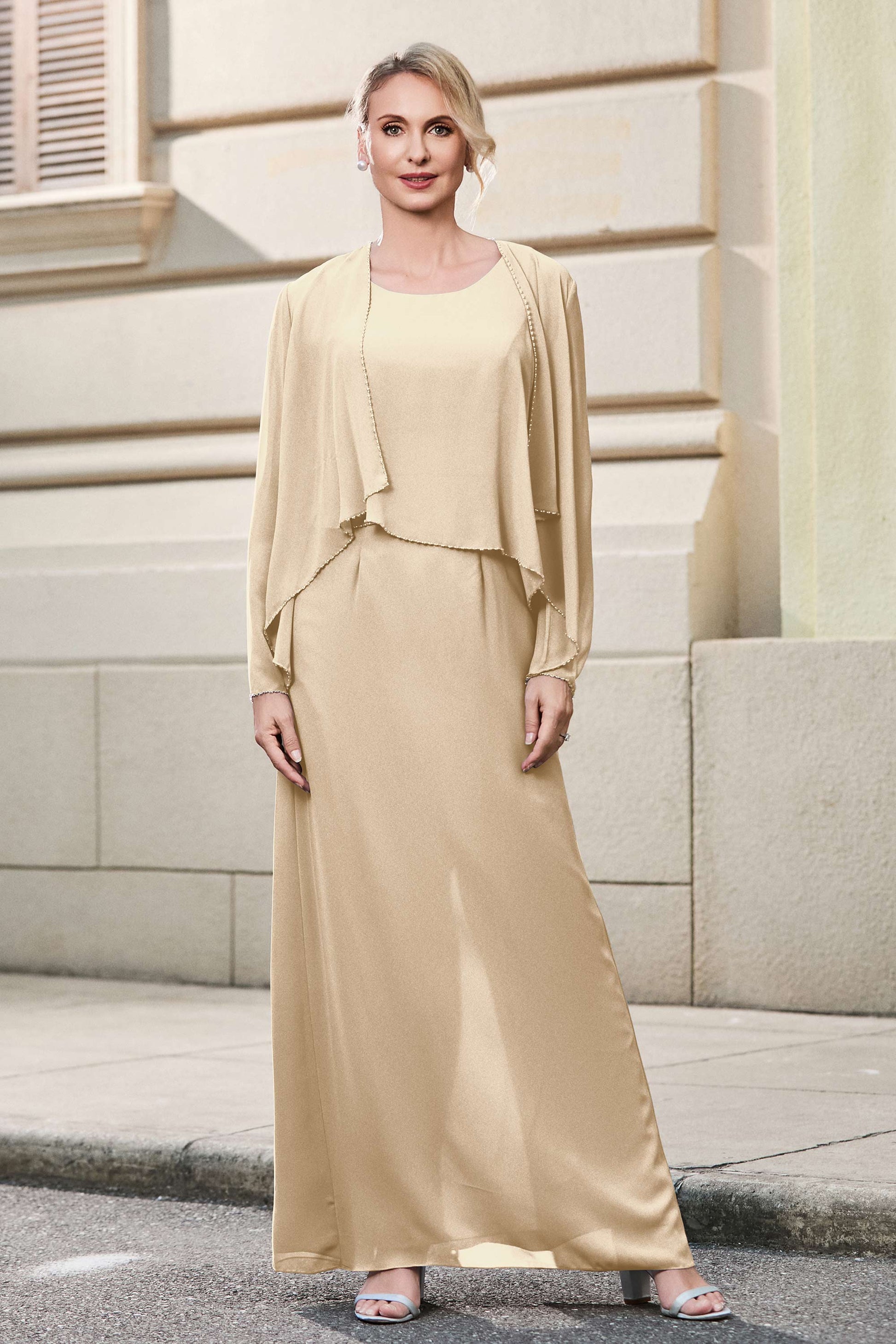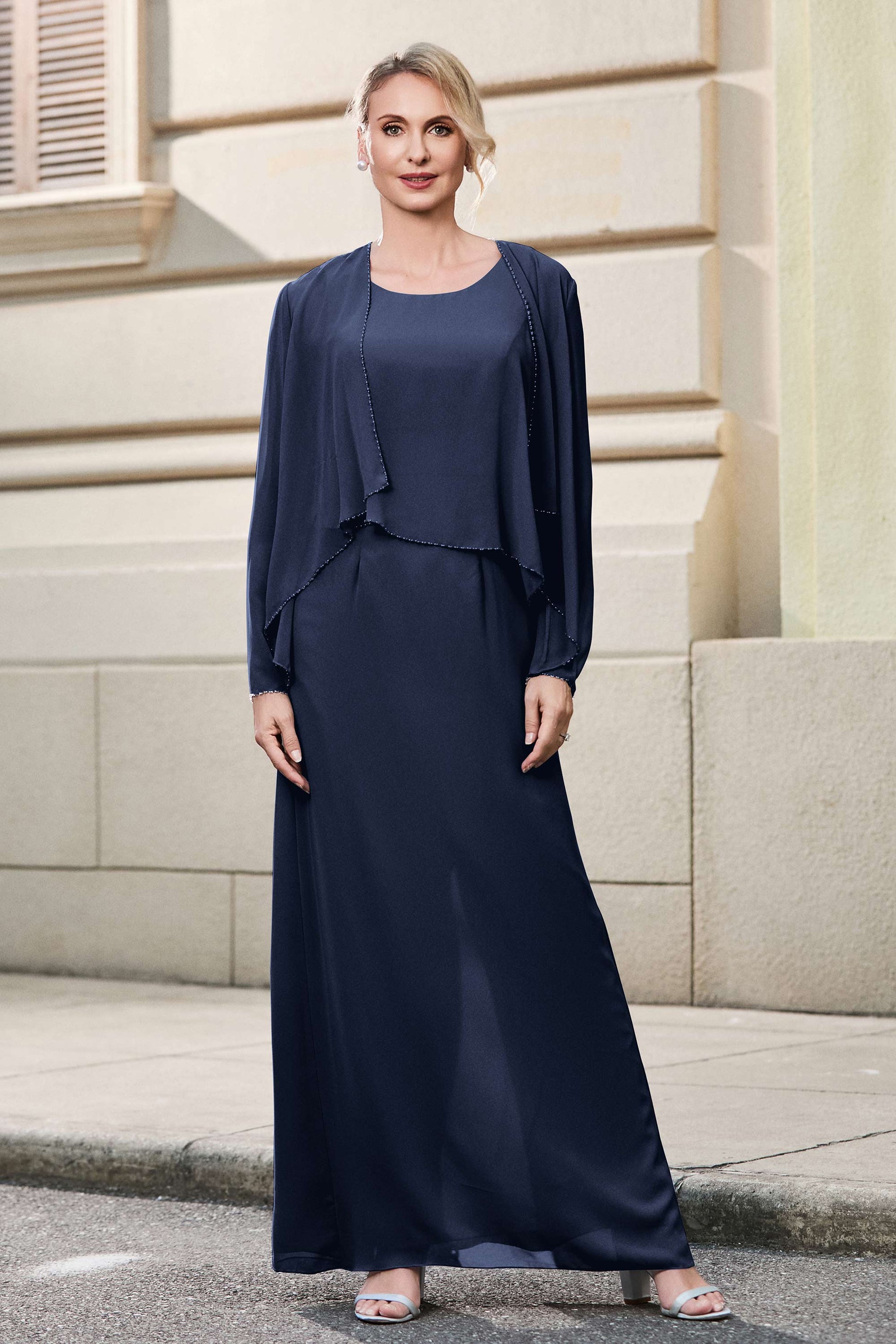 This dress offers an effortlessly chic and sophisticated look. The scoop neckline adds a flattering touch, while the back slit provides a modern, daring twist. Paired with a matching jacket, this dress is perfect for those who seek elegance with a hint of contemporary style.
