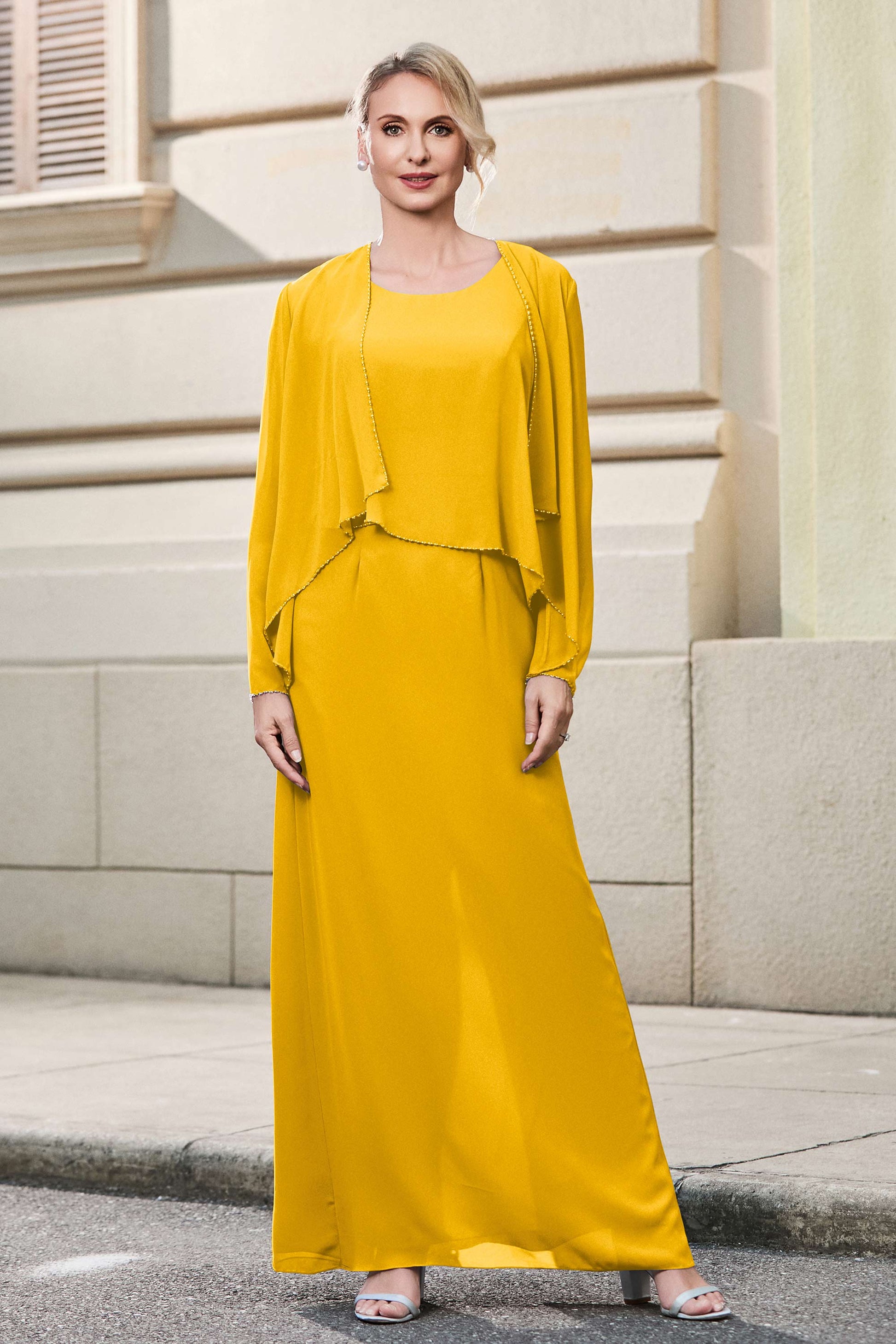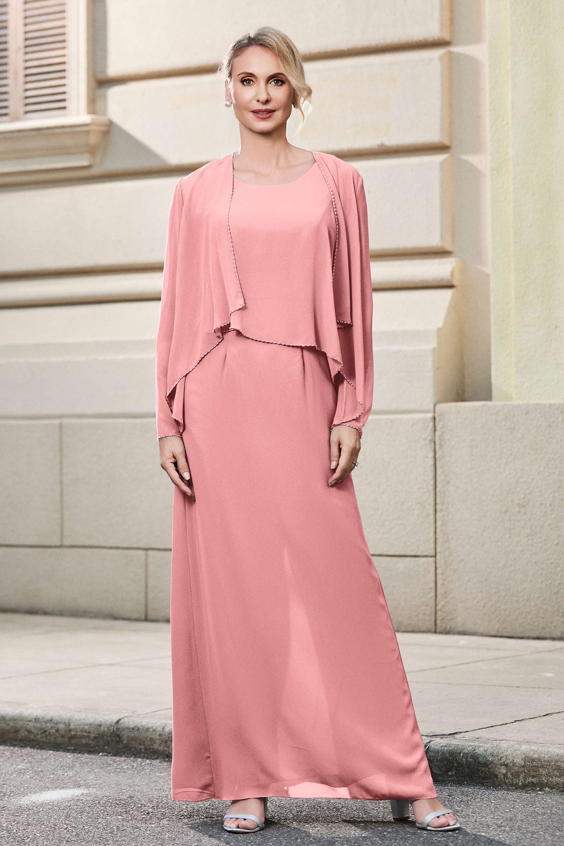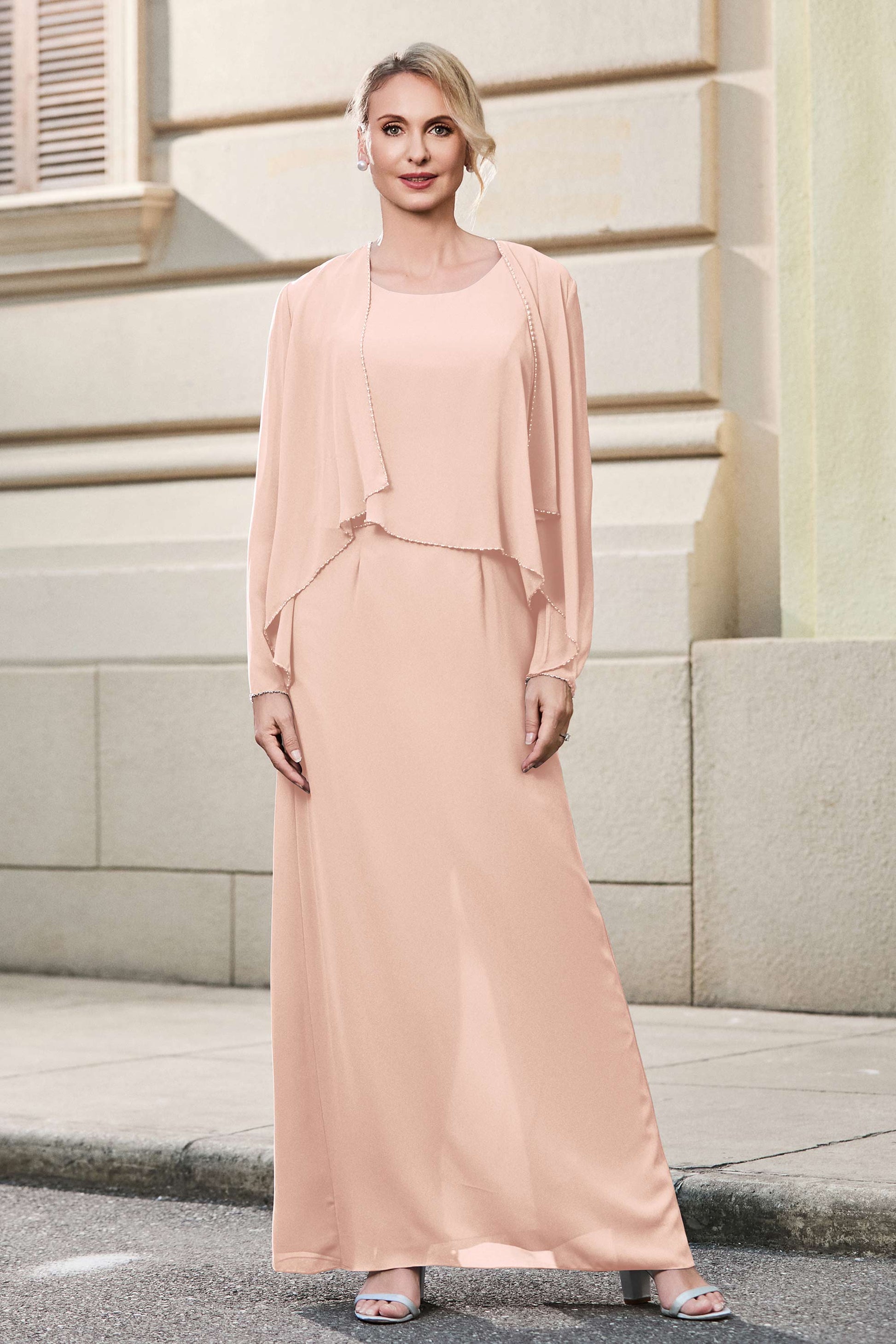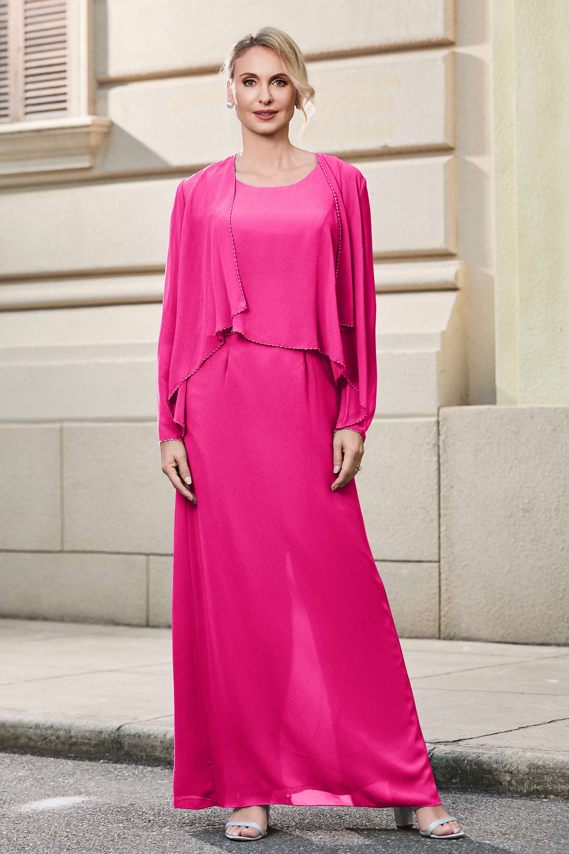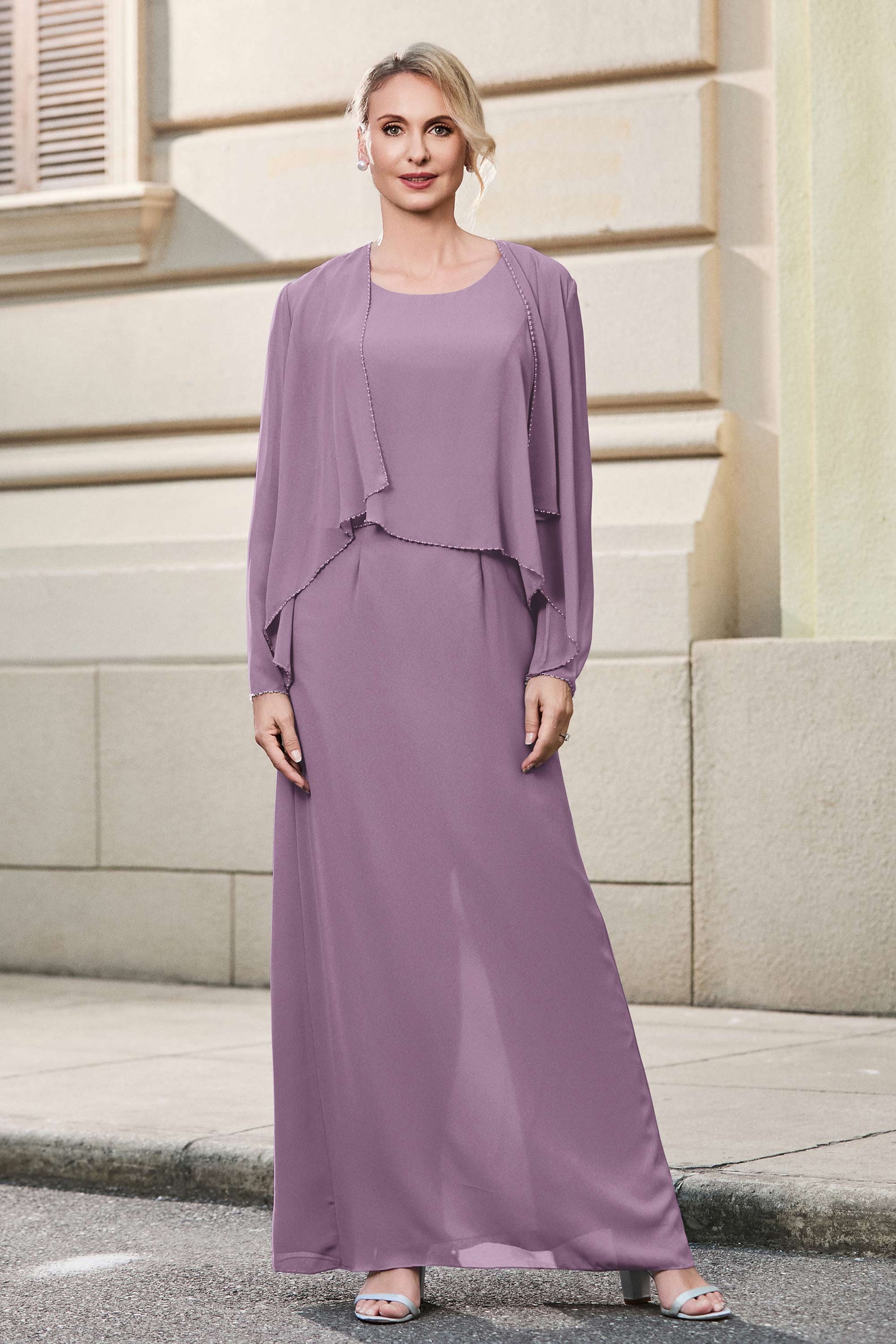 This dress offers an effortlessly chic and sophisticated look. The scoop neckline adds a flattering touch, while the back slit provides a modern, daring twist. Paired with a matching jacket, this dress is perfect for those who seek elegance with a hint of contemporary style.