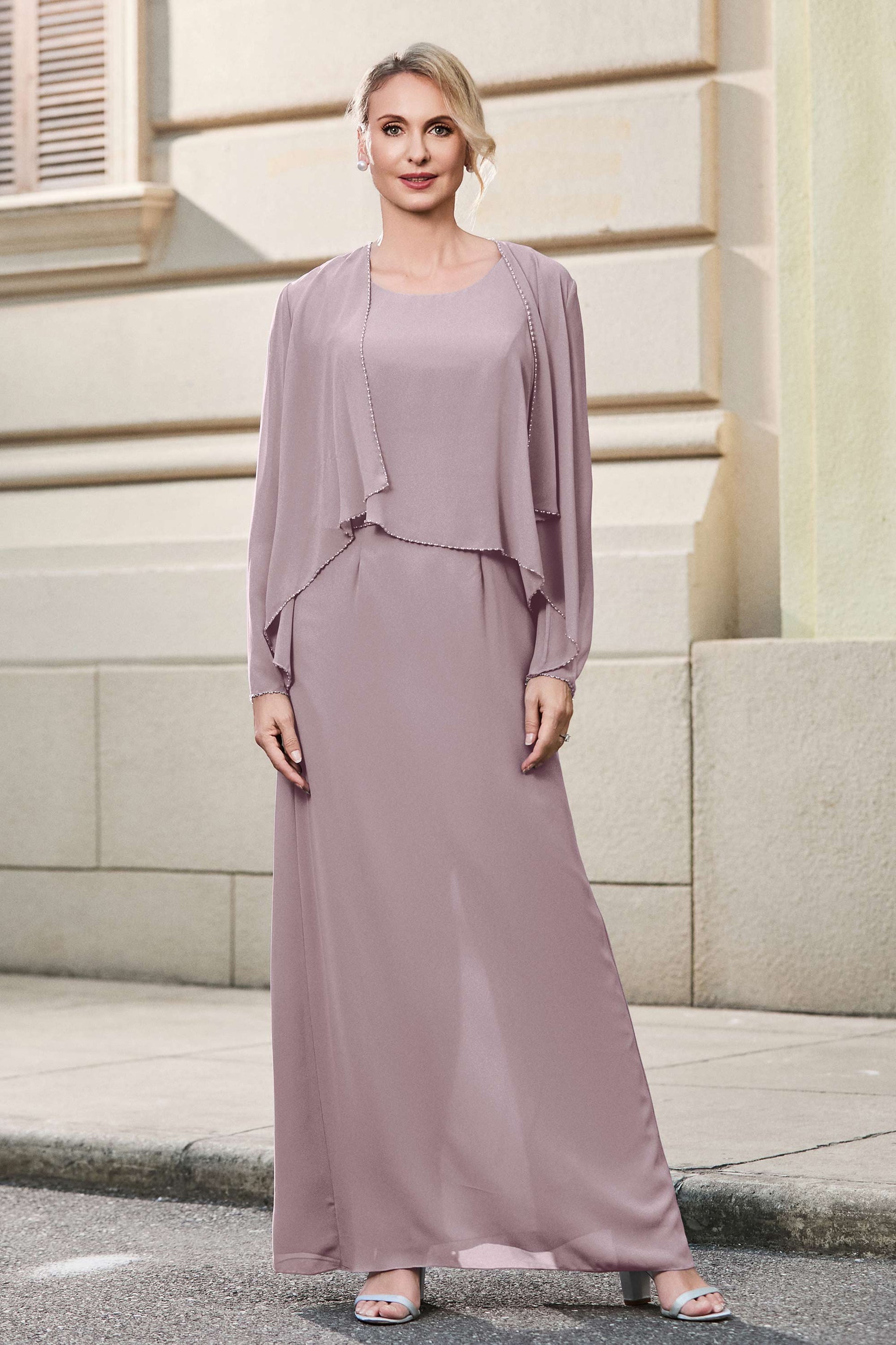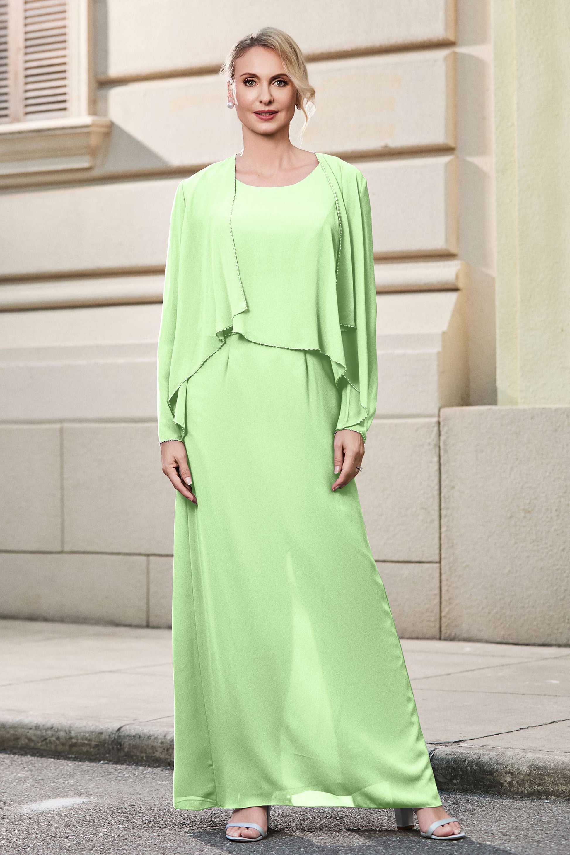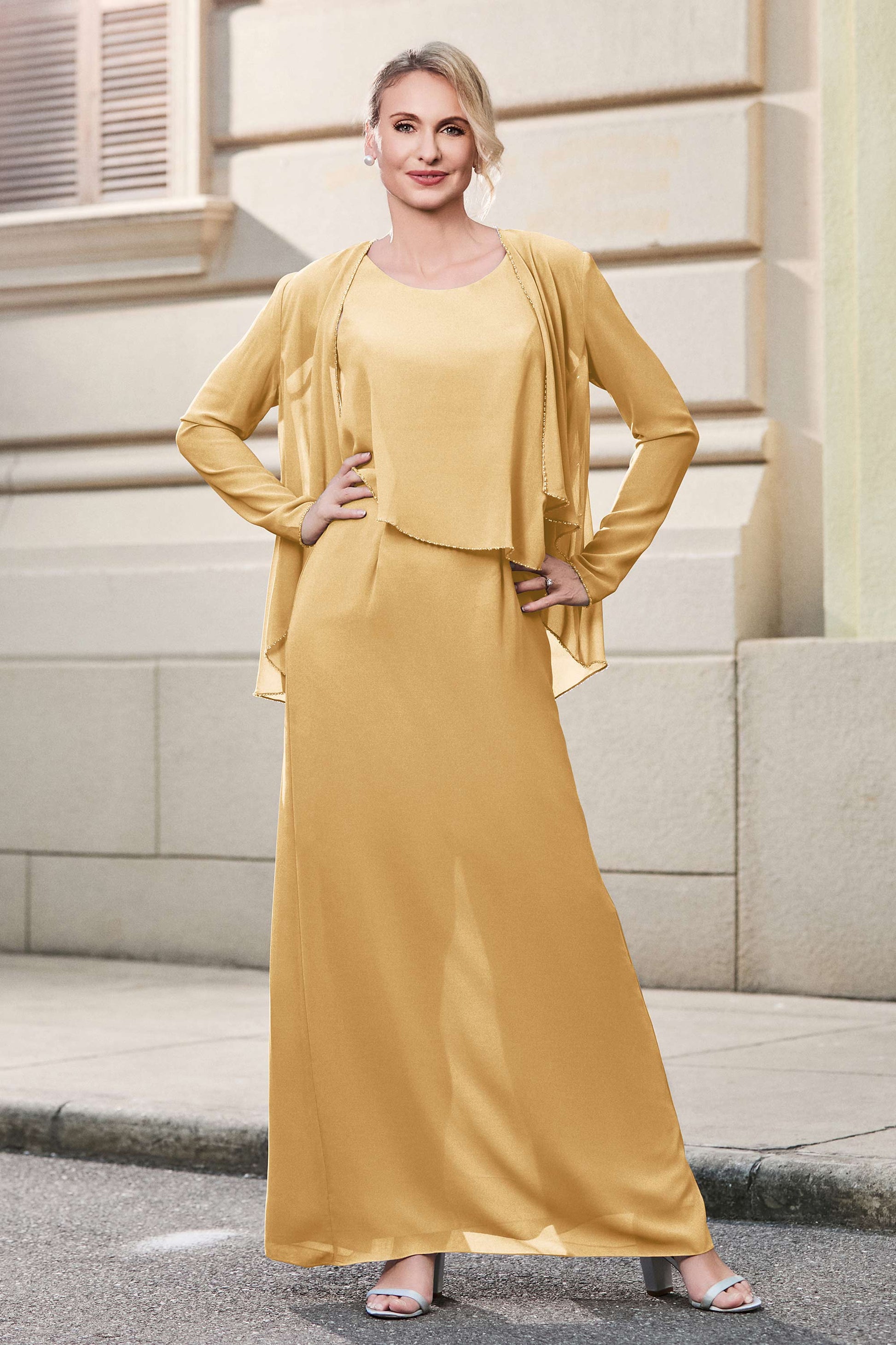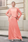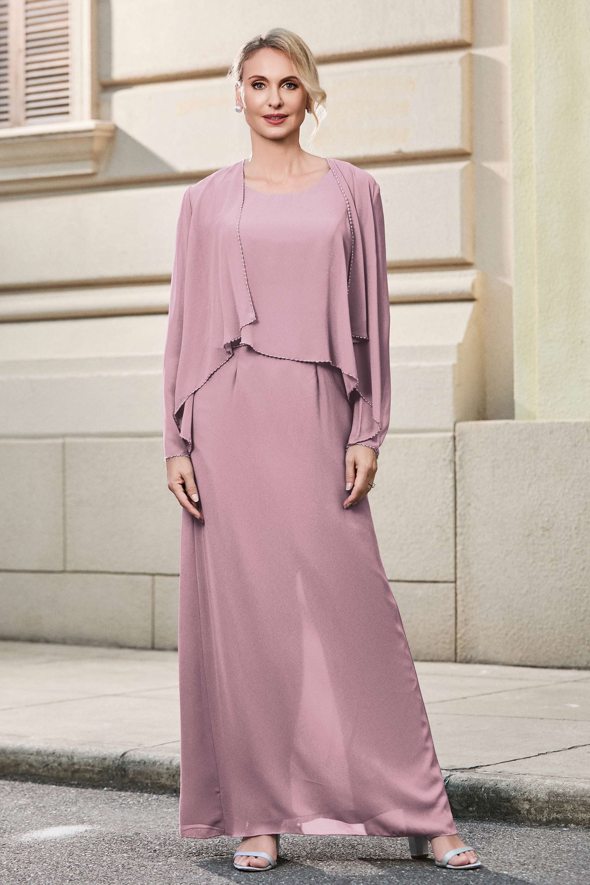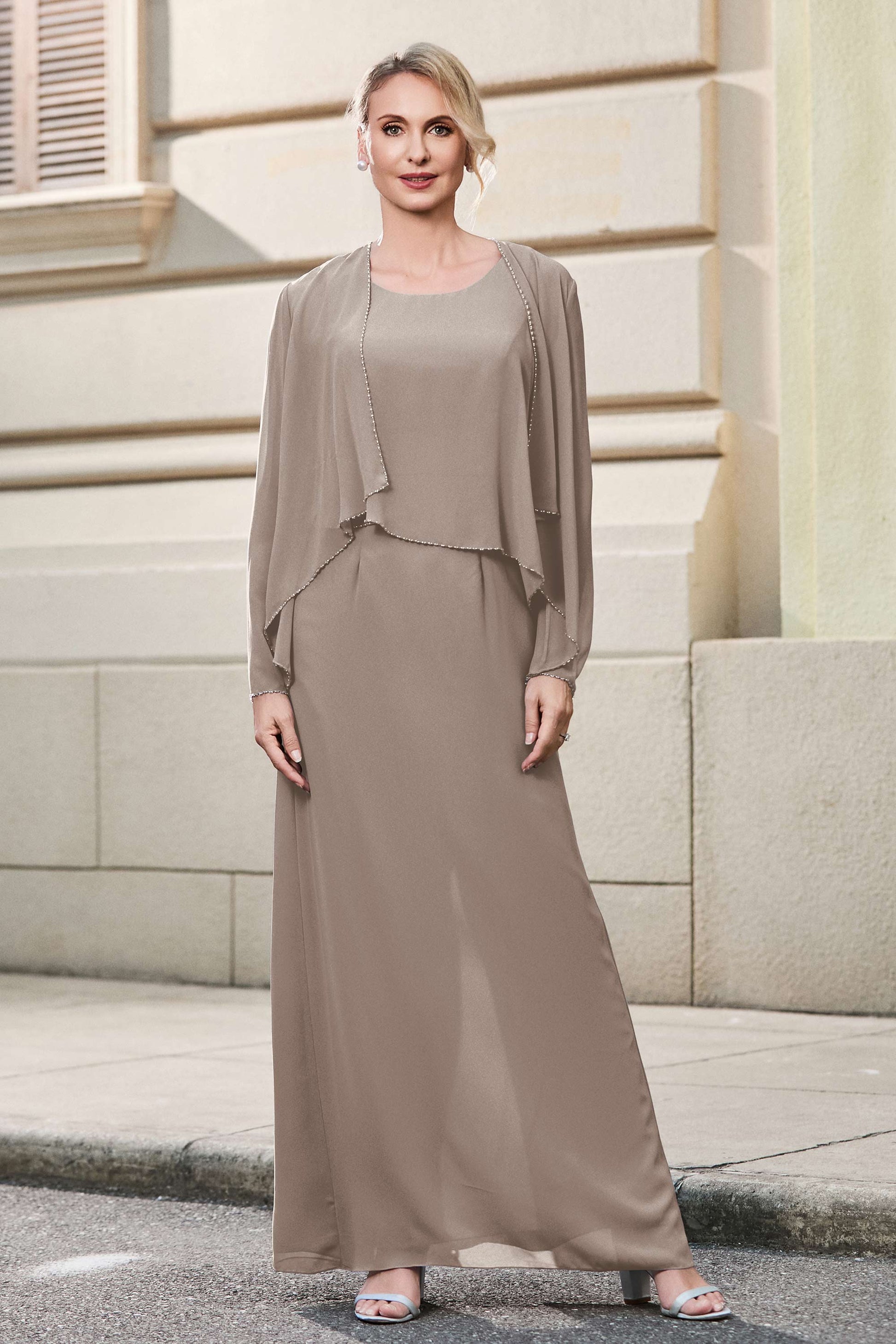 This dress offers an effortlessly chic and sophisticated look. The scoop neckline adds a flattering touch, while the back slit provides a modern, daring twist. Paired with a matching jacket, this dress is perfect for those who seek elegance with a hint of contemporary style.