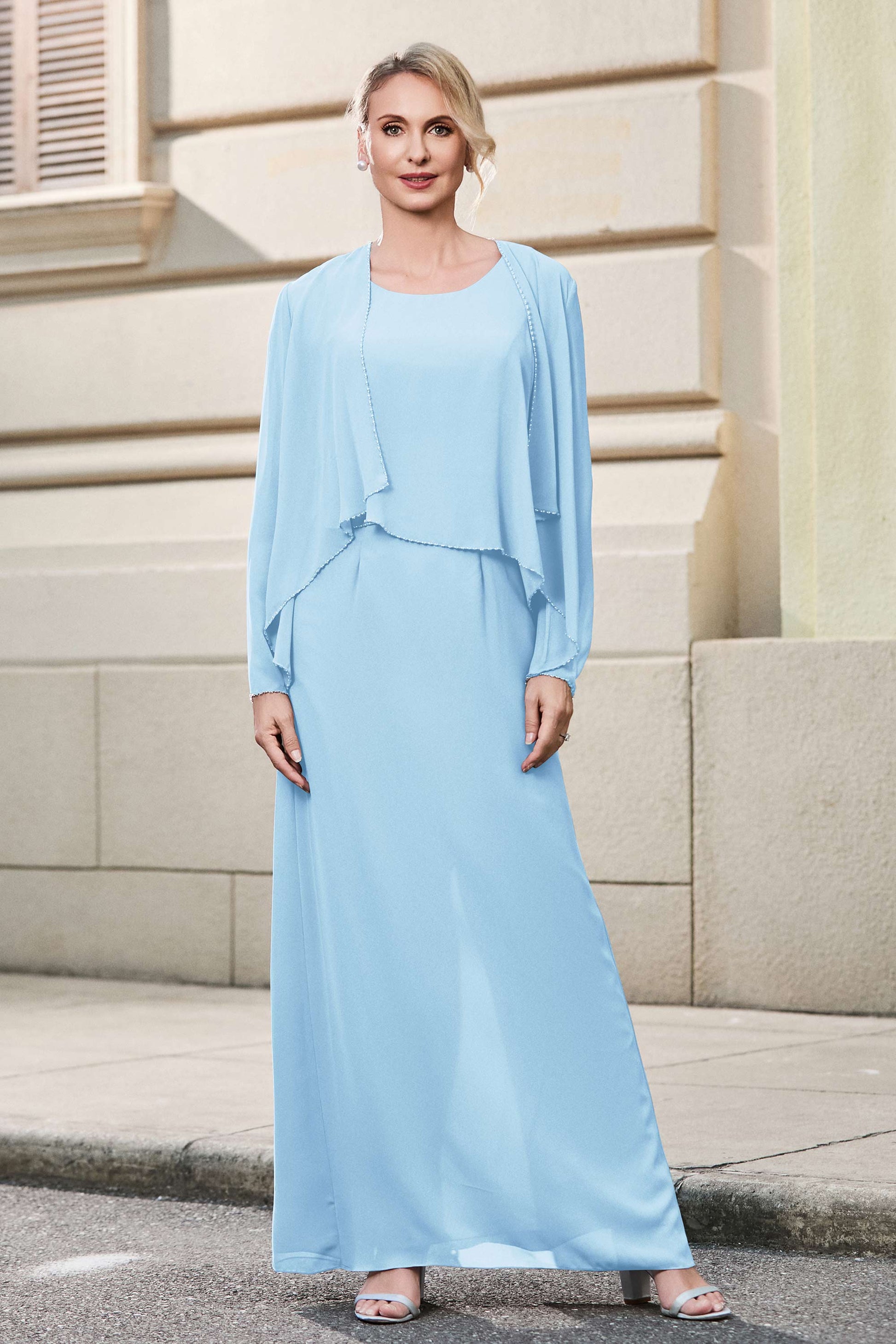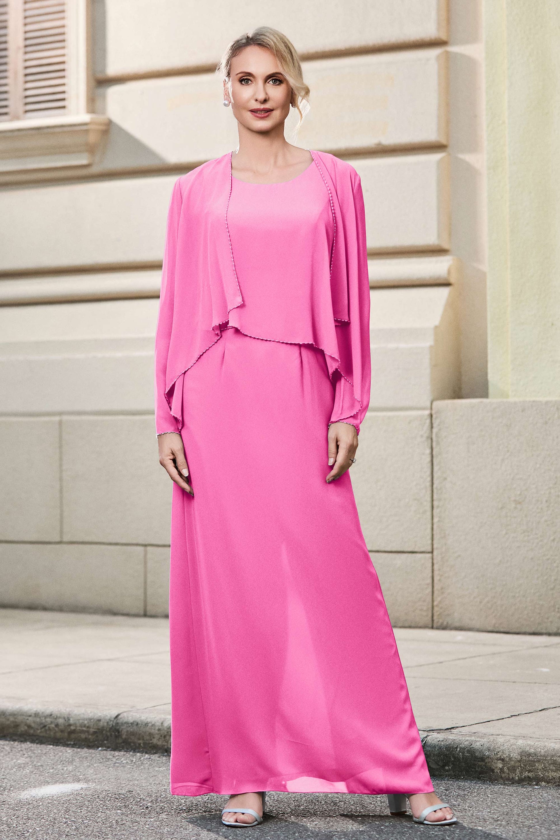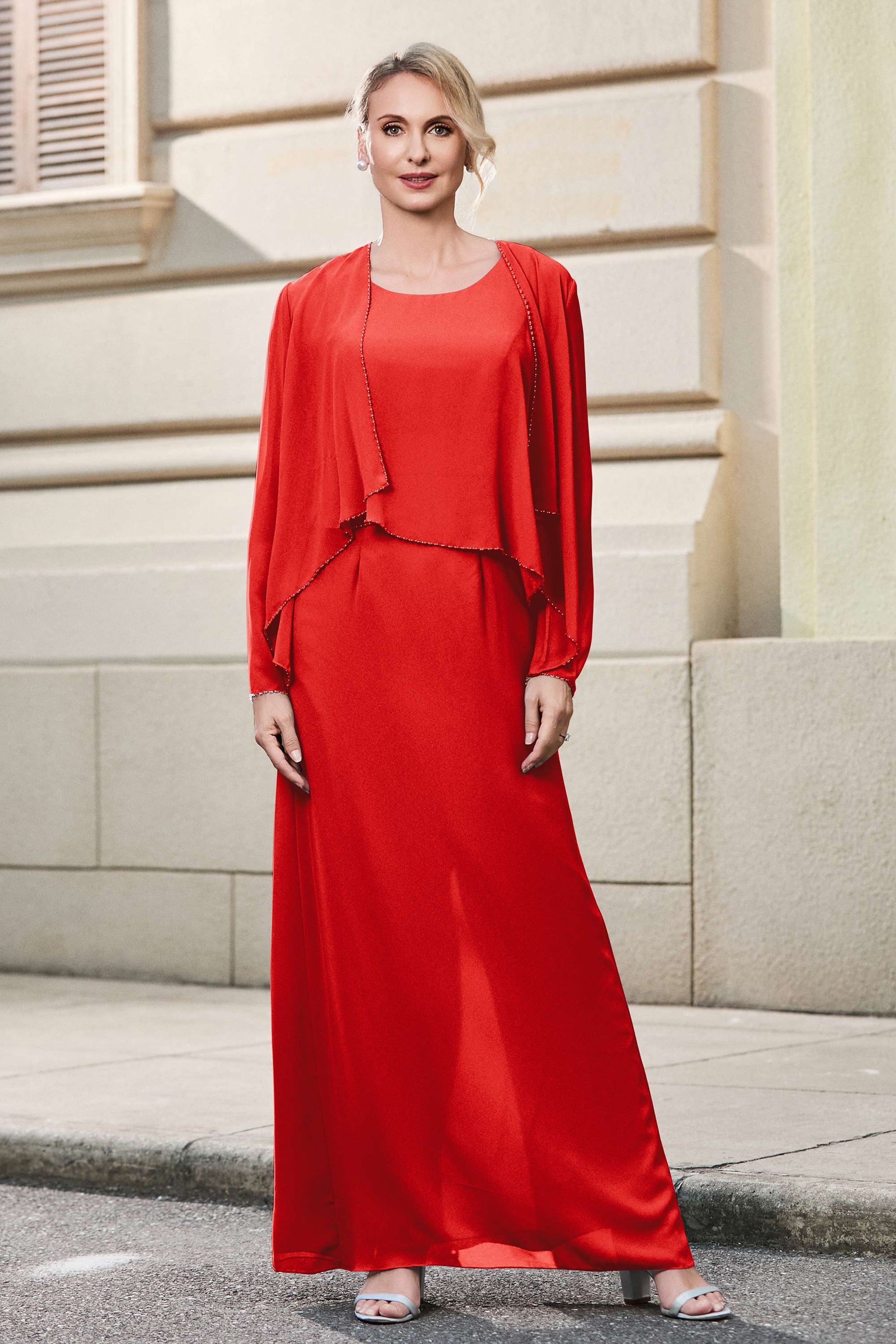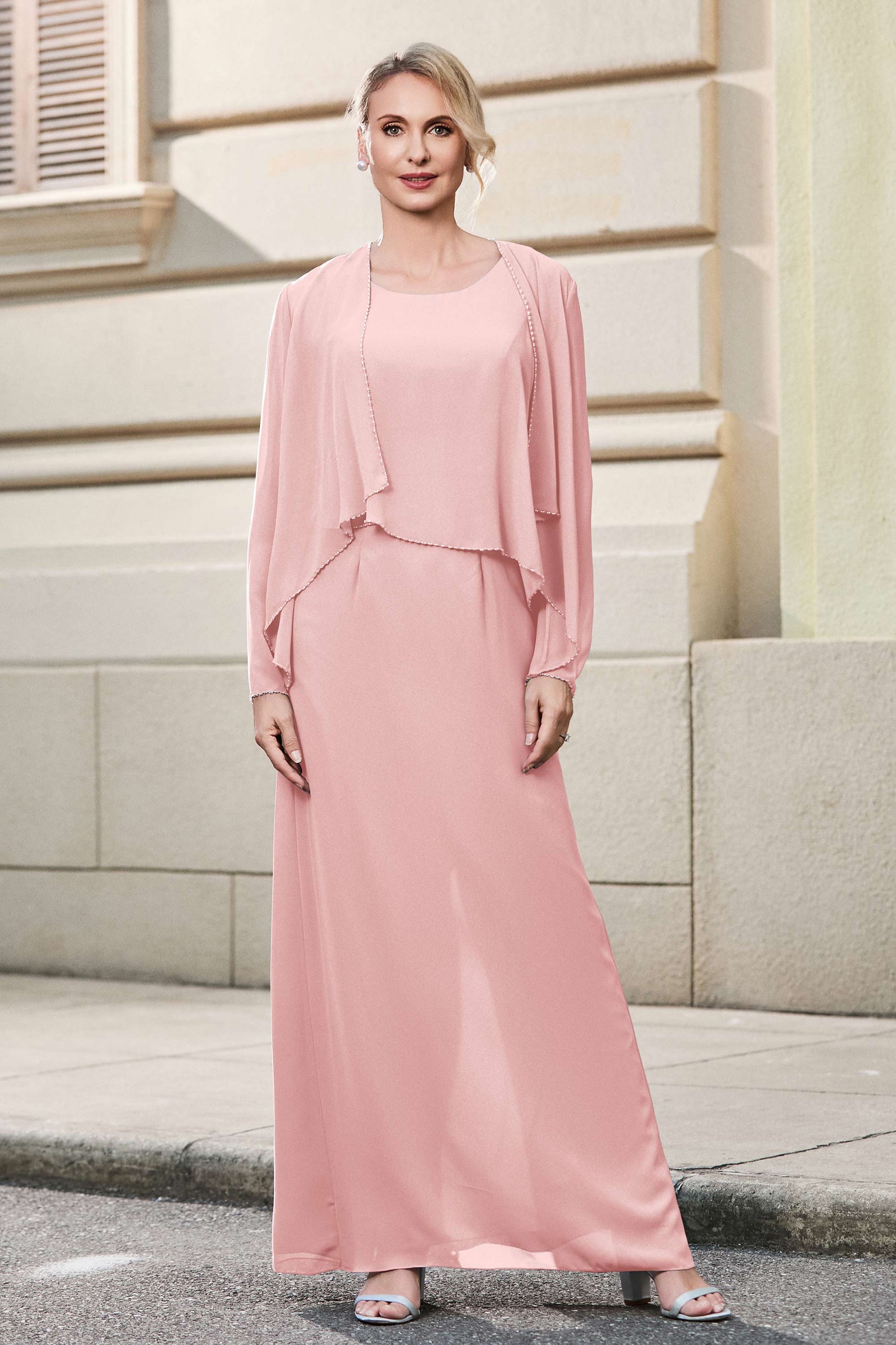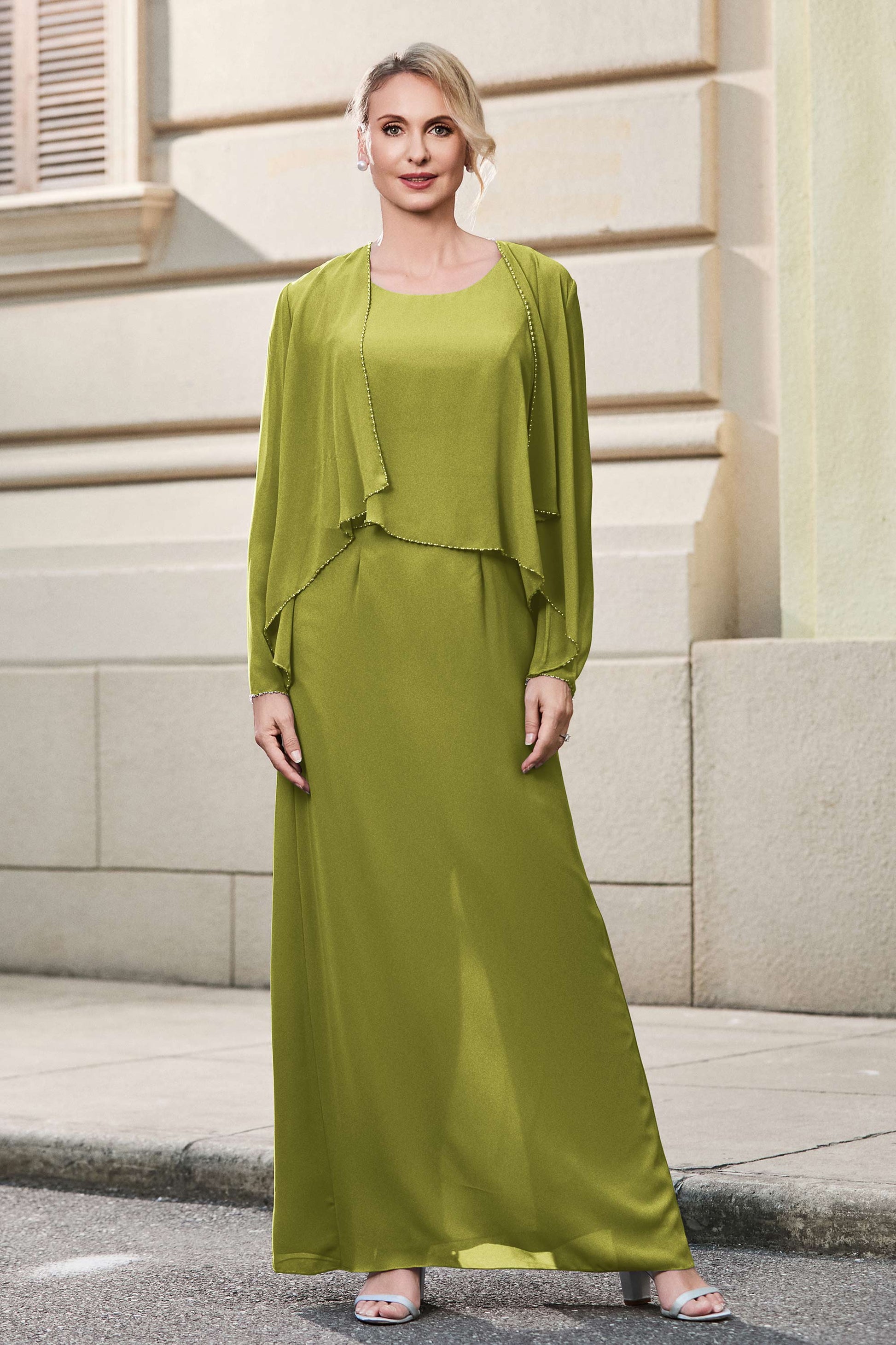 This dress offers an effortlessly chic and sophisticated look. The scoop neckline adds a flattering touch, while the back slit provides a modern, daring twist. Paired with a matching jacket, this dress is perfect for those who seek elegance with a hint of contemporary style.