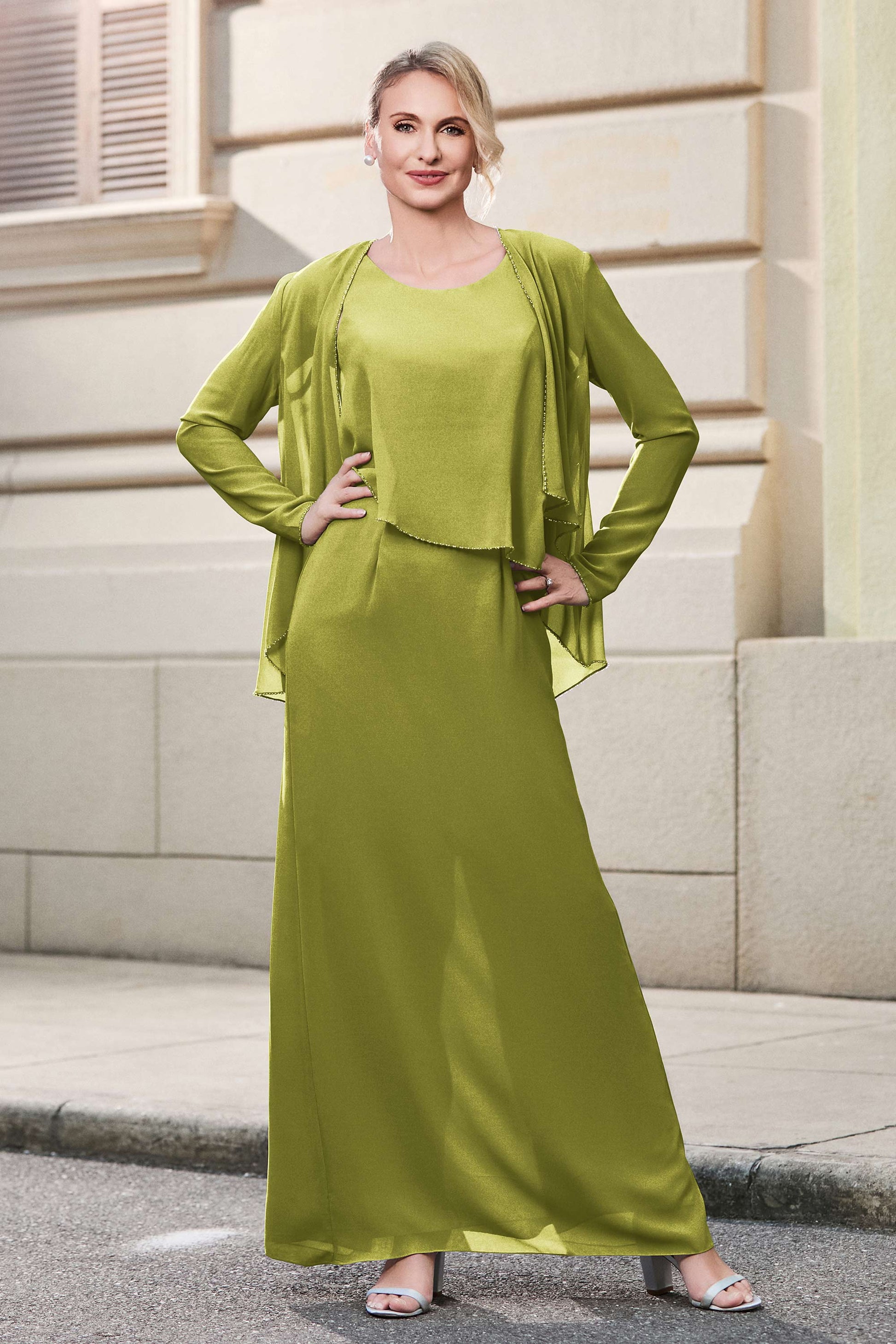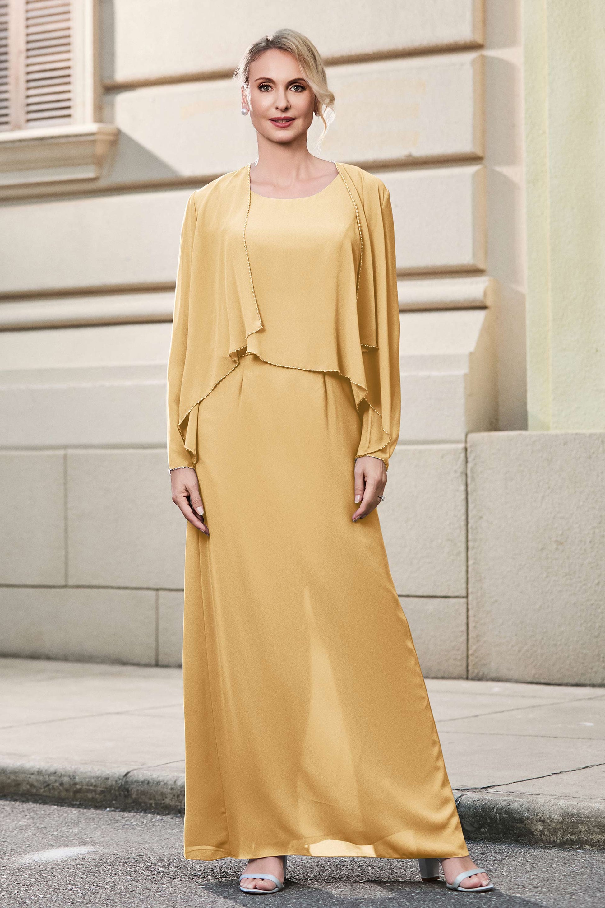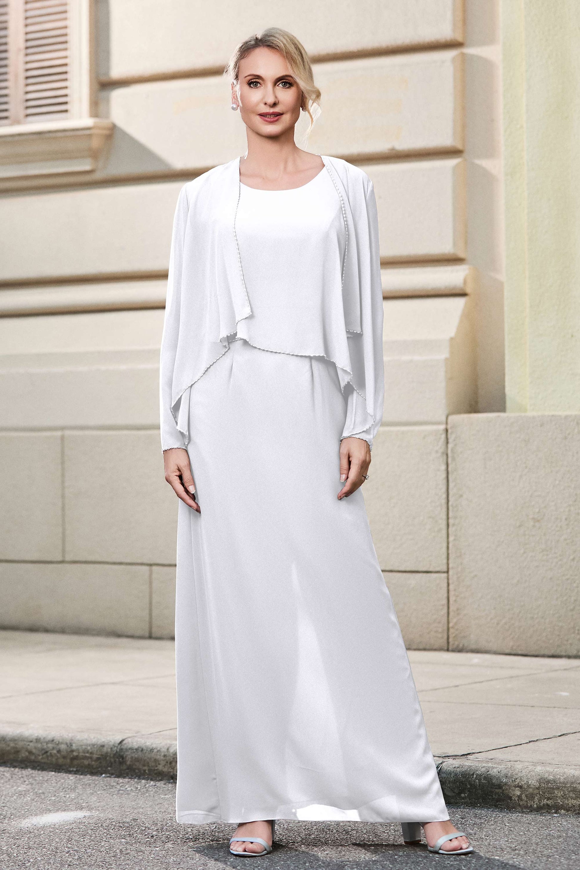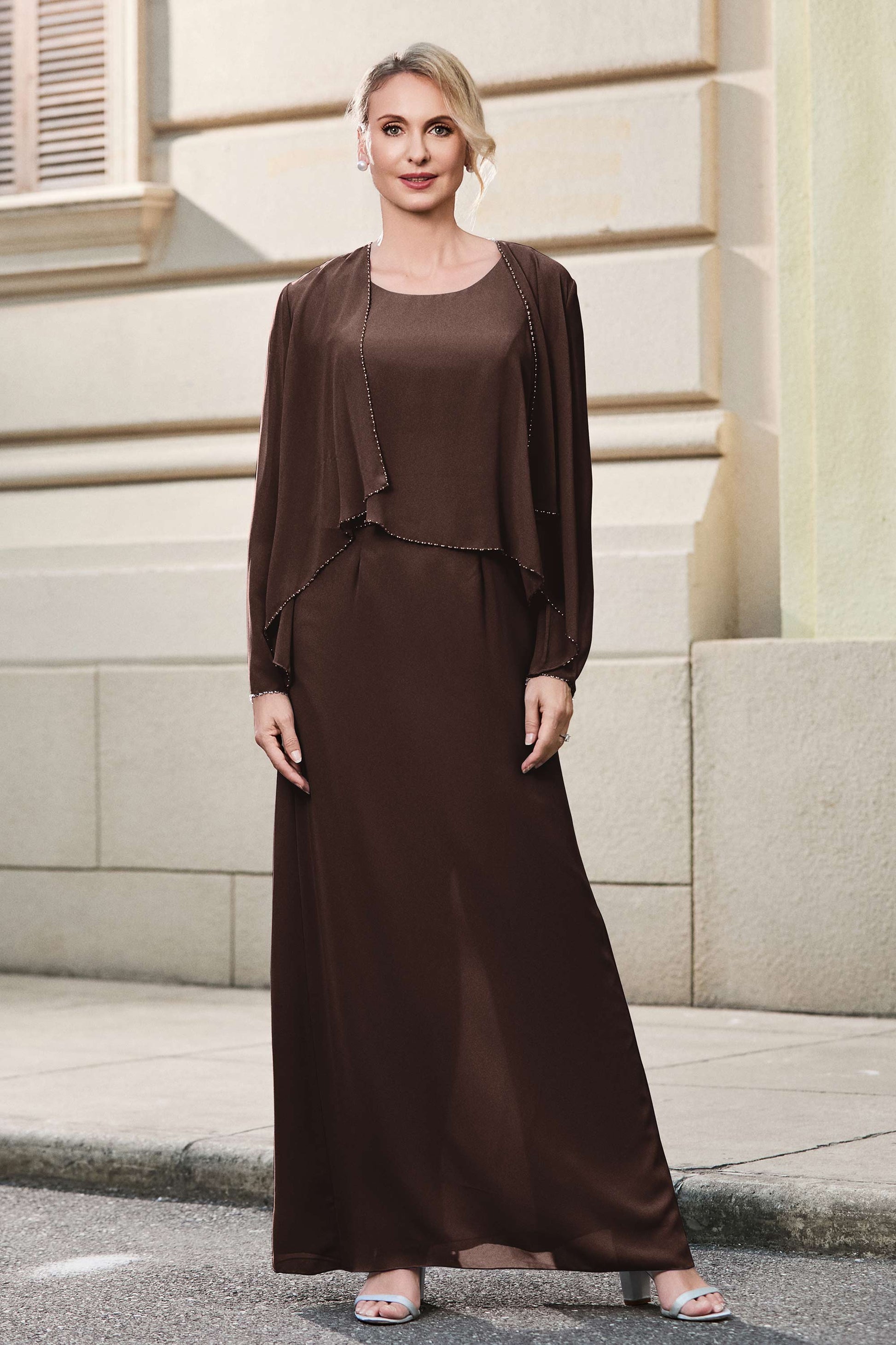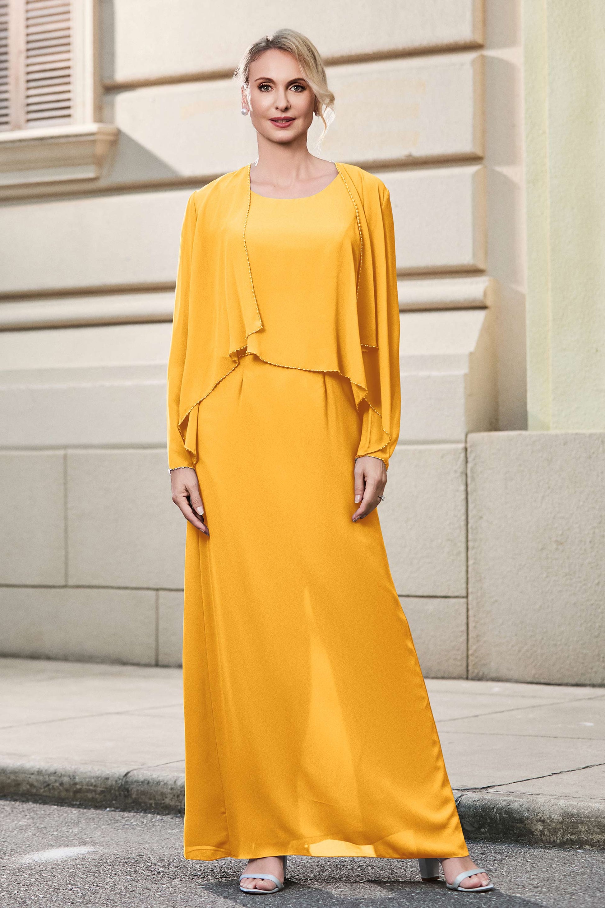 This dress offers an effortlessly chic and sophisticated look. The scoop neckline adds a flattering touch, while the back slit provides a modern, daring twist. Paired with a matching jacket, this dress is perfect for those who seek elegance with a hint of contemporary style.