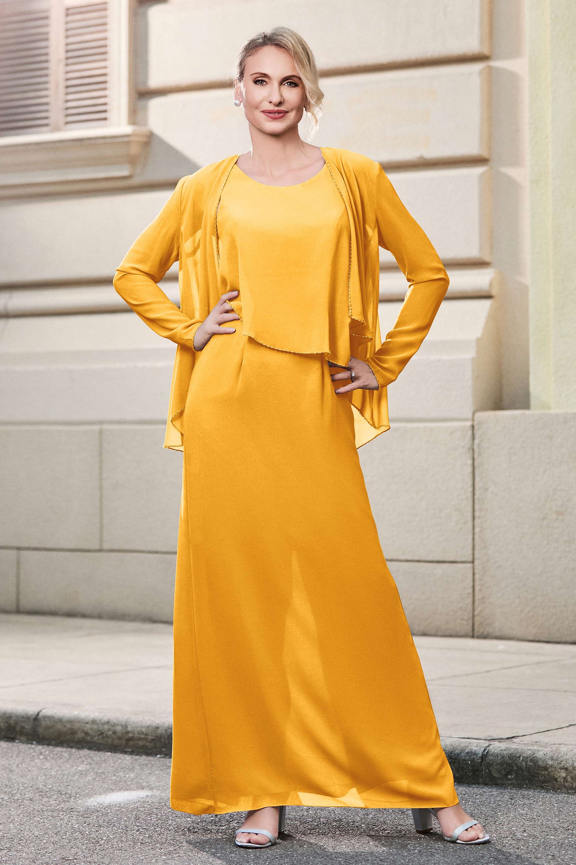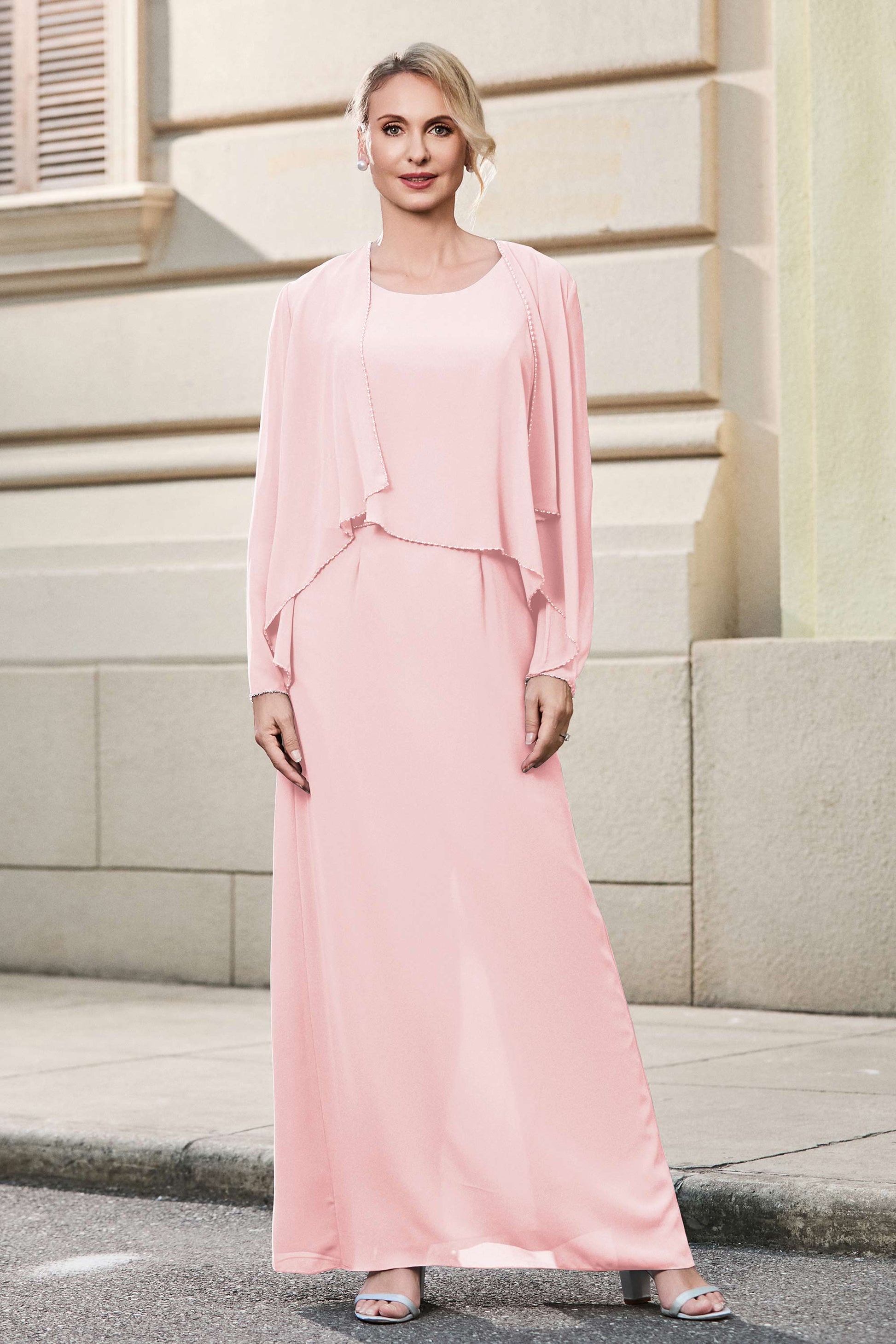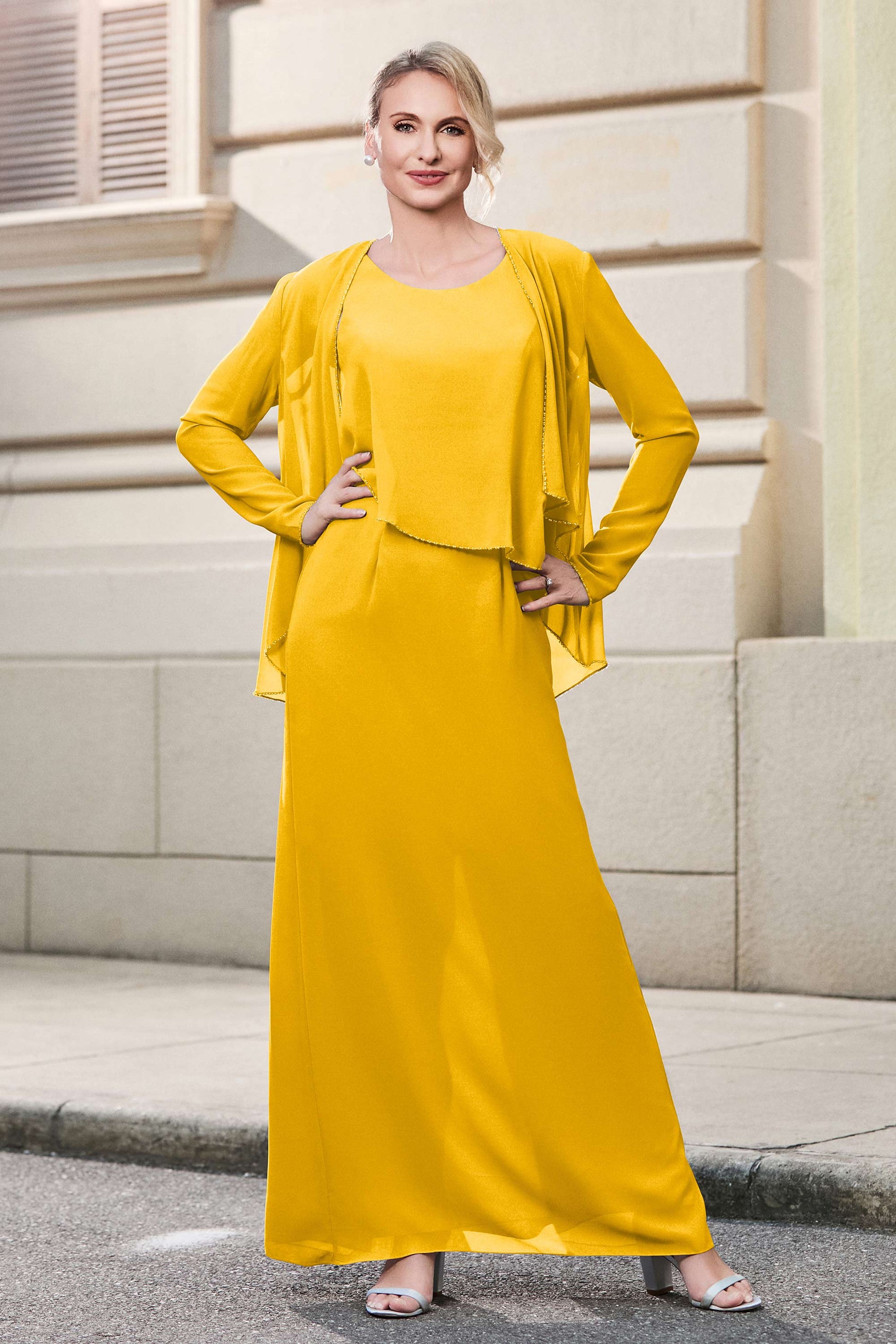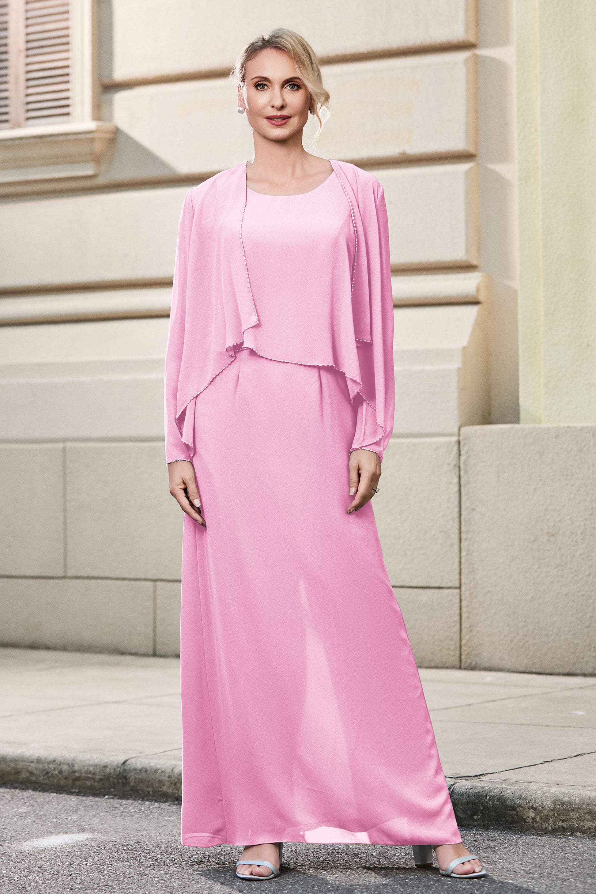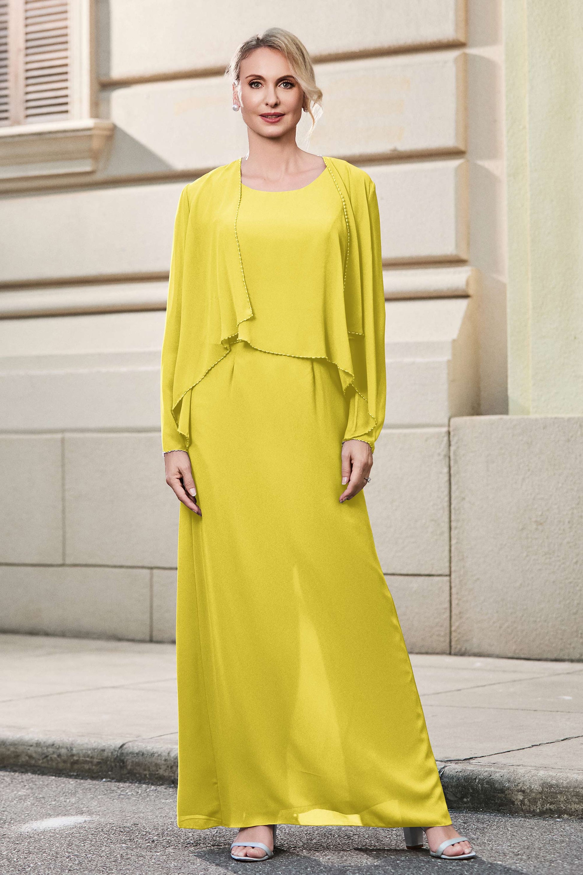 This dress offers an effortlessly chic and sophisticated look. The scoop neckline adds a flattering touch, while the back slit provides a modern, daring twist. Paired with a matching jacket, this dress is perfect for those who seek elegance with a hint of contemporary style.