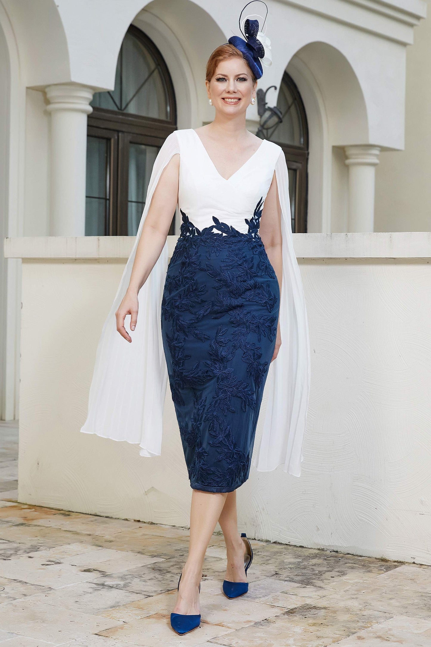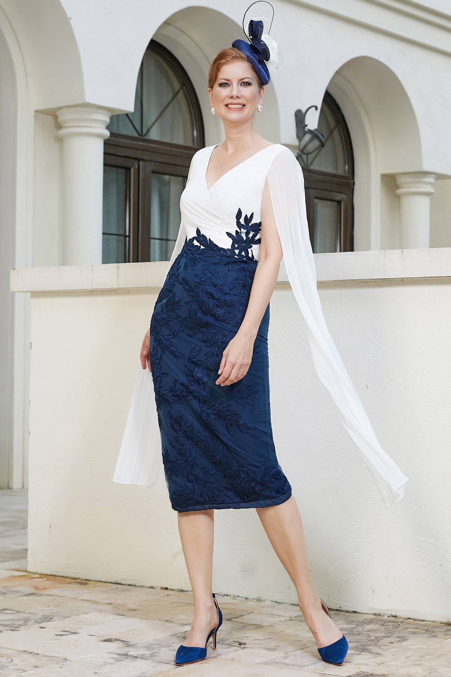 Defined by its V-neckline, complemented by flutter sleeves, and adorned with intricate applique detailing from the waist down to the skirt, this sheath gown is a wonderful choice for weddings, parties, and various special occasions. The clutch and jewelry held by the model are not included.