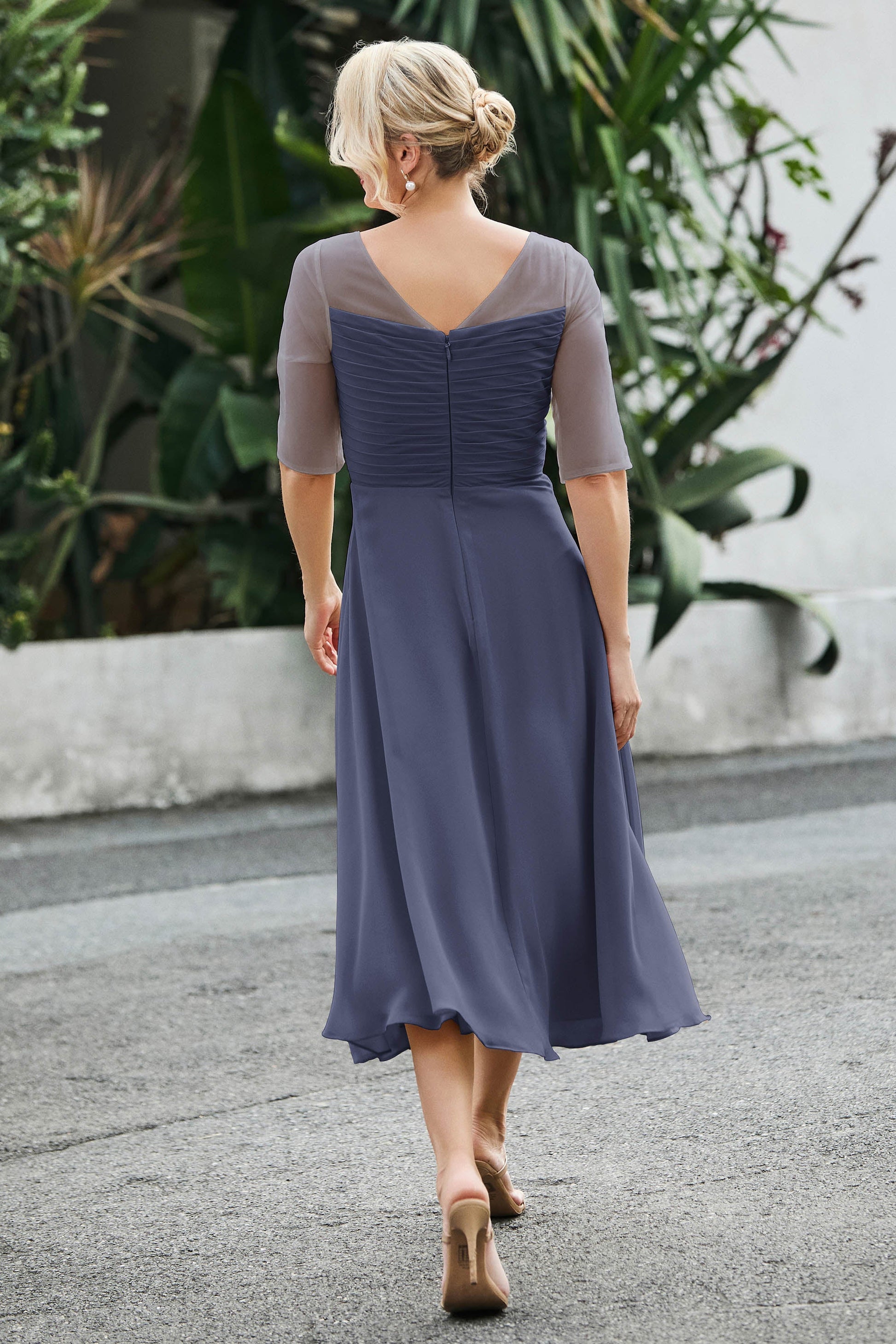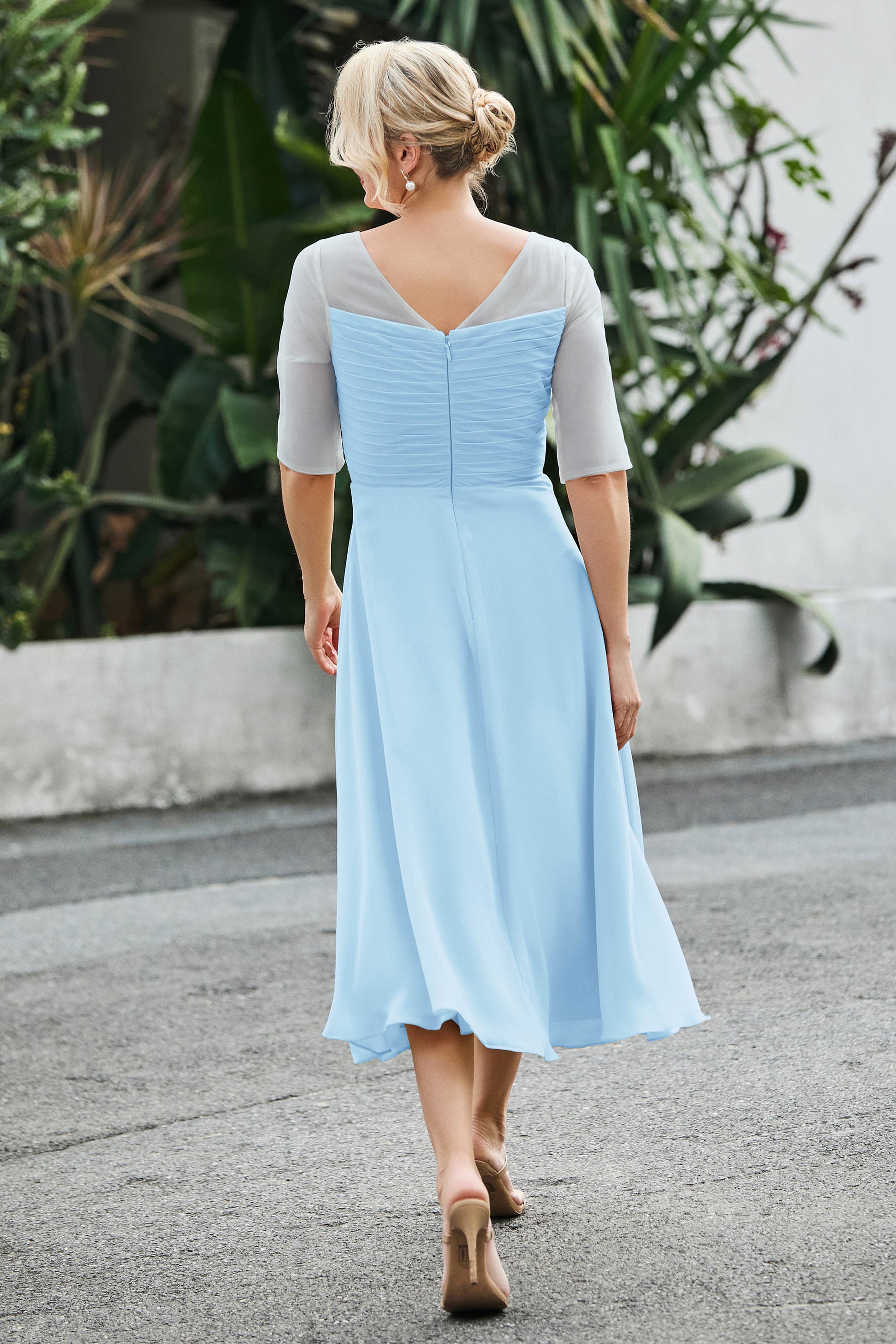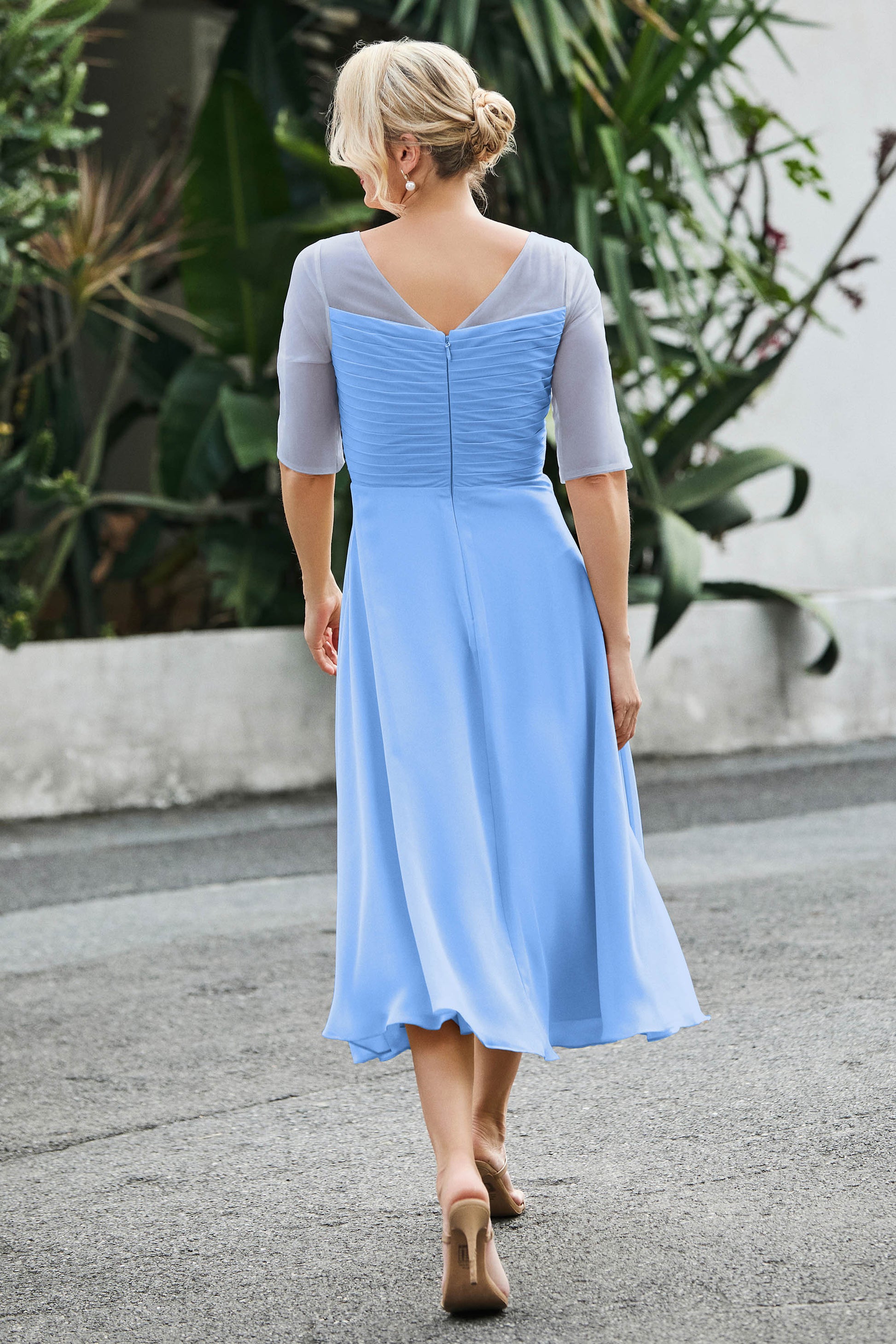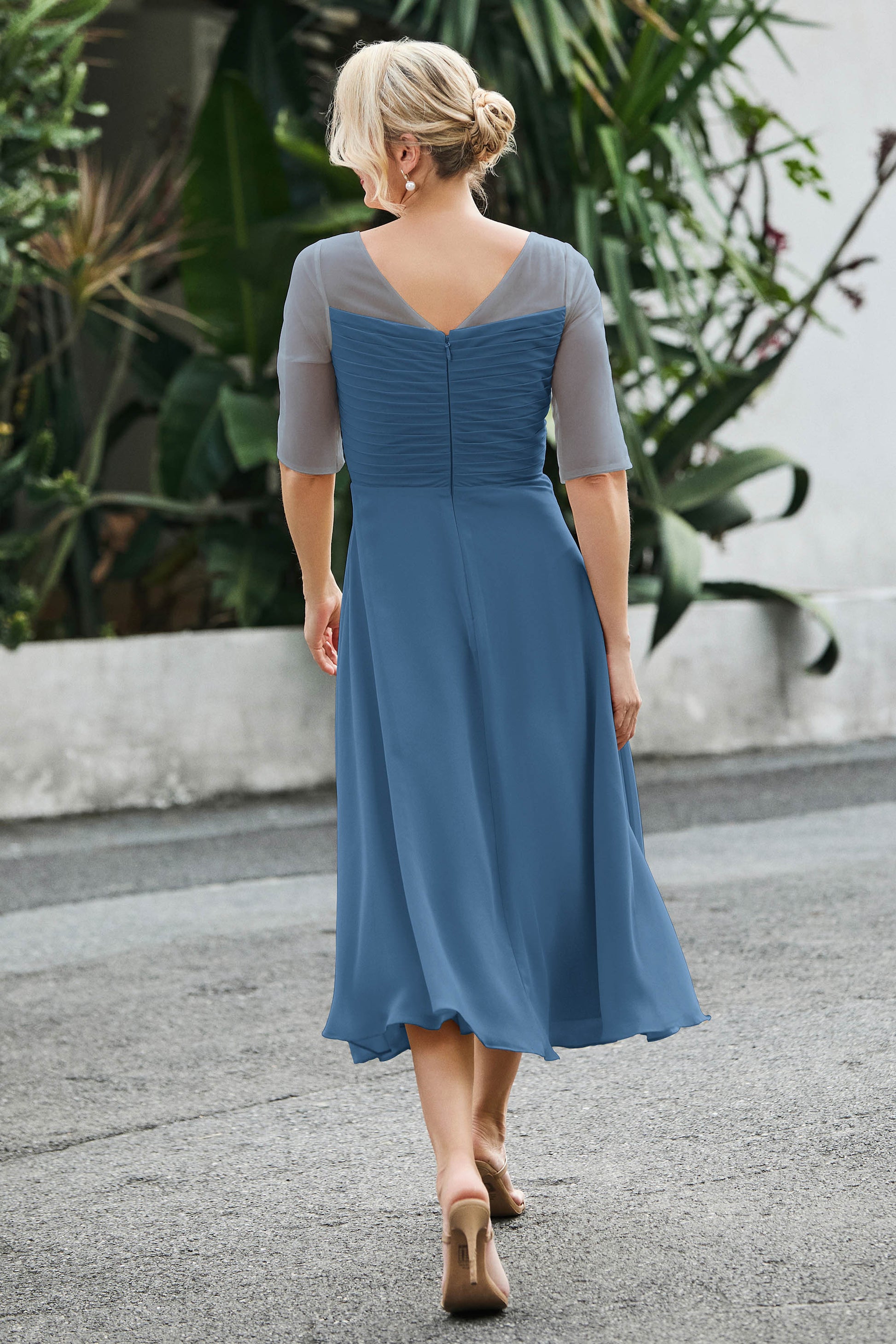 Designed with an a-line silhouette, it features a delicate illusion neckline and half sleeves for a refined look. The natural waistline is accentuated with subtle pleating, adding graceful detail. A back zipper ensures a seamless fit, while the tea-length hem offers versatile sophistication for various occasions.