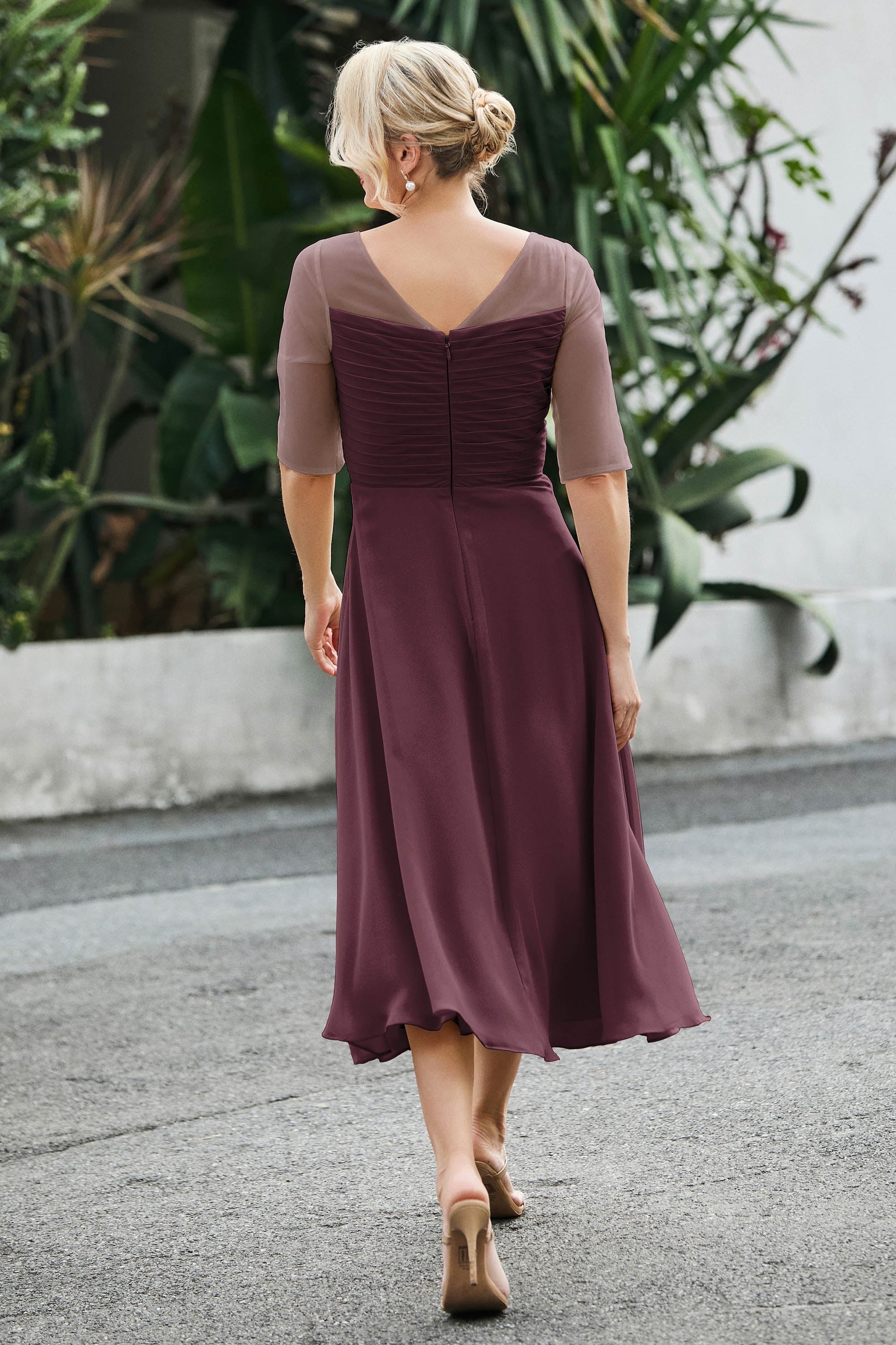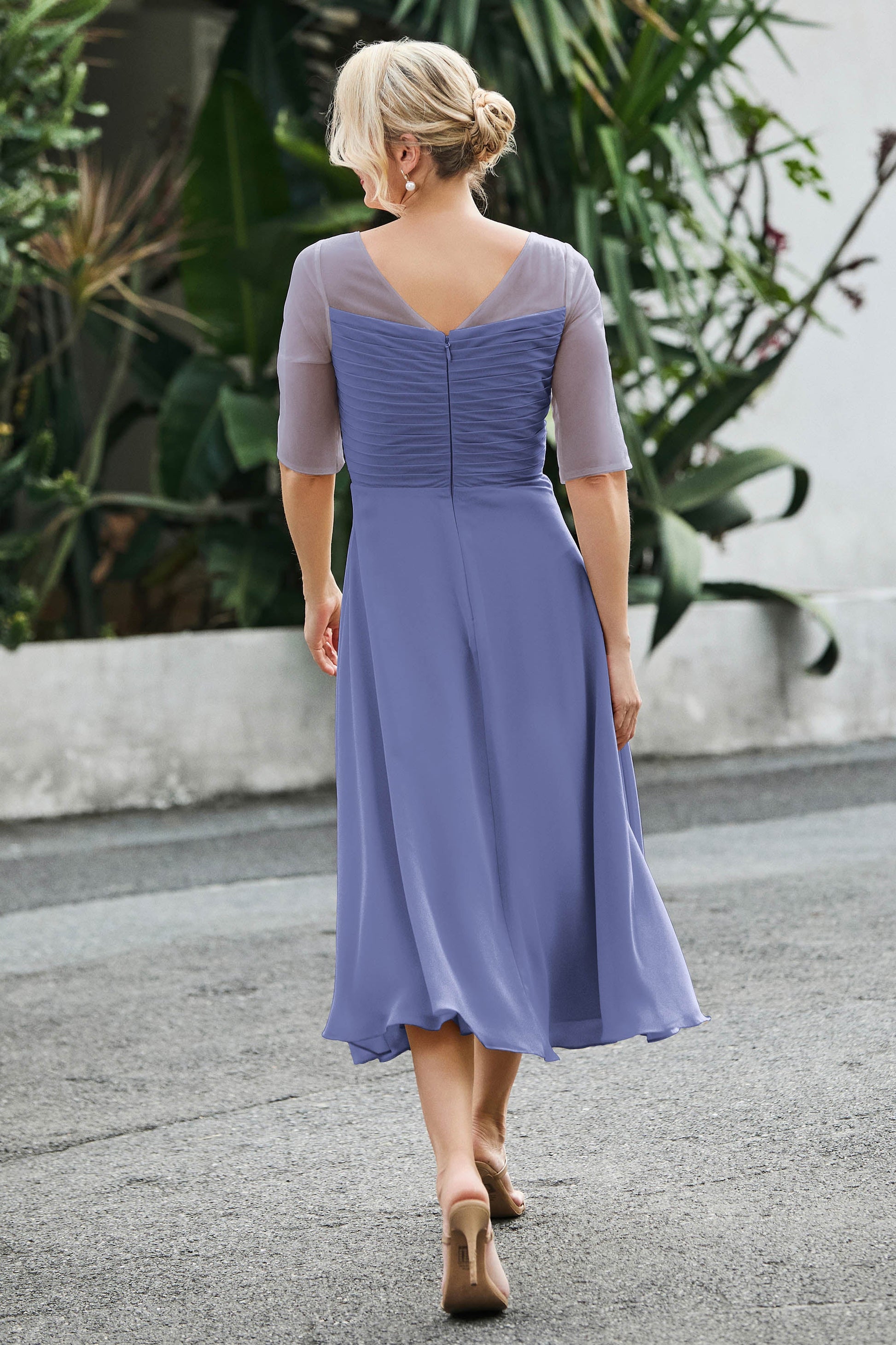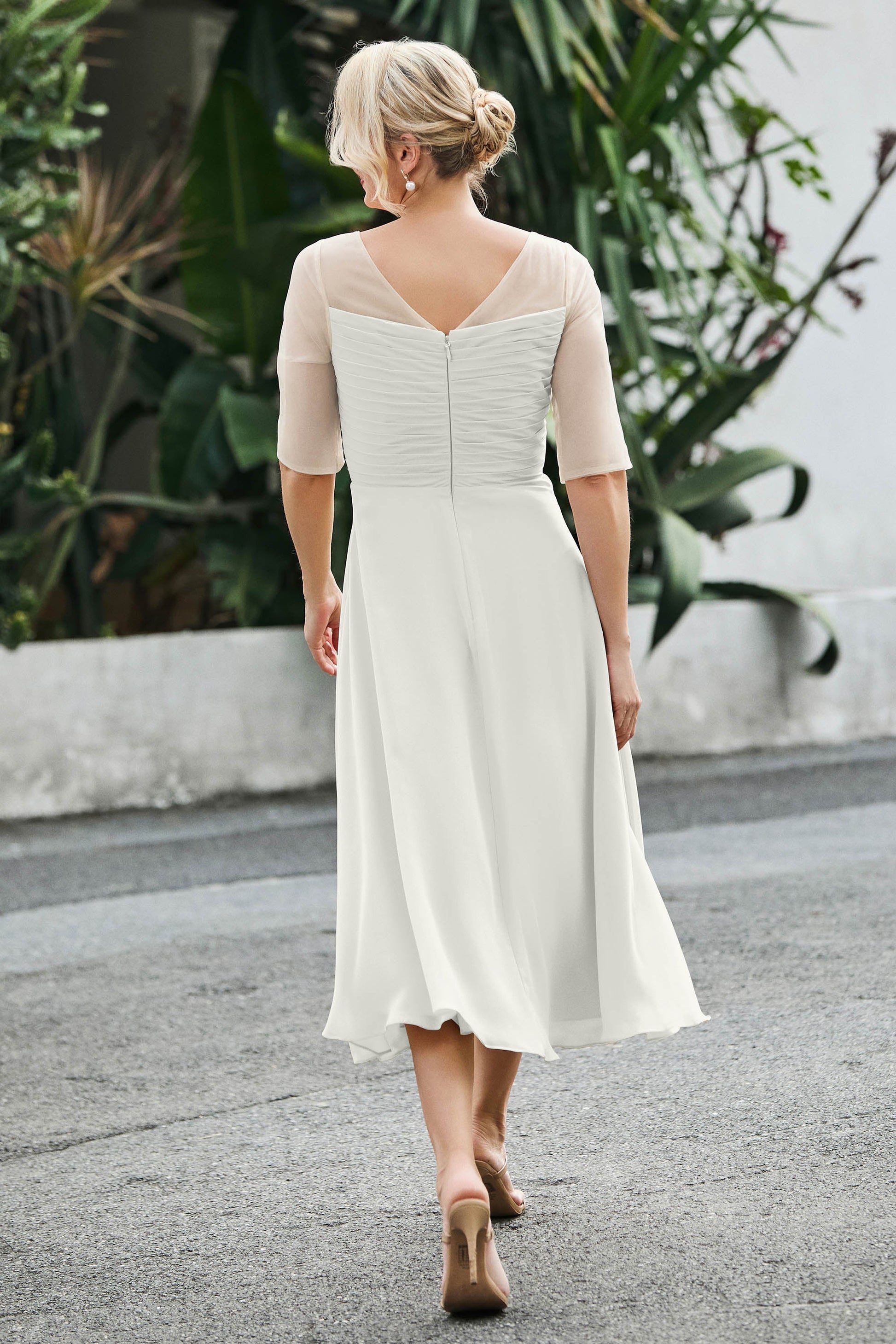 Designed with an a-line silhouette, it features a delicate illusion neckline and half sleeves for a refined look. The natural waistline is accentuated with subtle pleating, adding graceful detail. A back zipper ensures a seamless fit, while the tea-length hem offers versatile sophistication for various occasions.