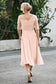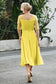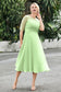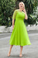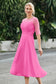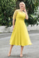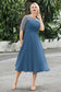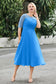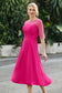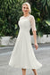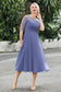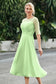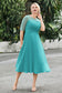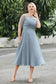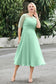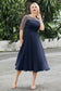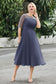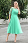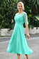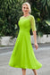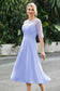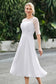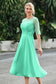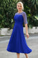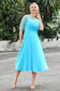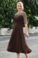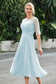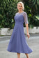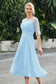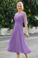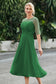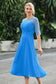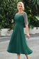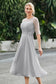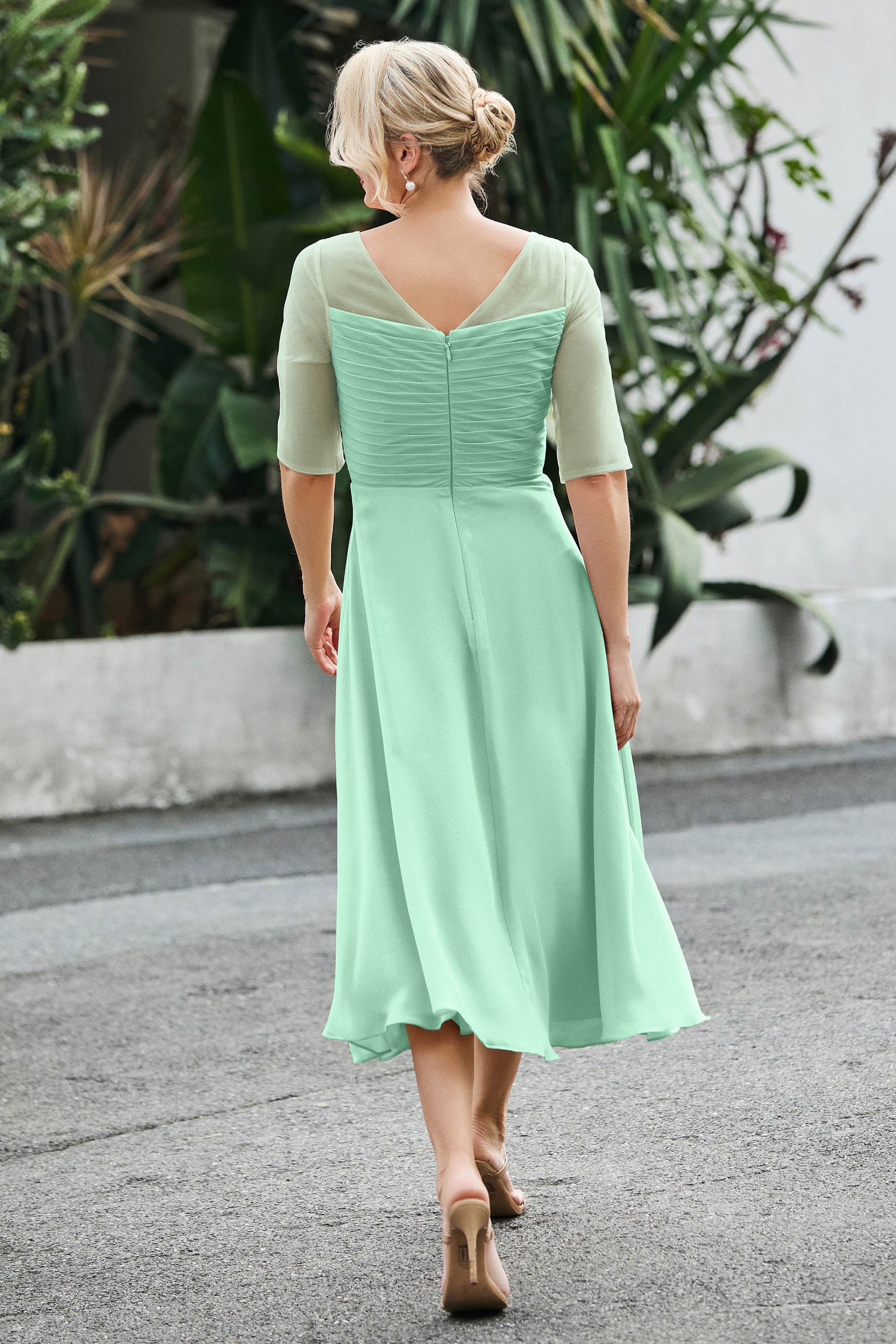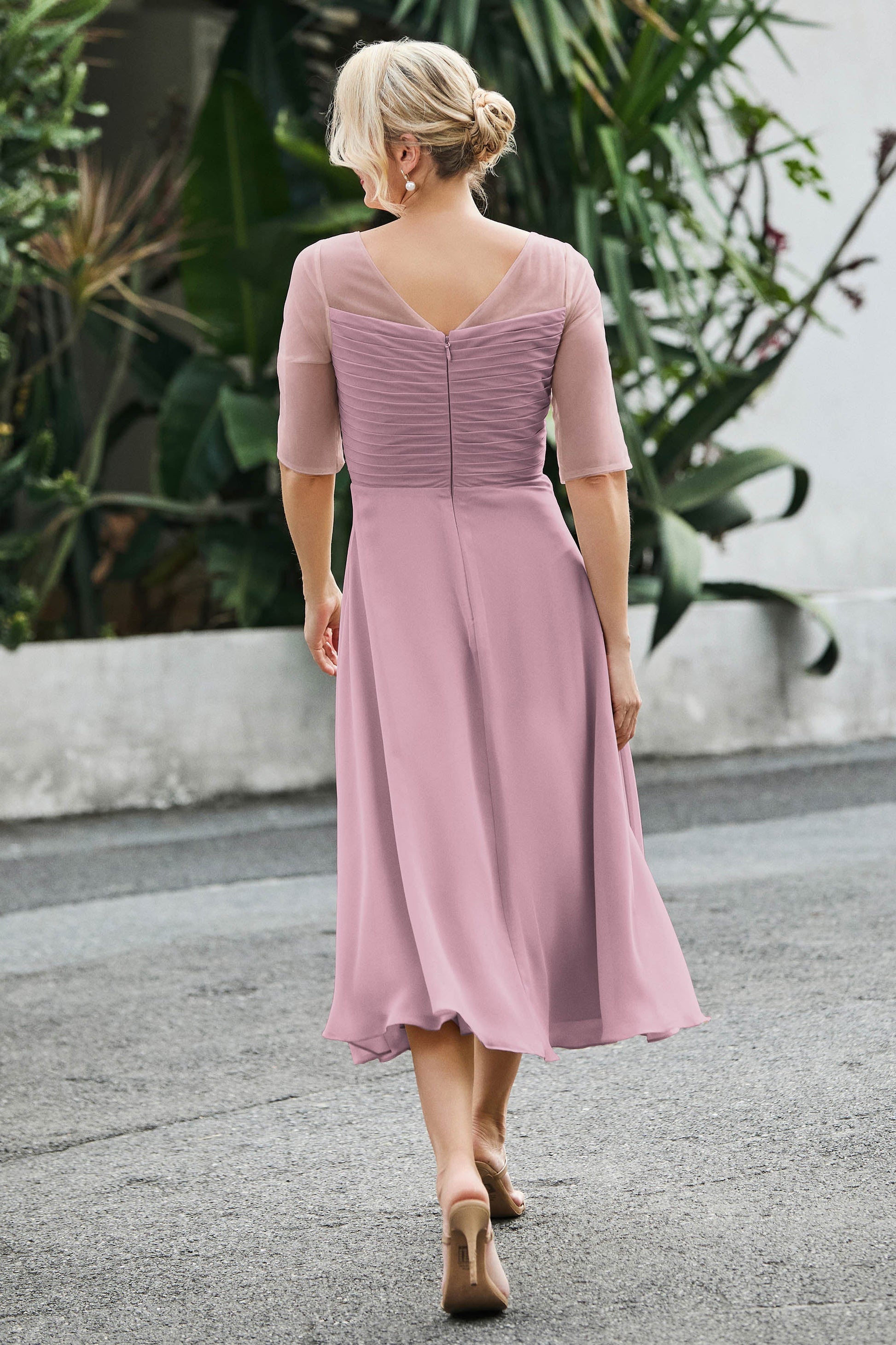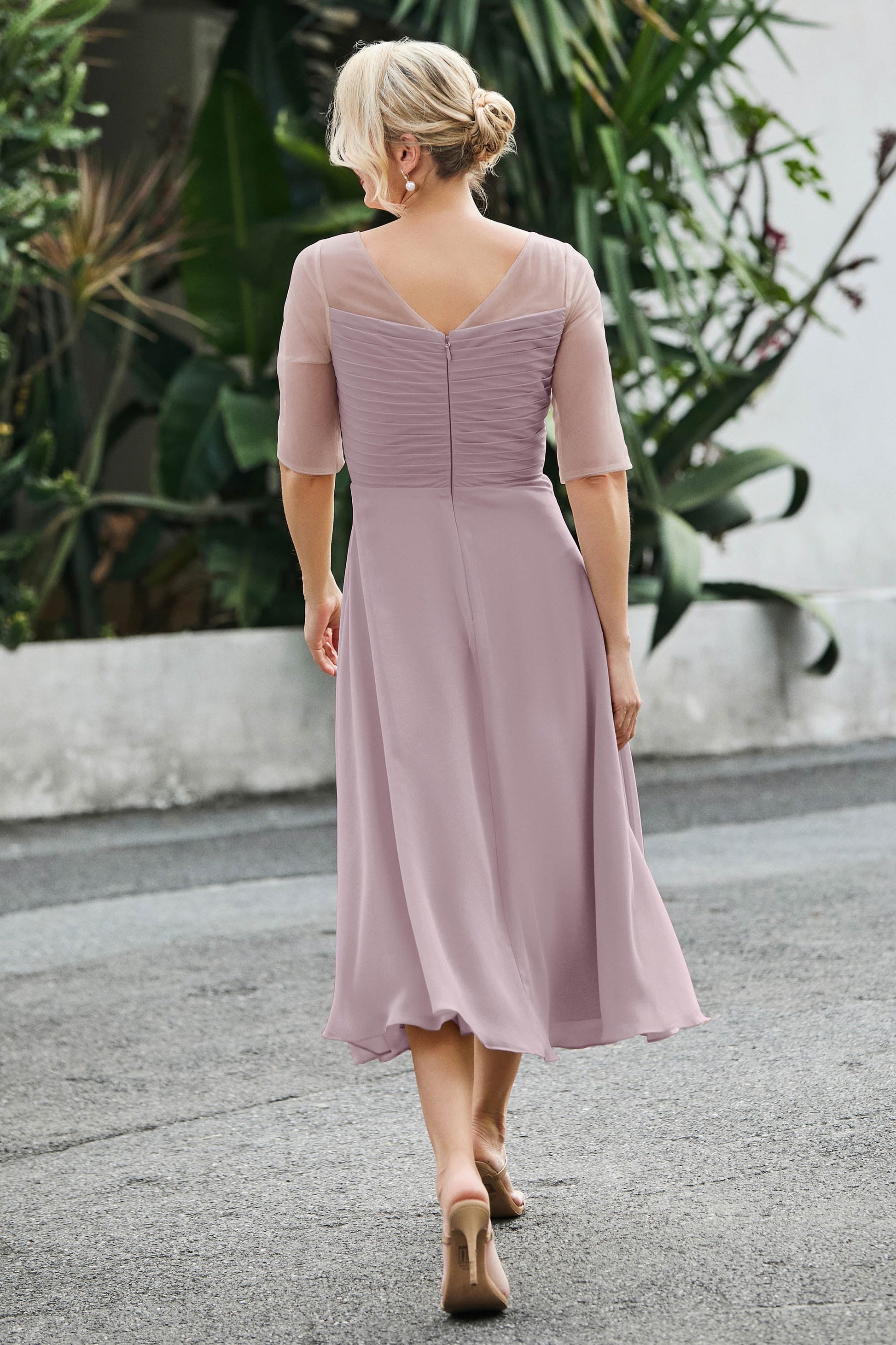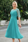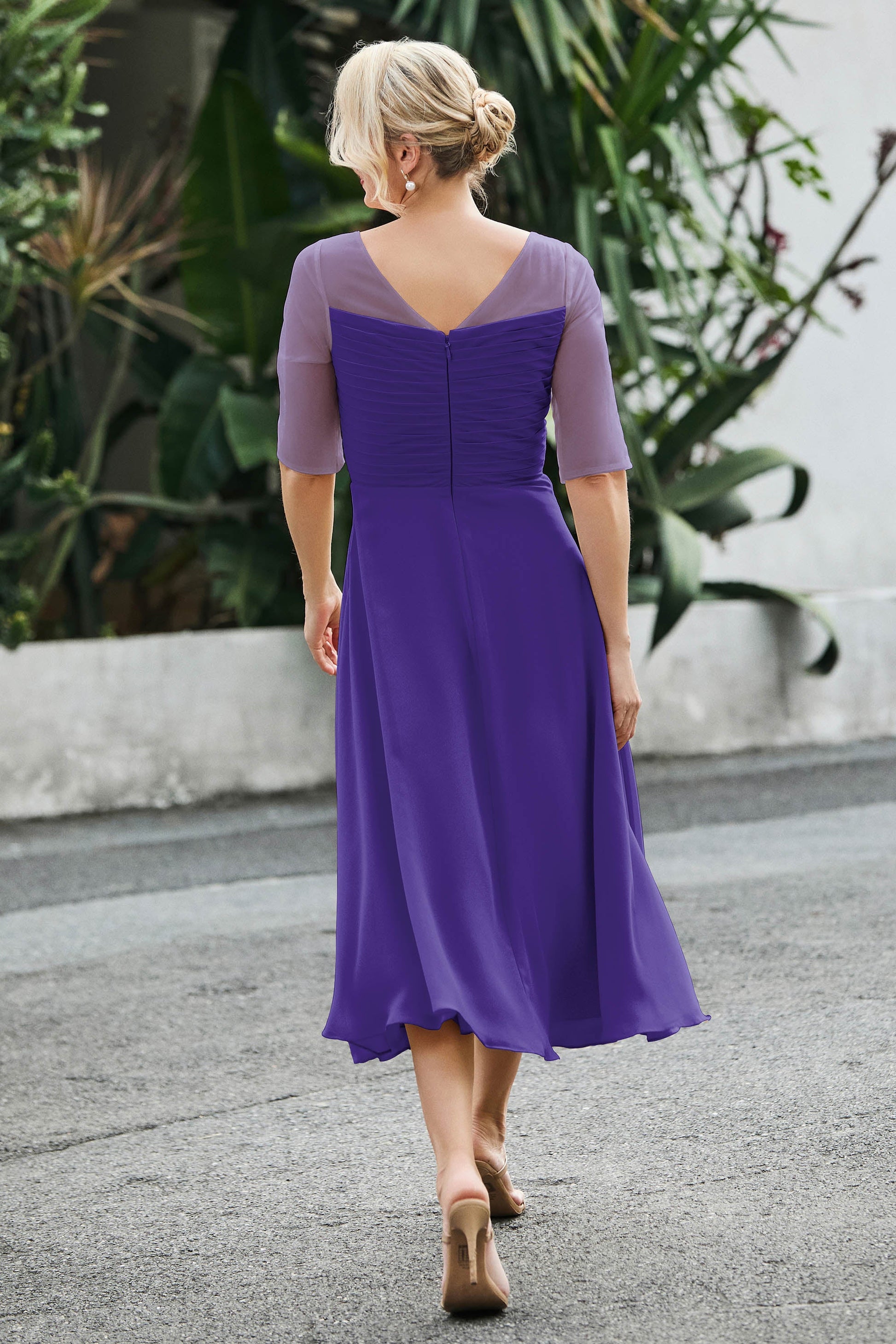Designed with an a-line silhouette, it features a delicate illusion neckline and half sleeves for a refined look. The natural waistline is accentuated with subtle pleating, adding graceful detail. A back zipper ensures a seamless fit, while the tea-length hem offers versatile sophistication for various occasions.