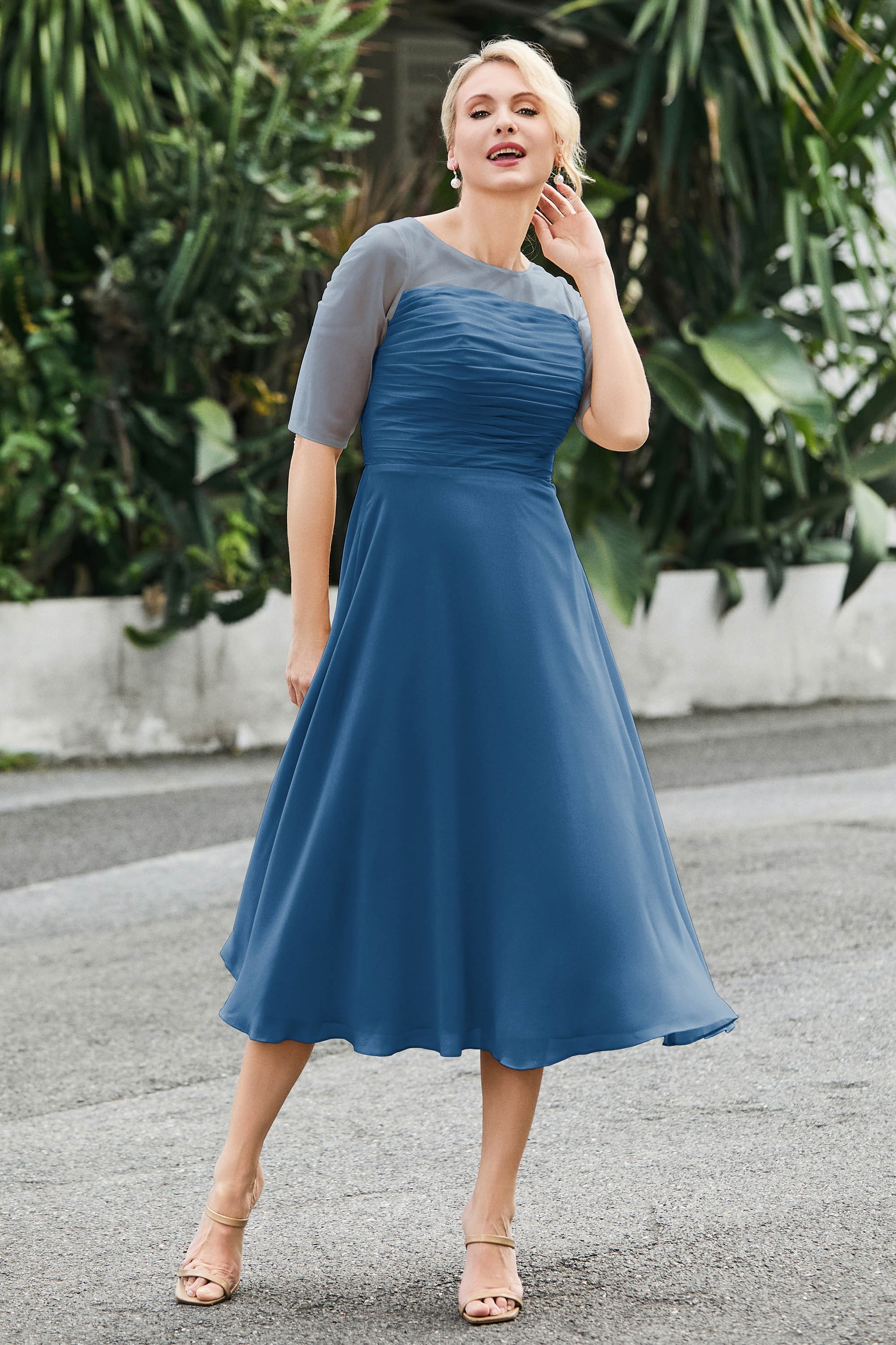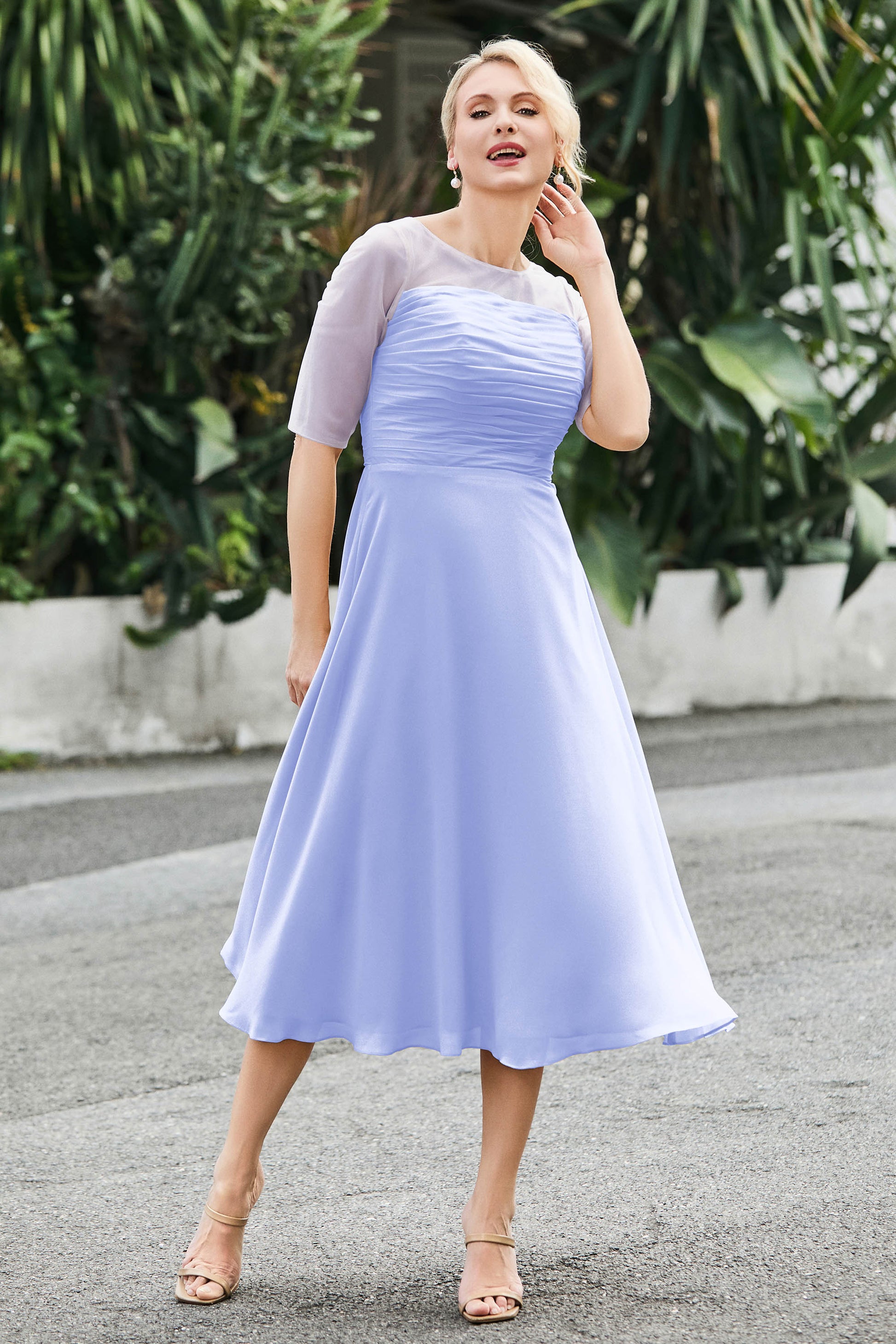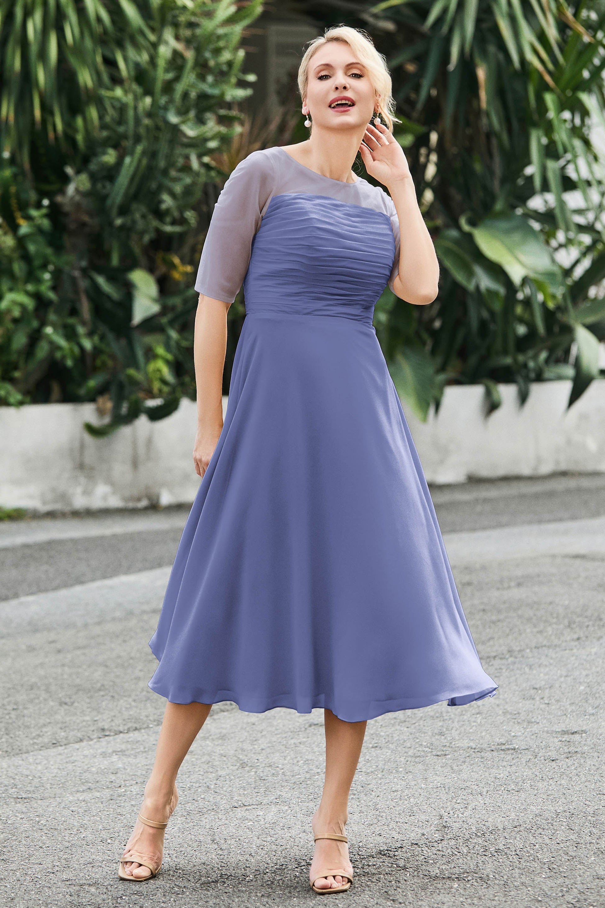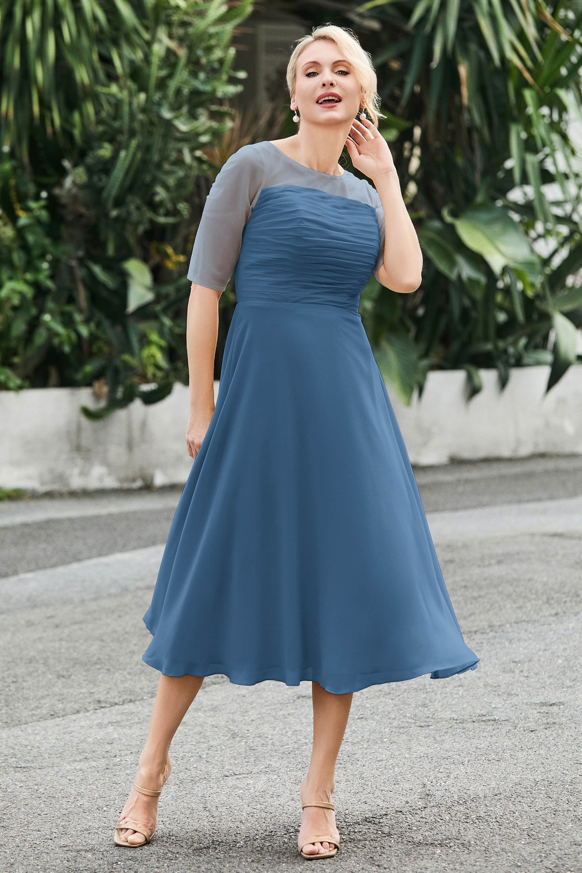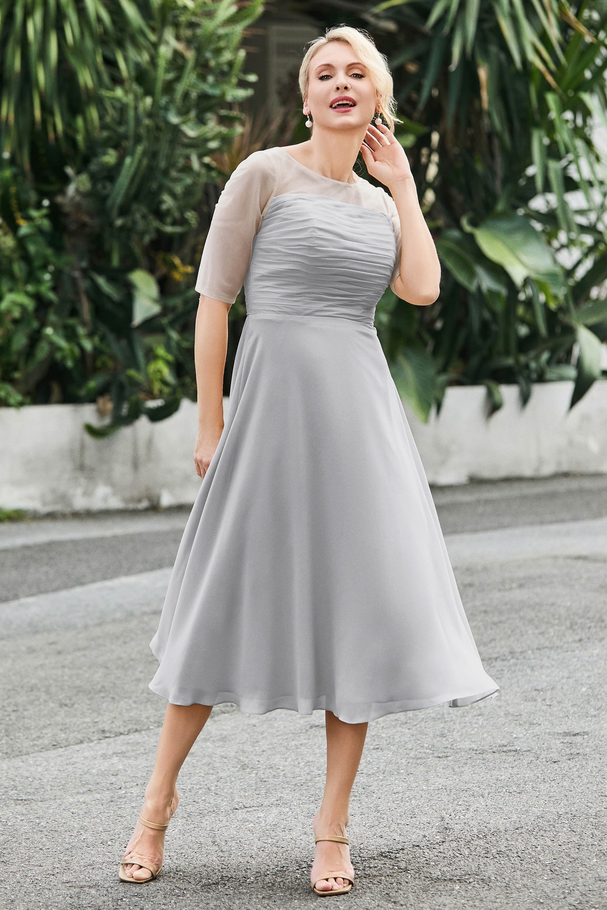 Tea-Length Pleated Chiffon Illusion Neck Dress