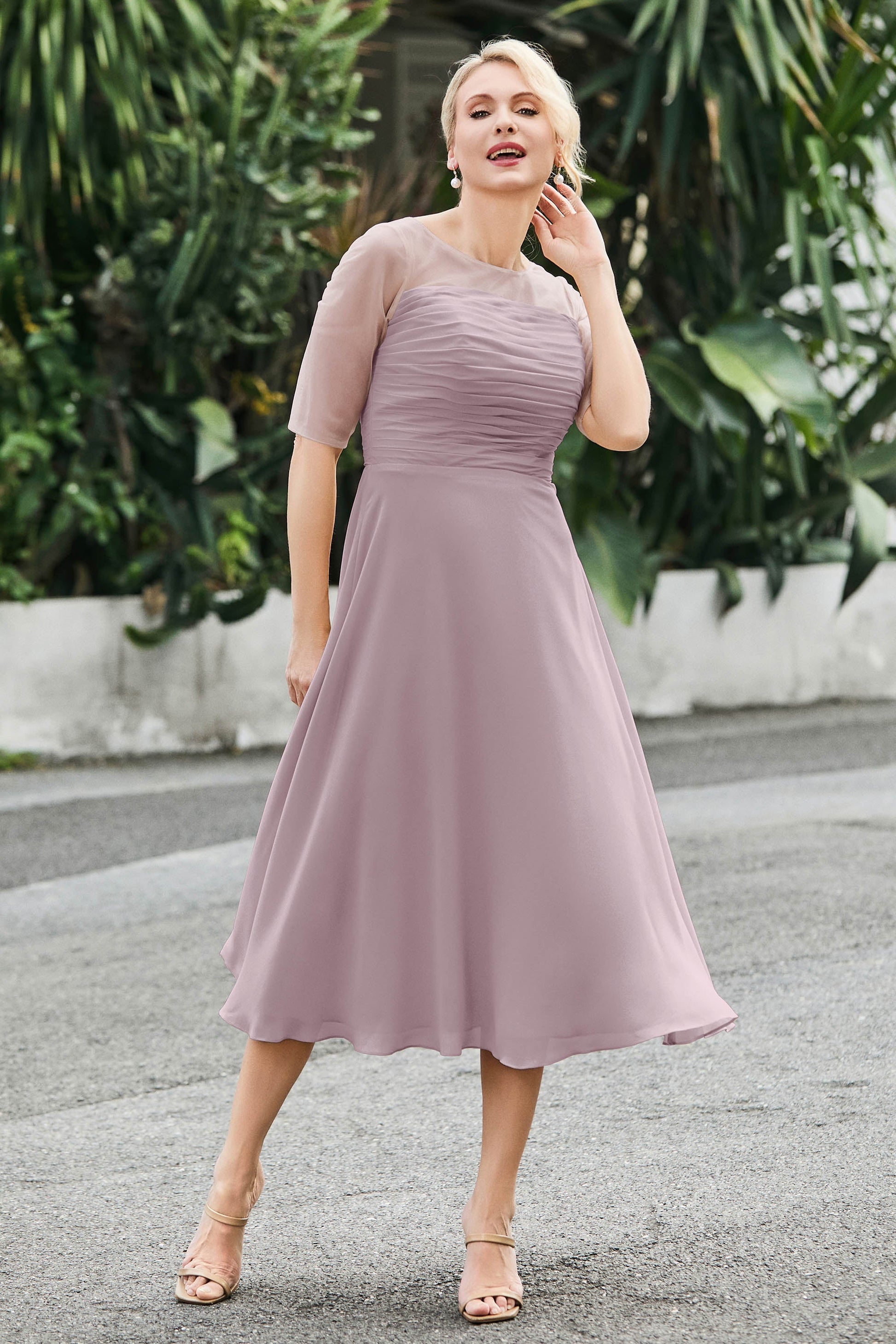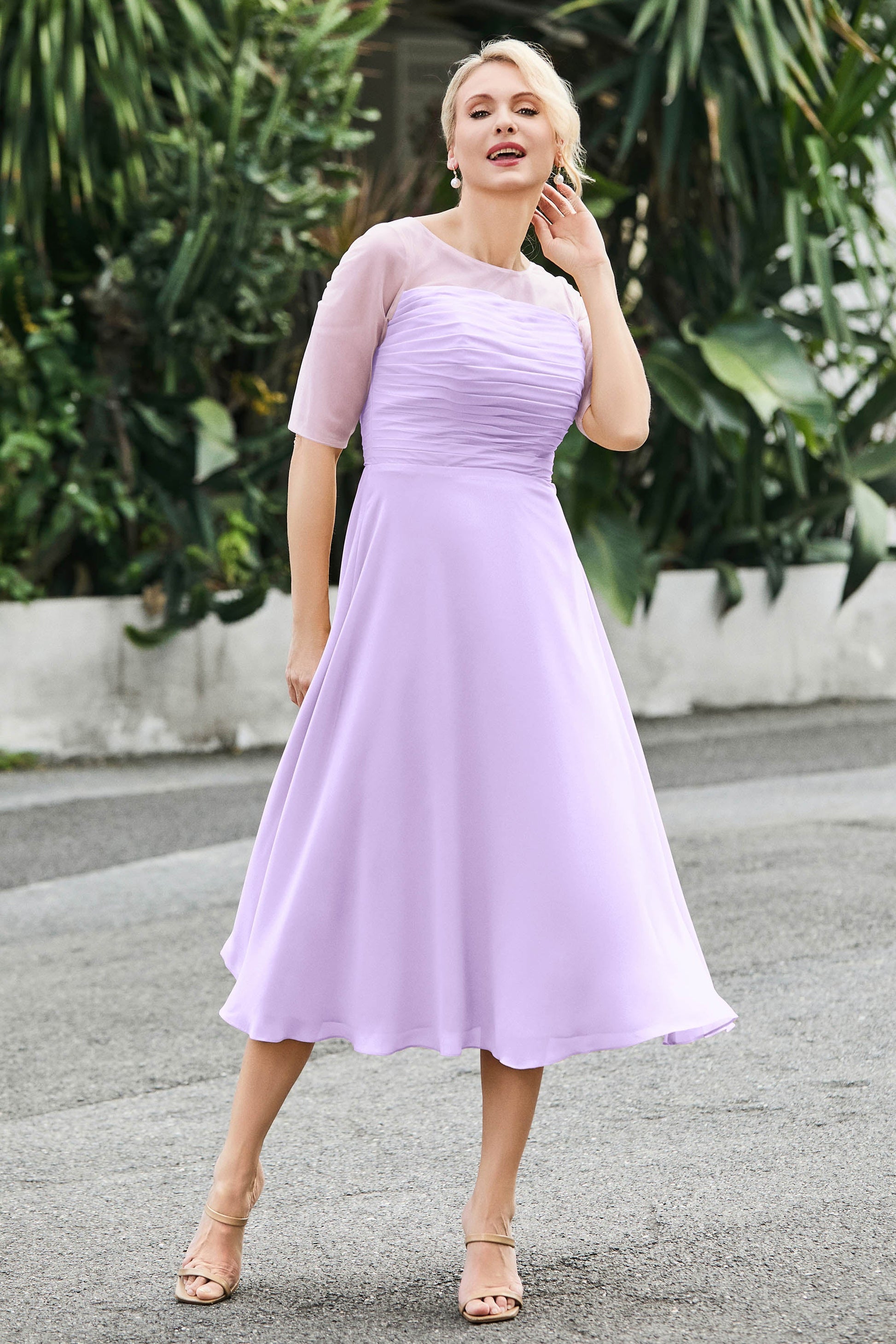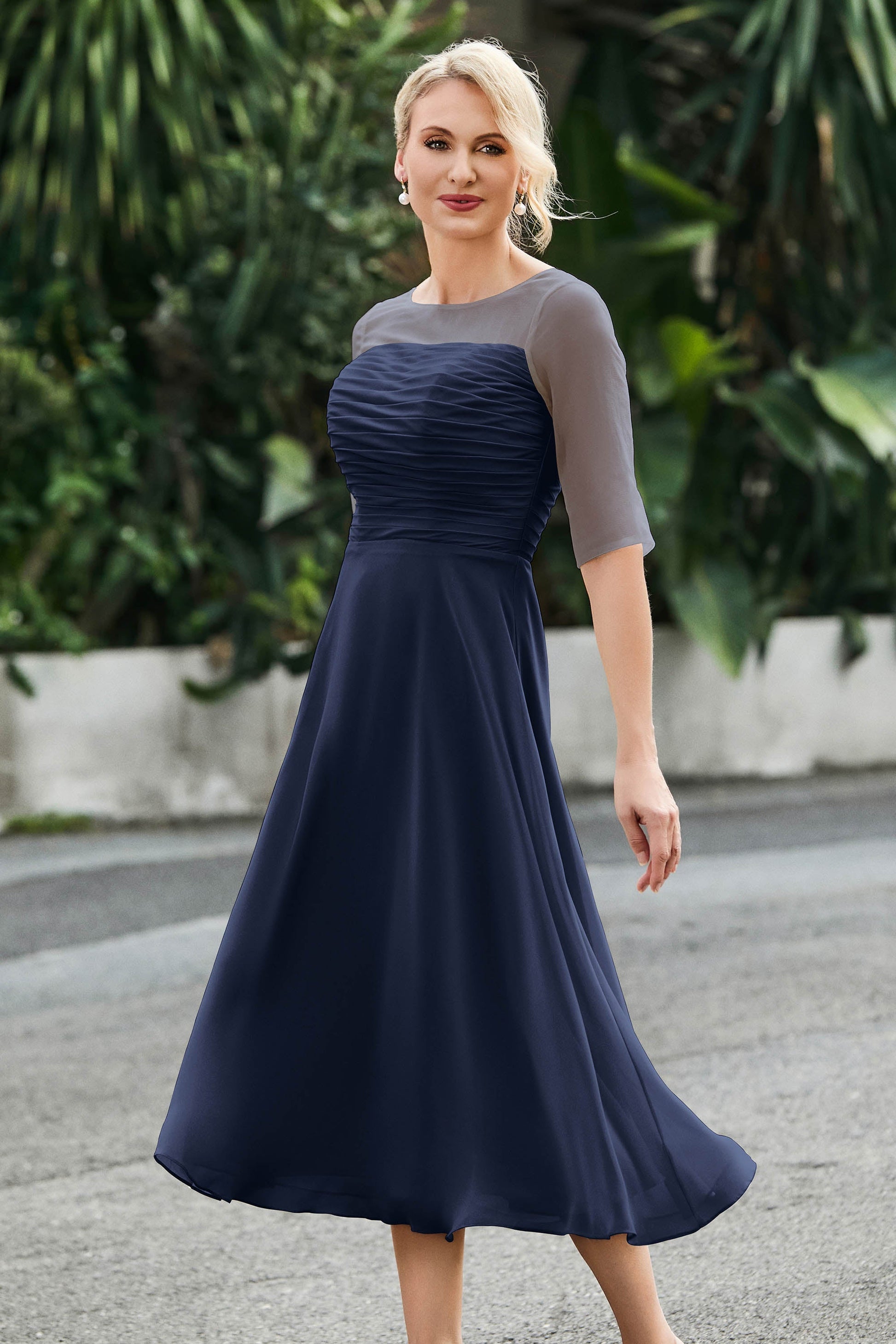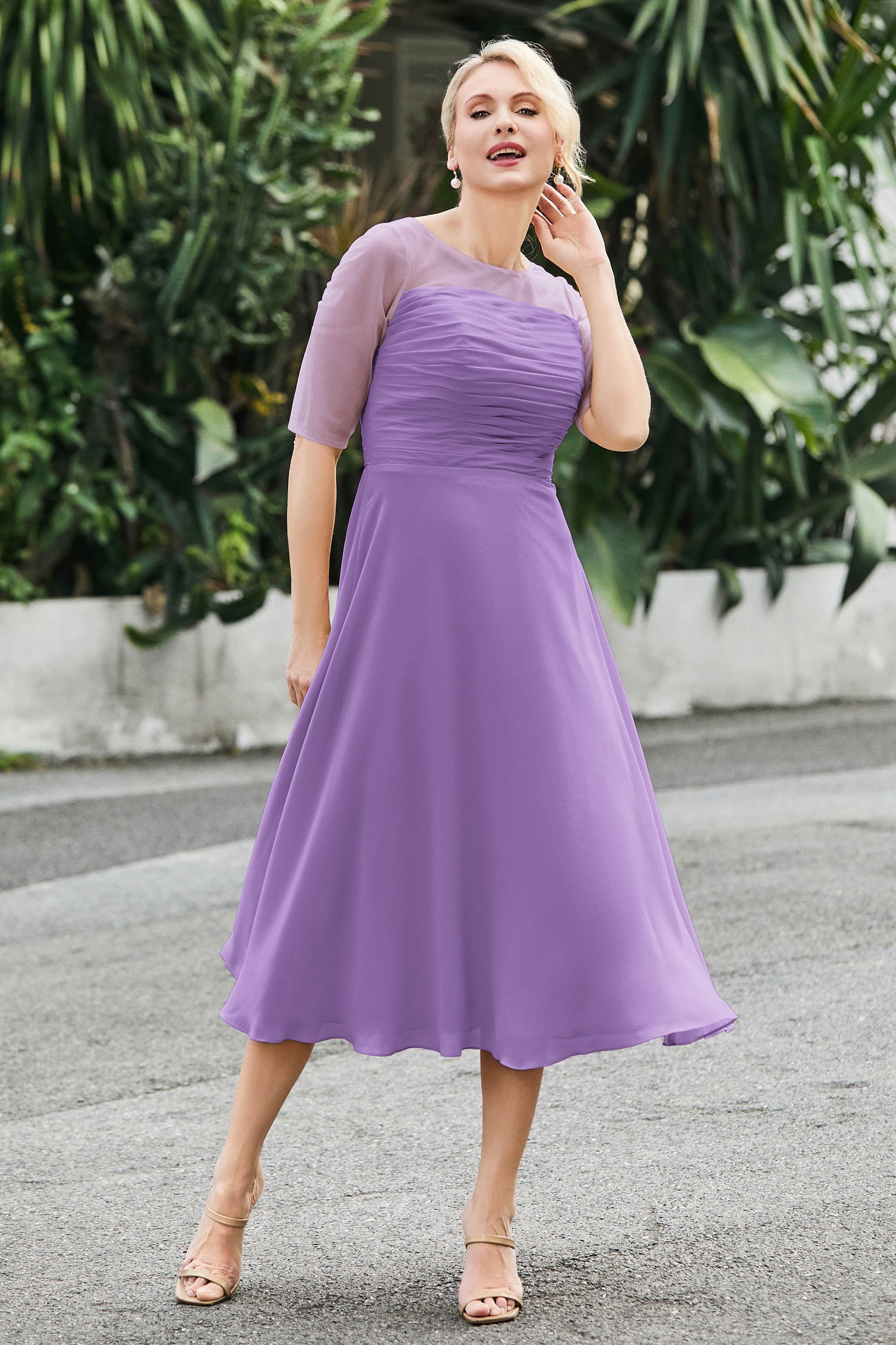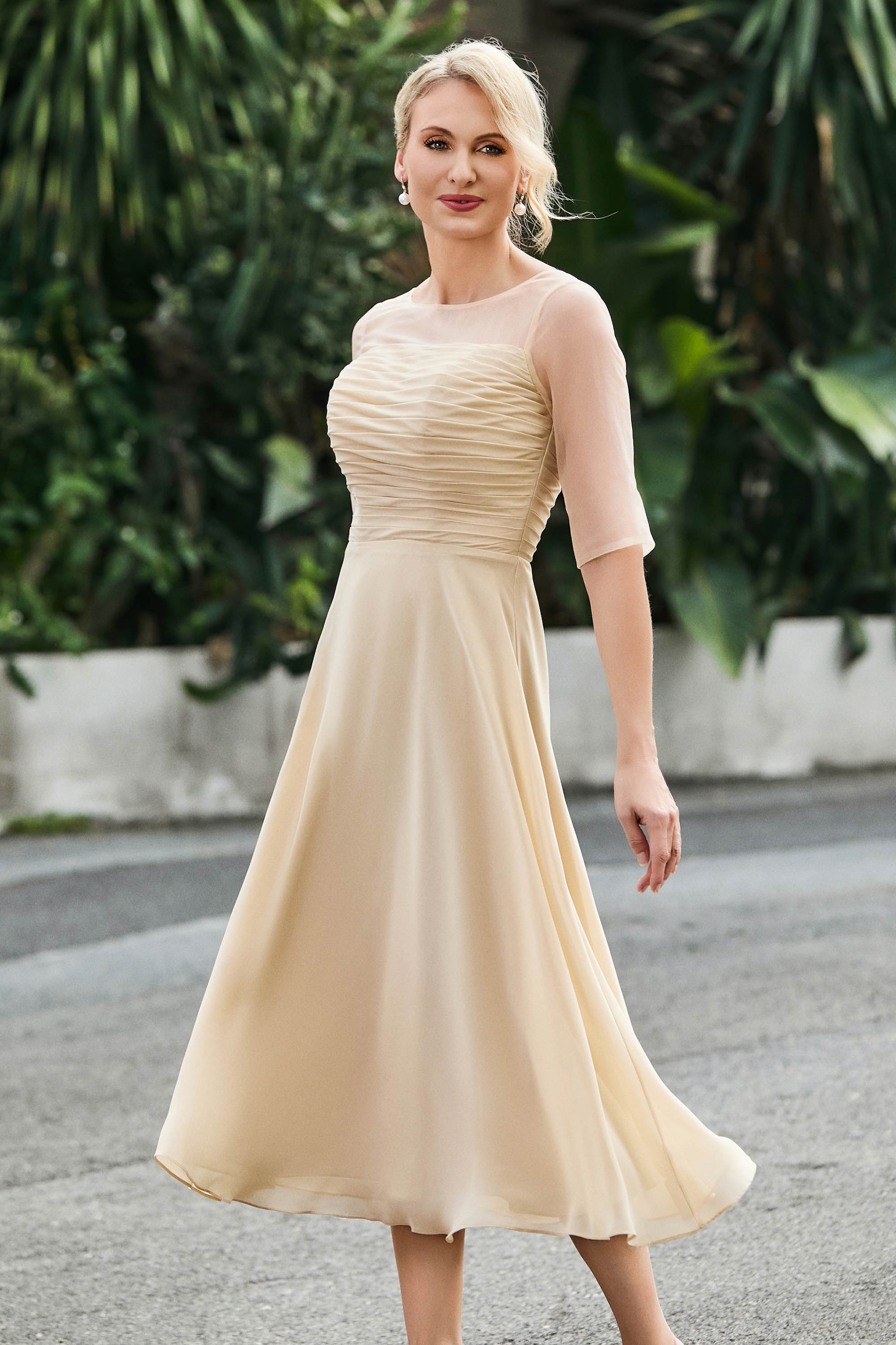 Tea-Length Pleated Chiffon Illusion Neck Dress