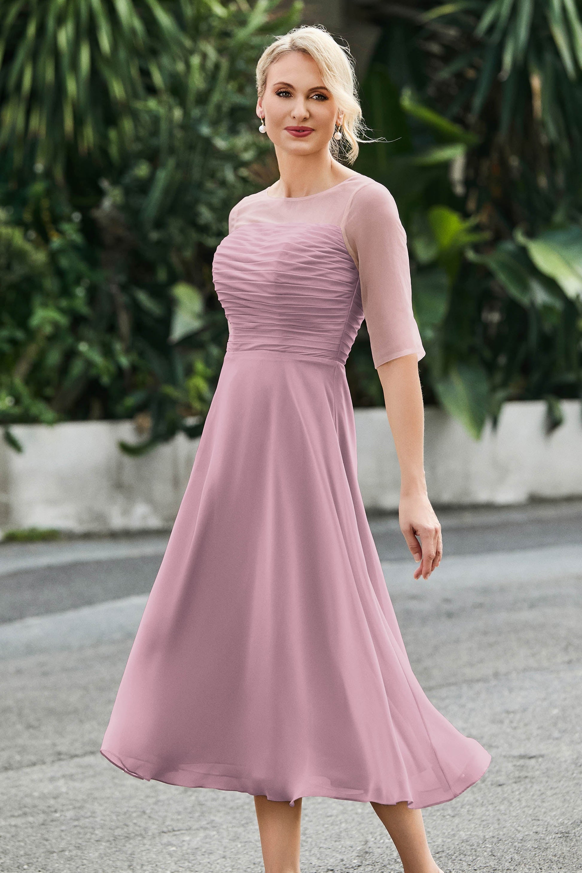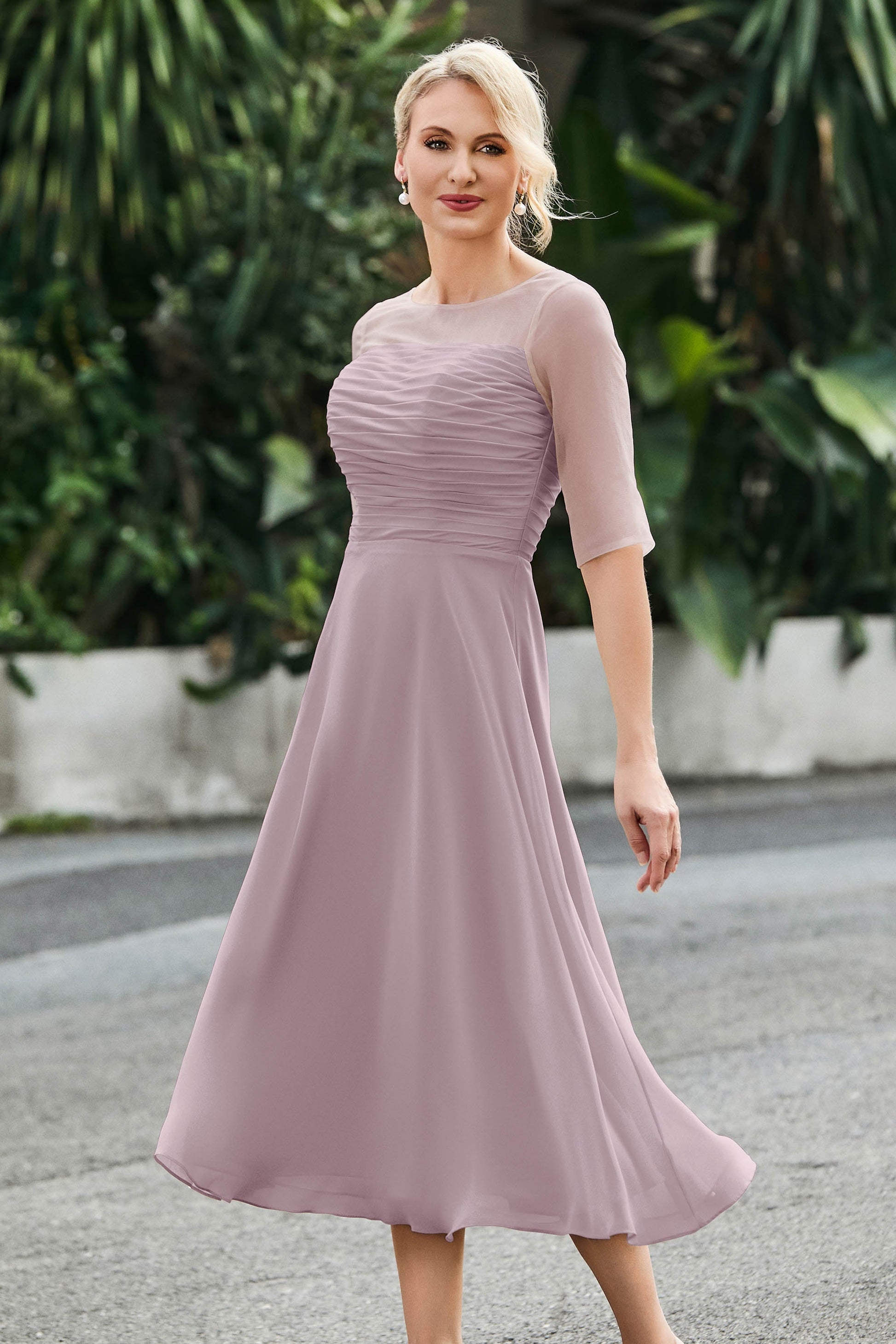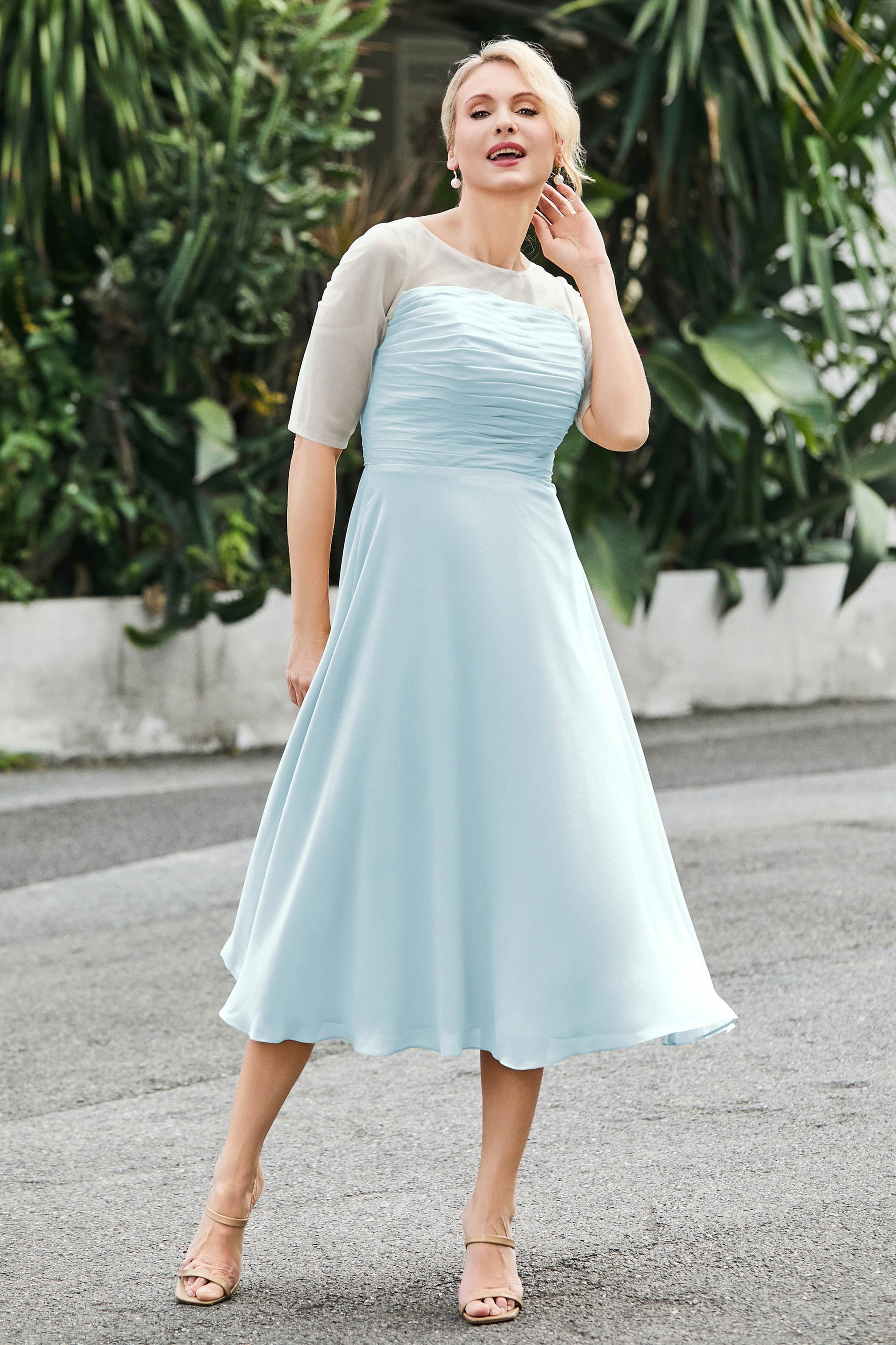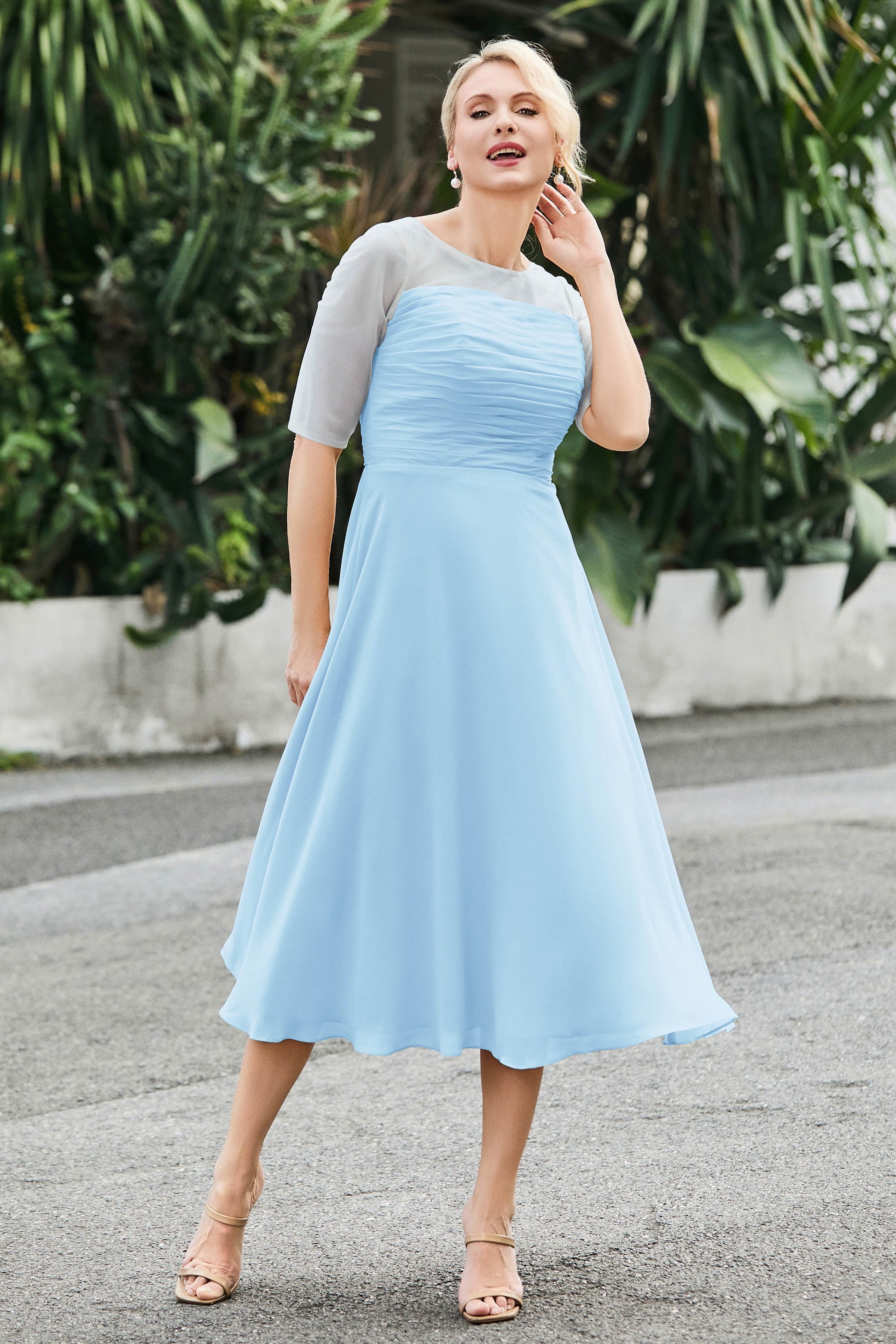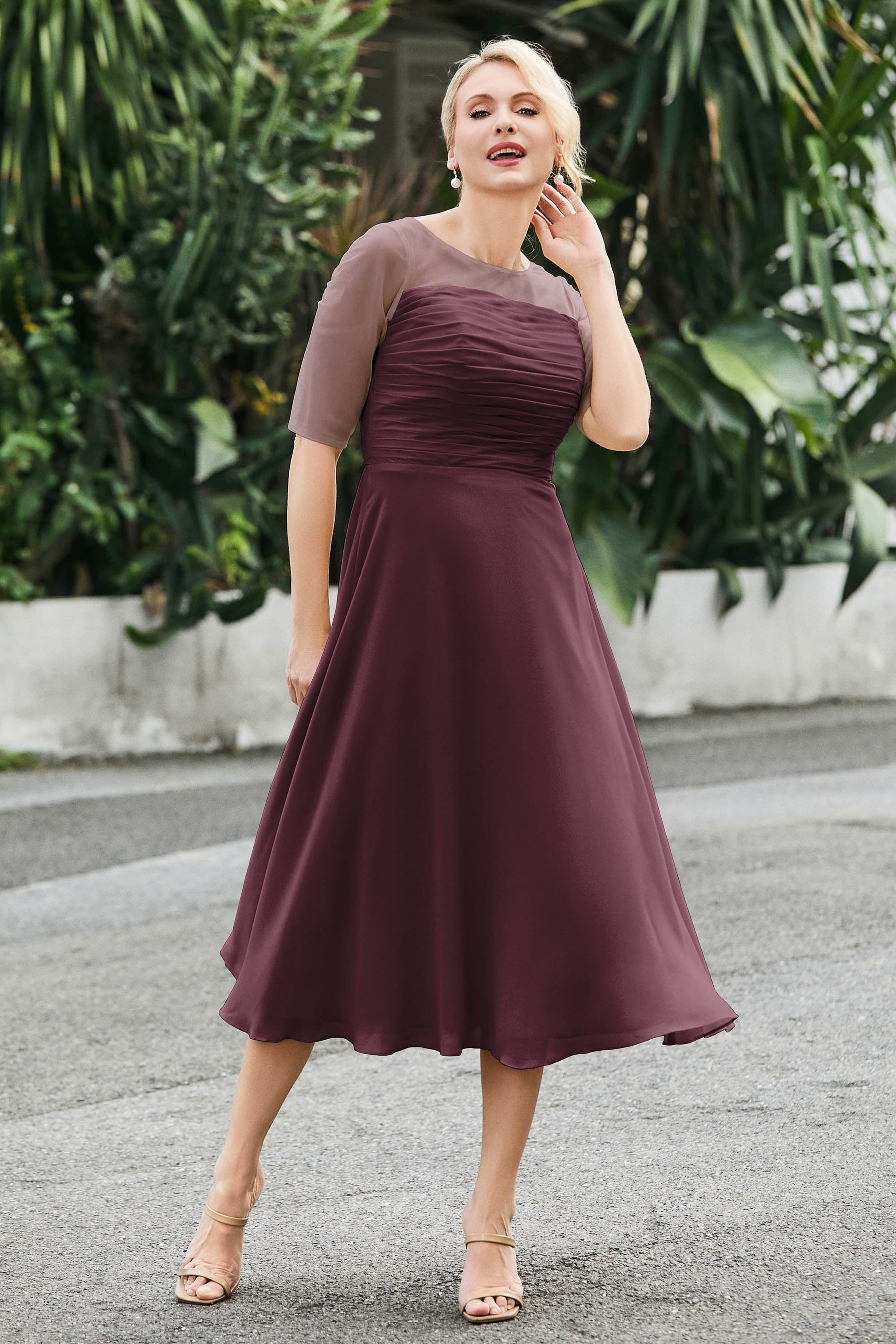 Tea-Length Pleated Chiffon Illusion Neck Dress