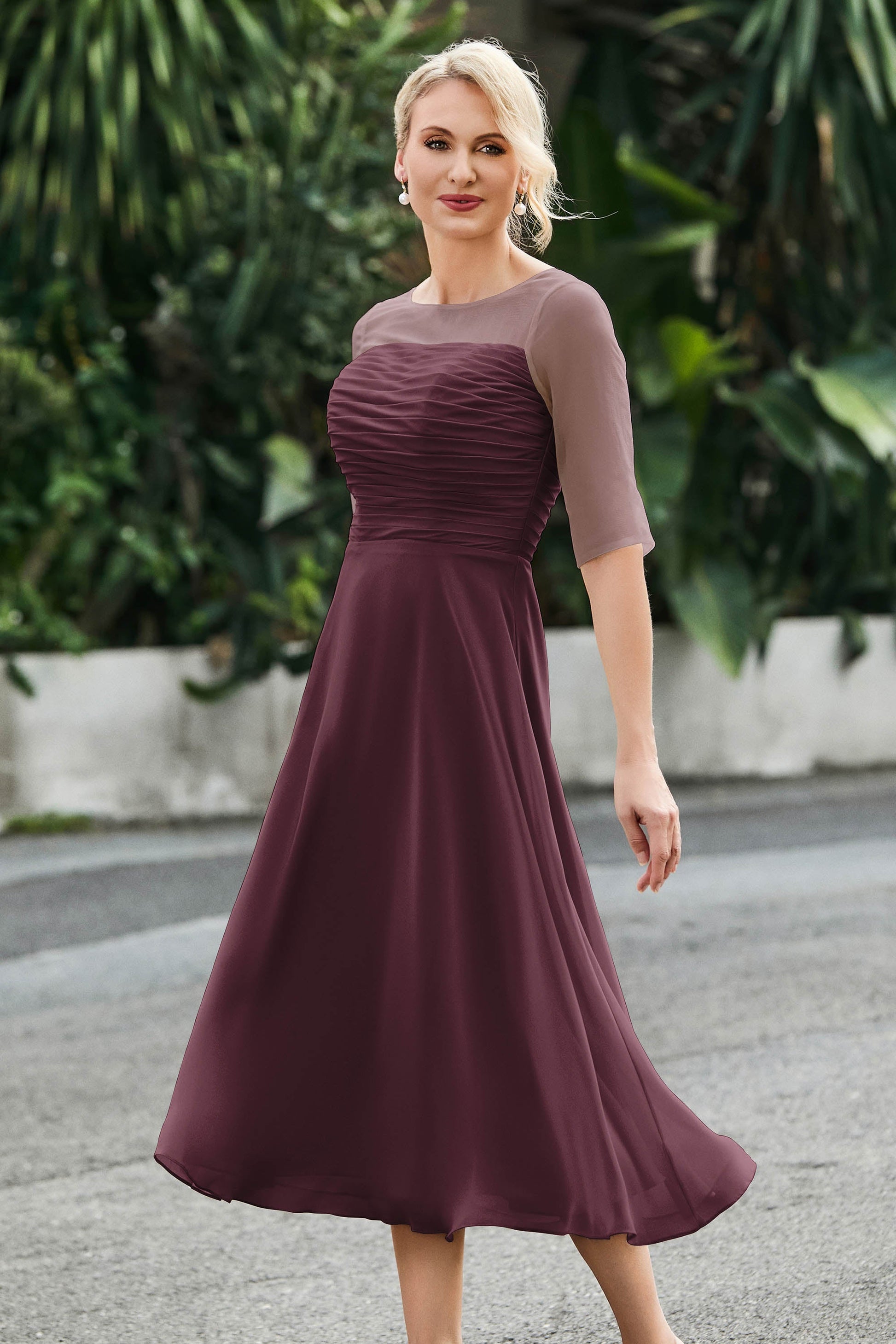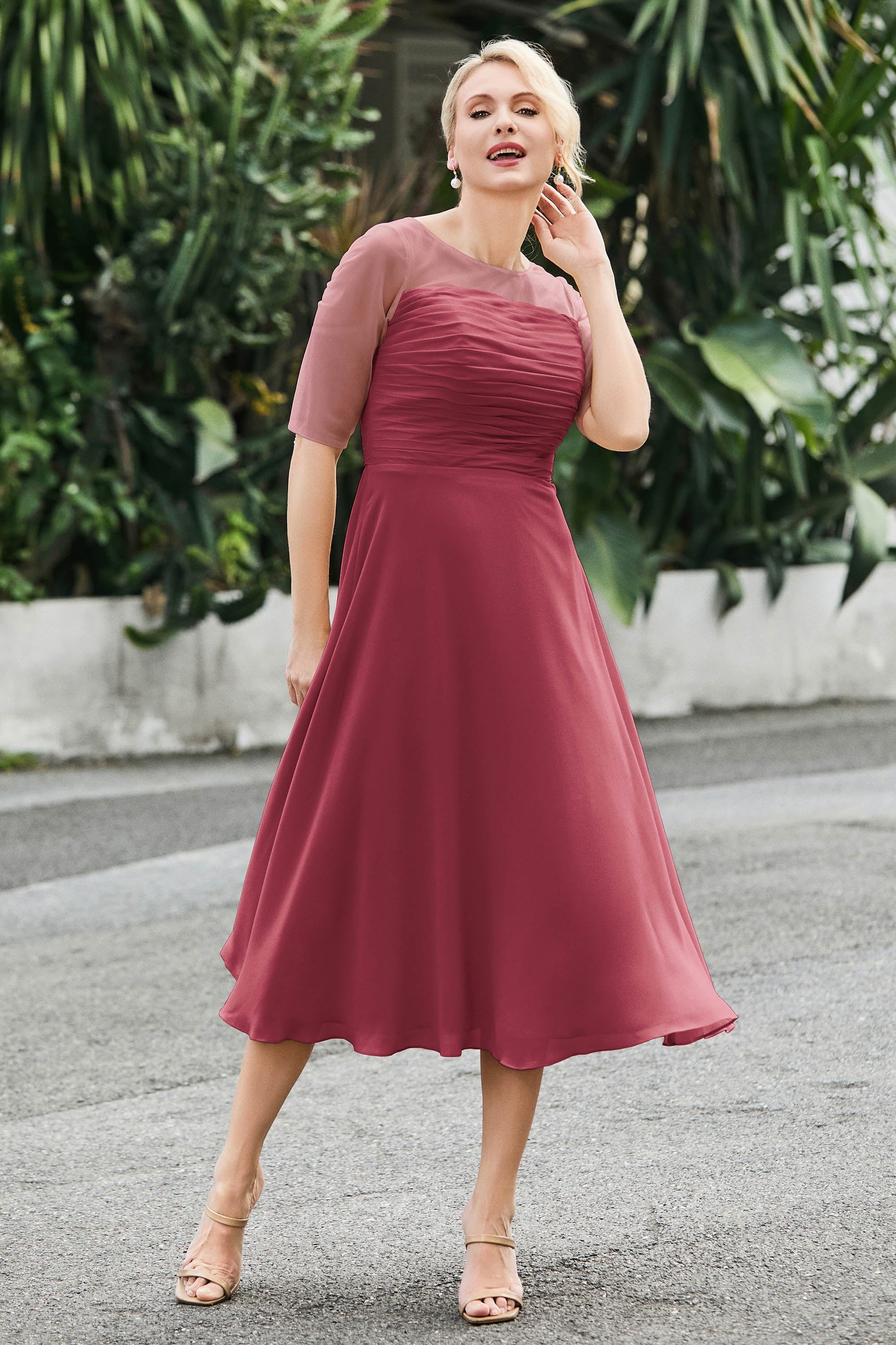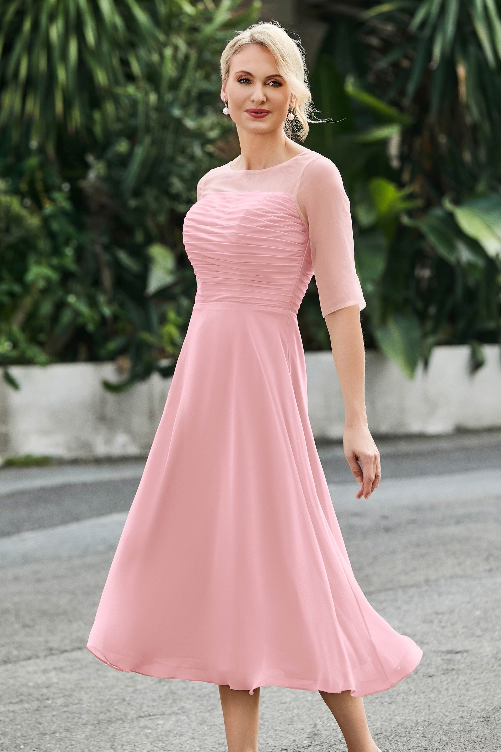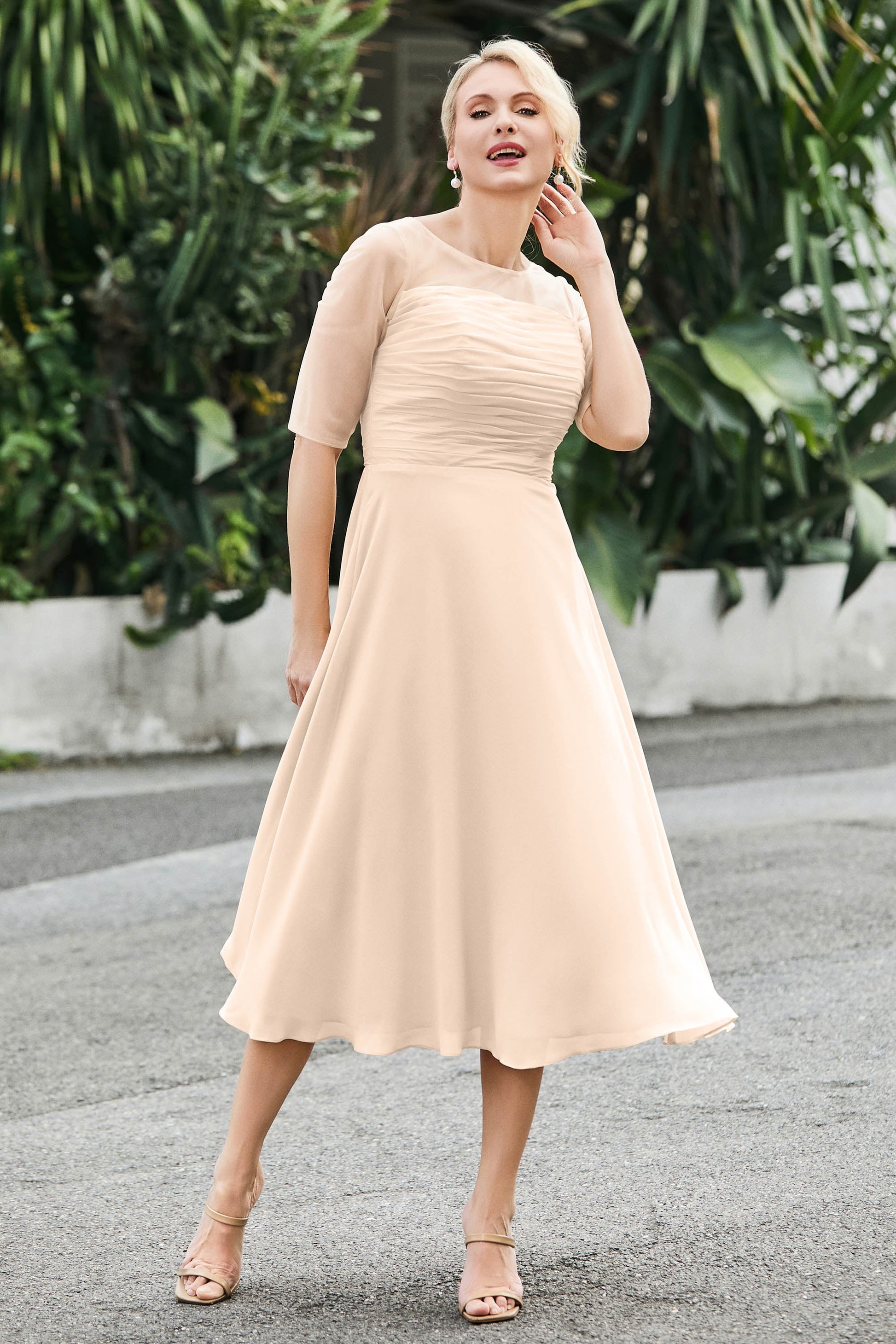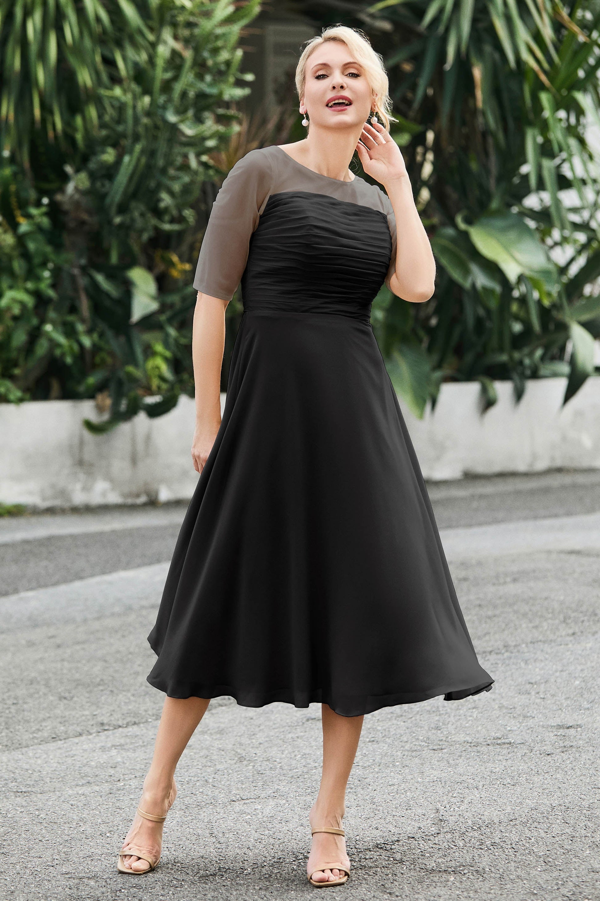 Tea-Length Pleated Chiffon Illusion Neck Dress