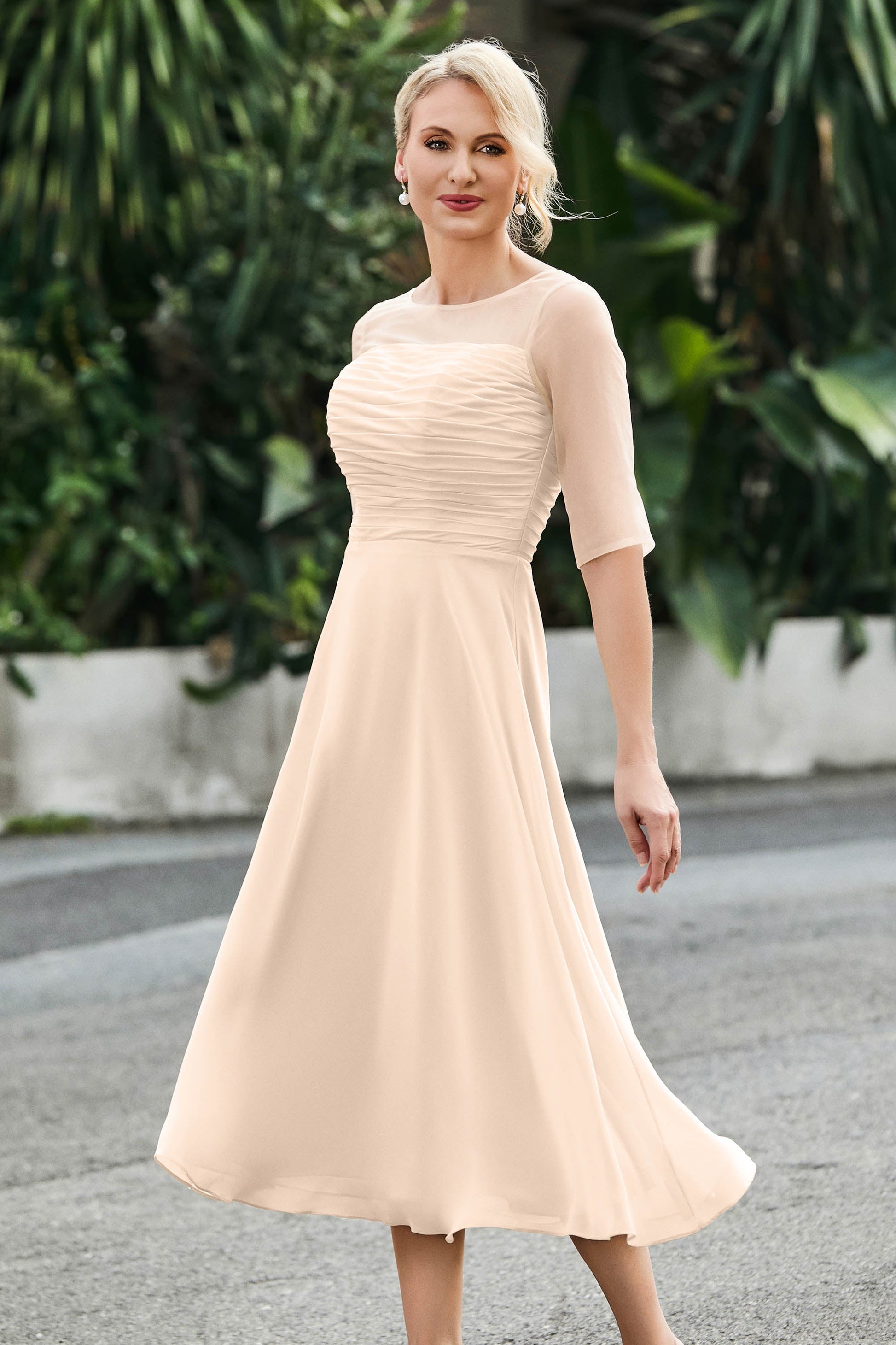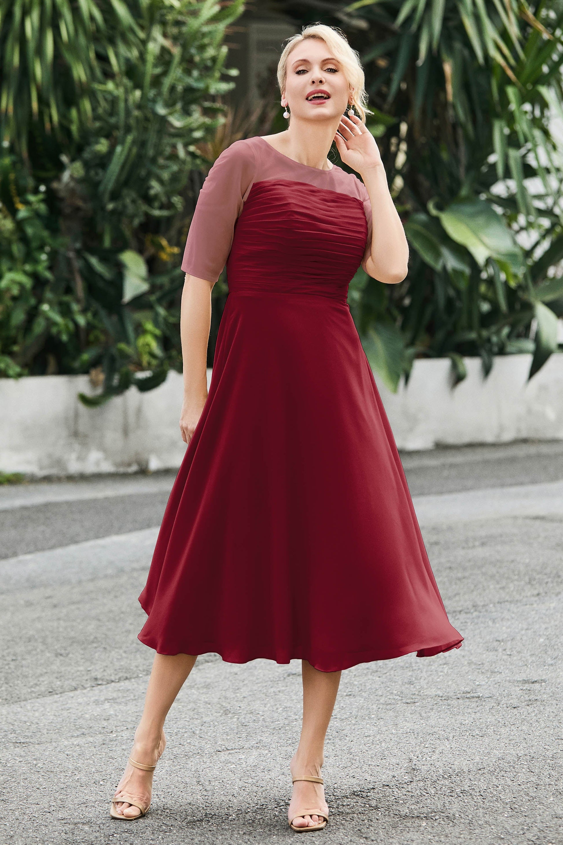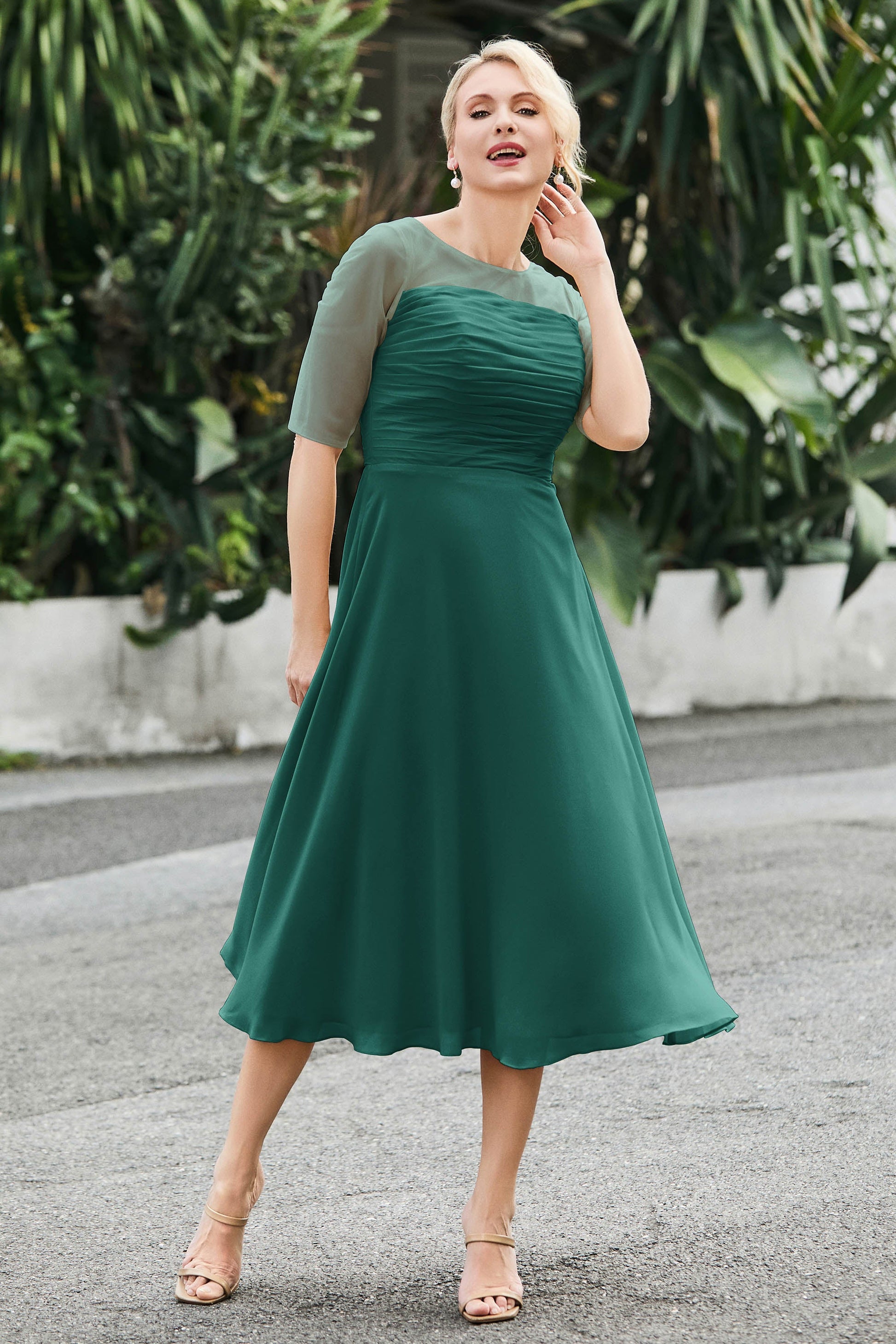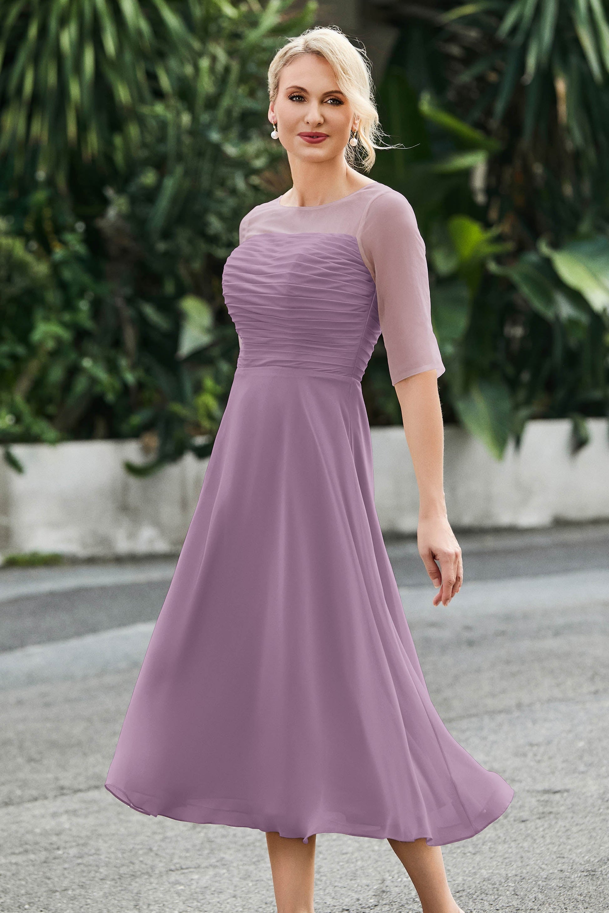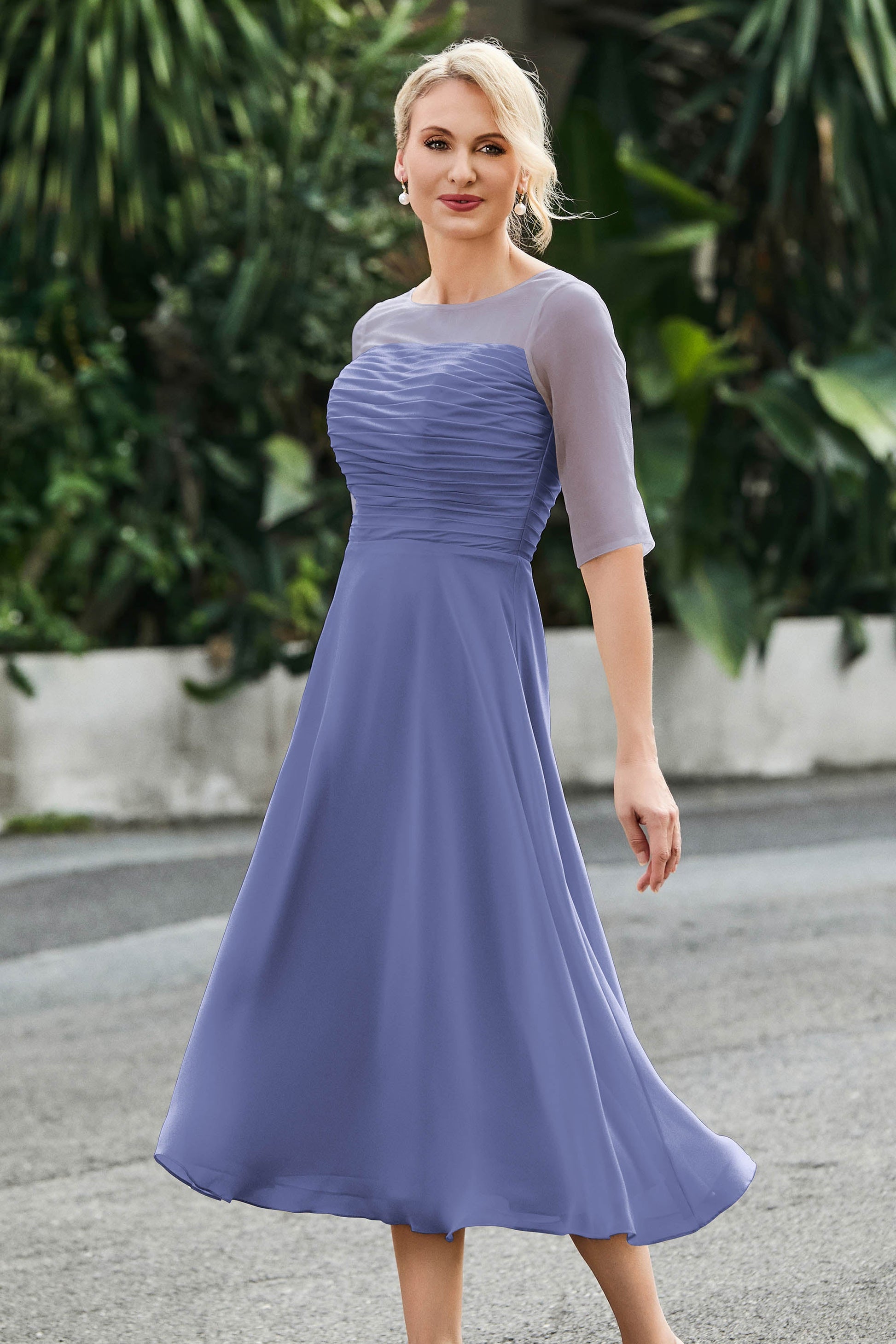 Tea-Length Pleated Chiffon Illusion Neck Dress