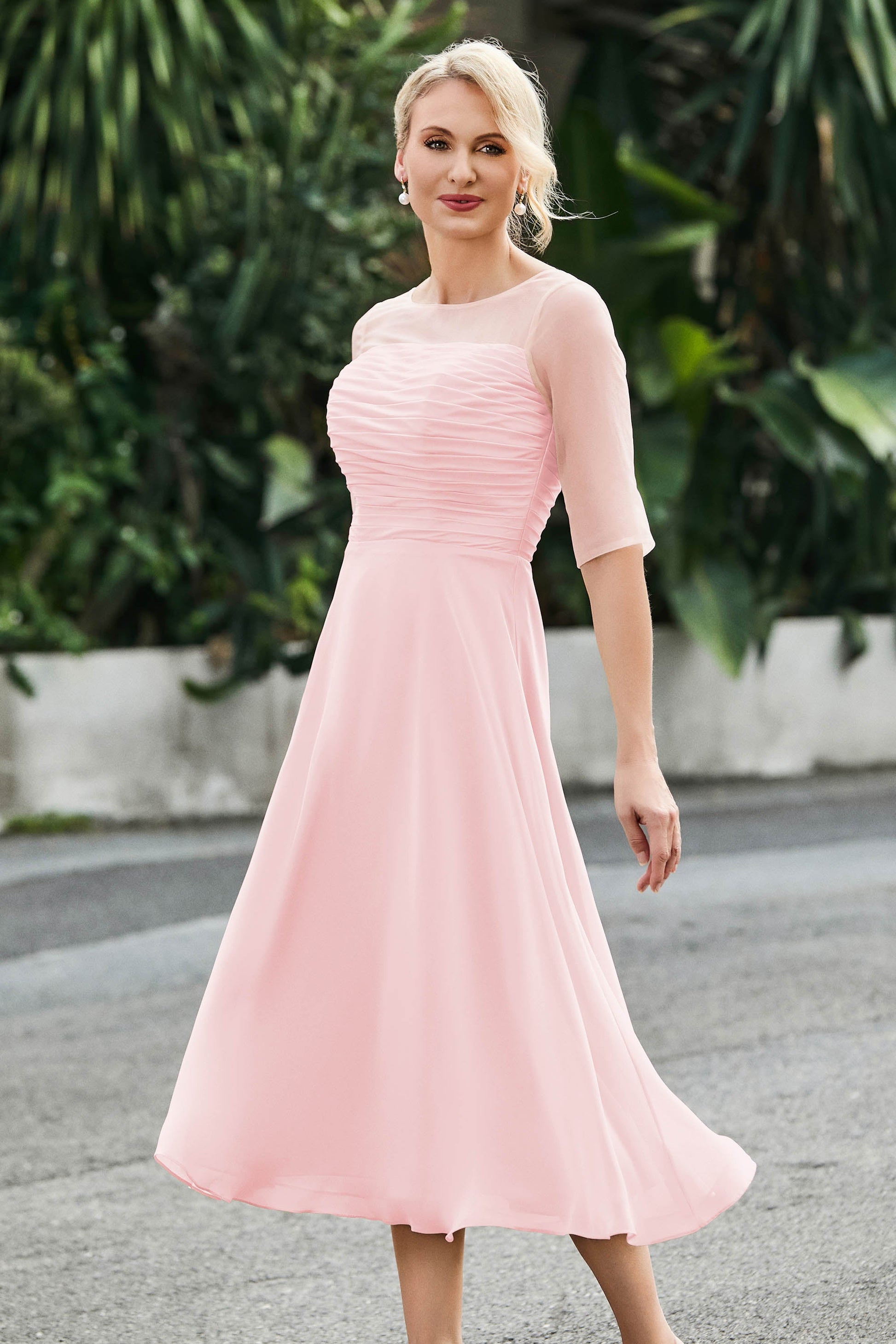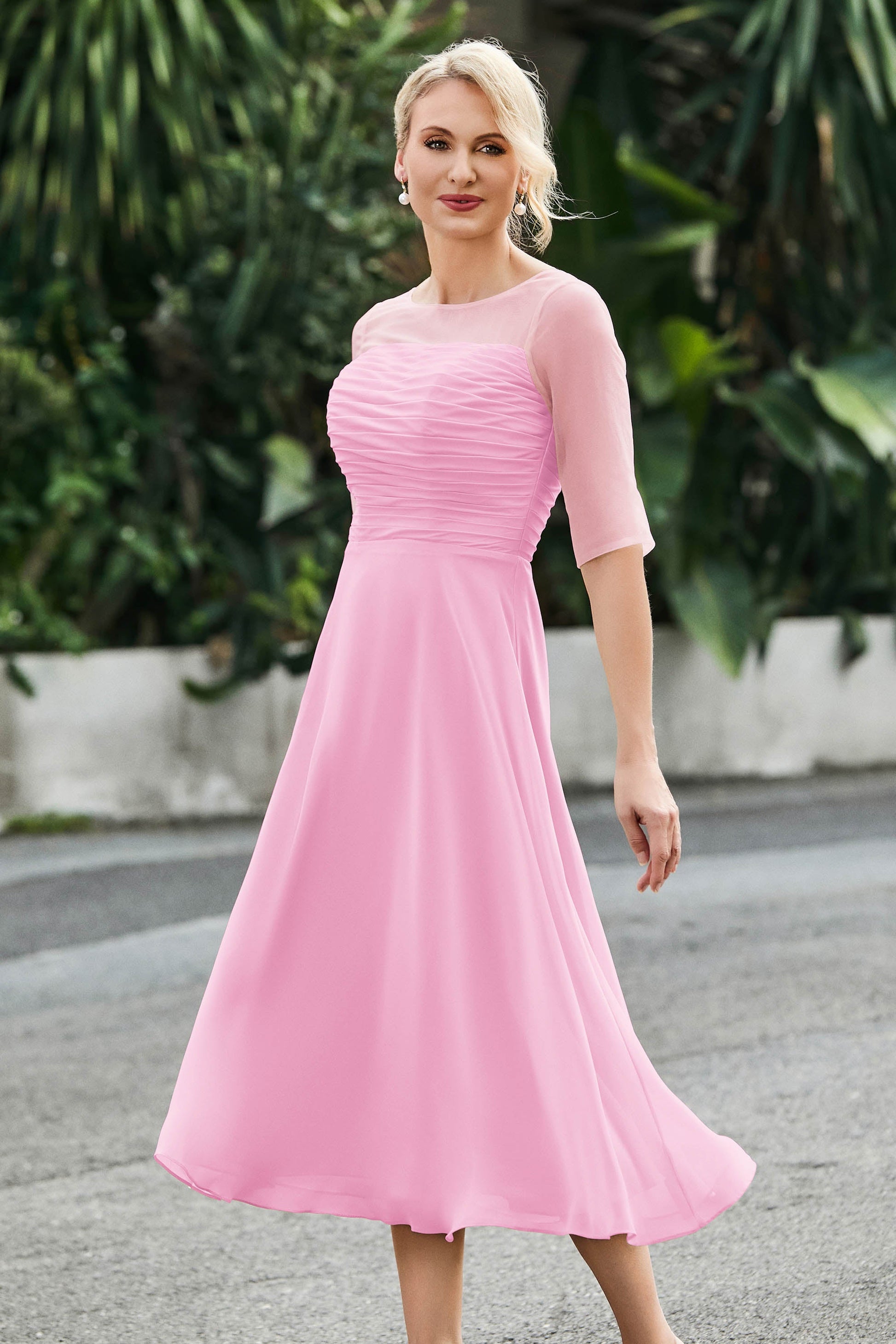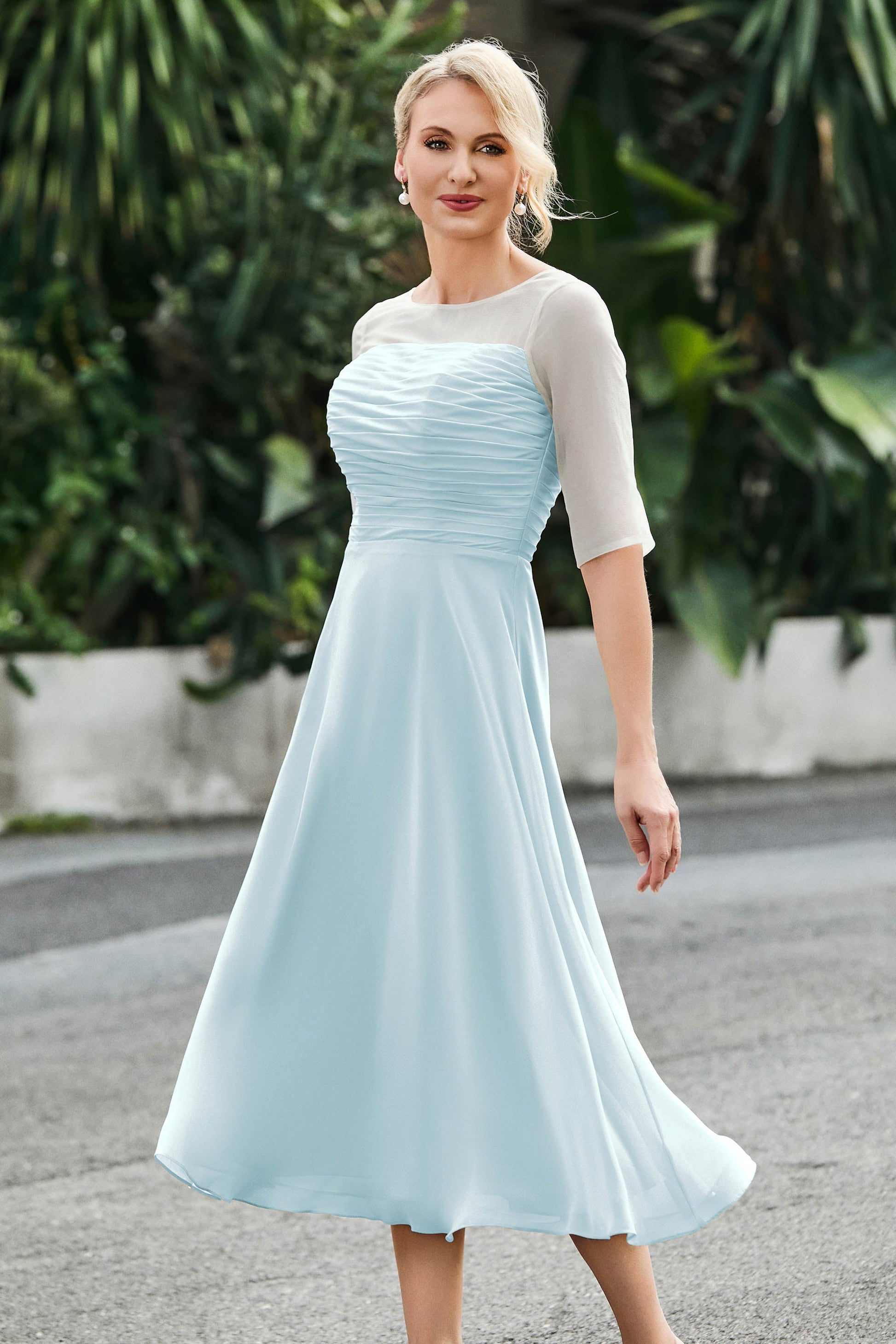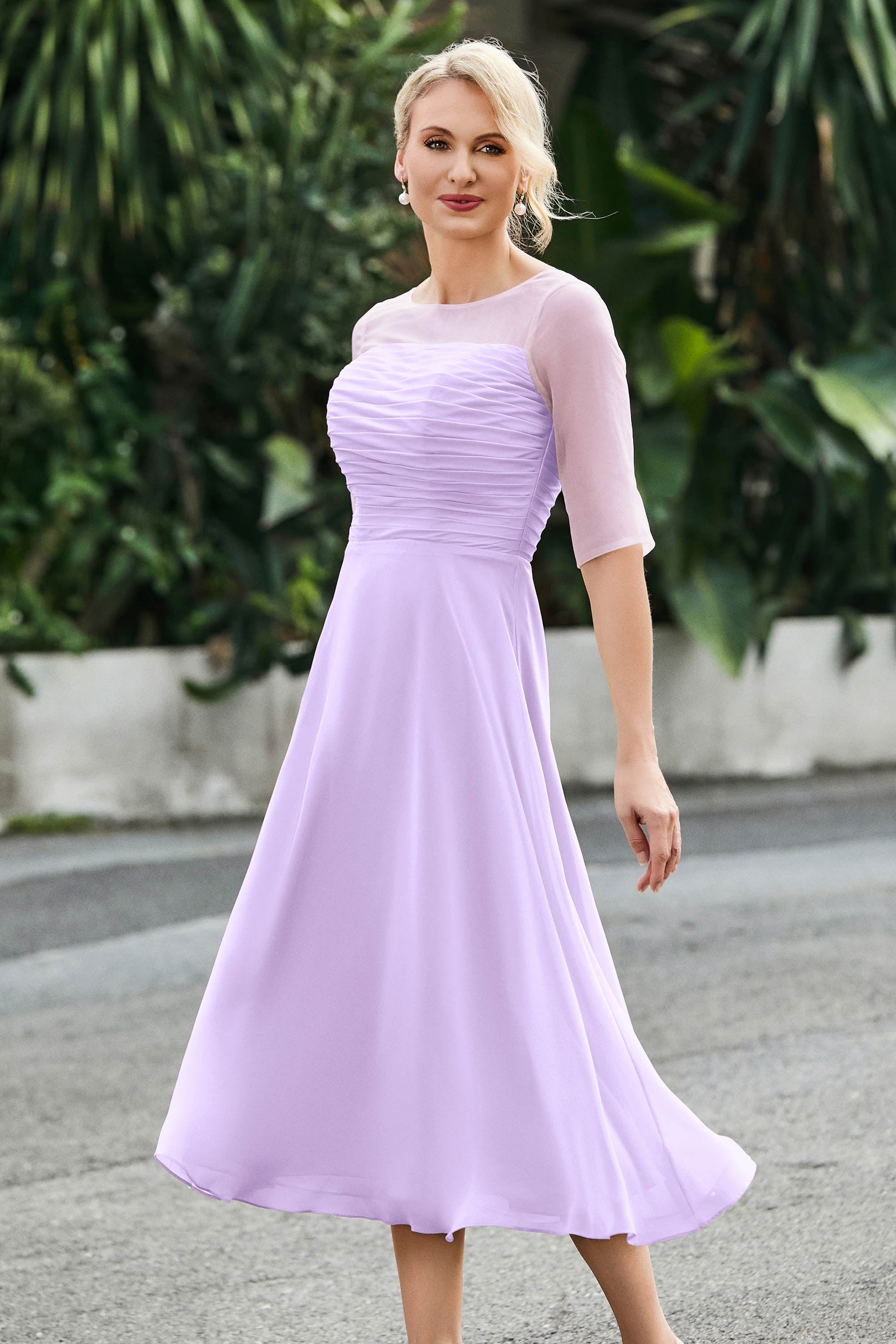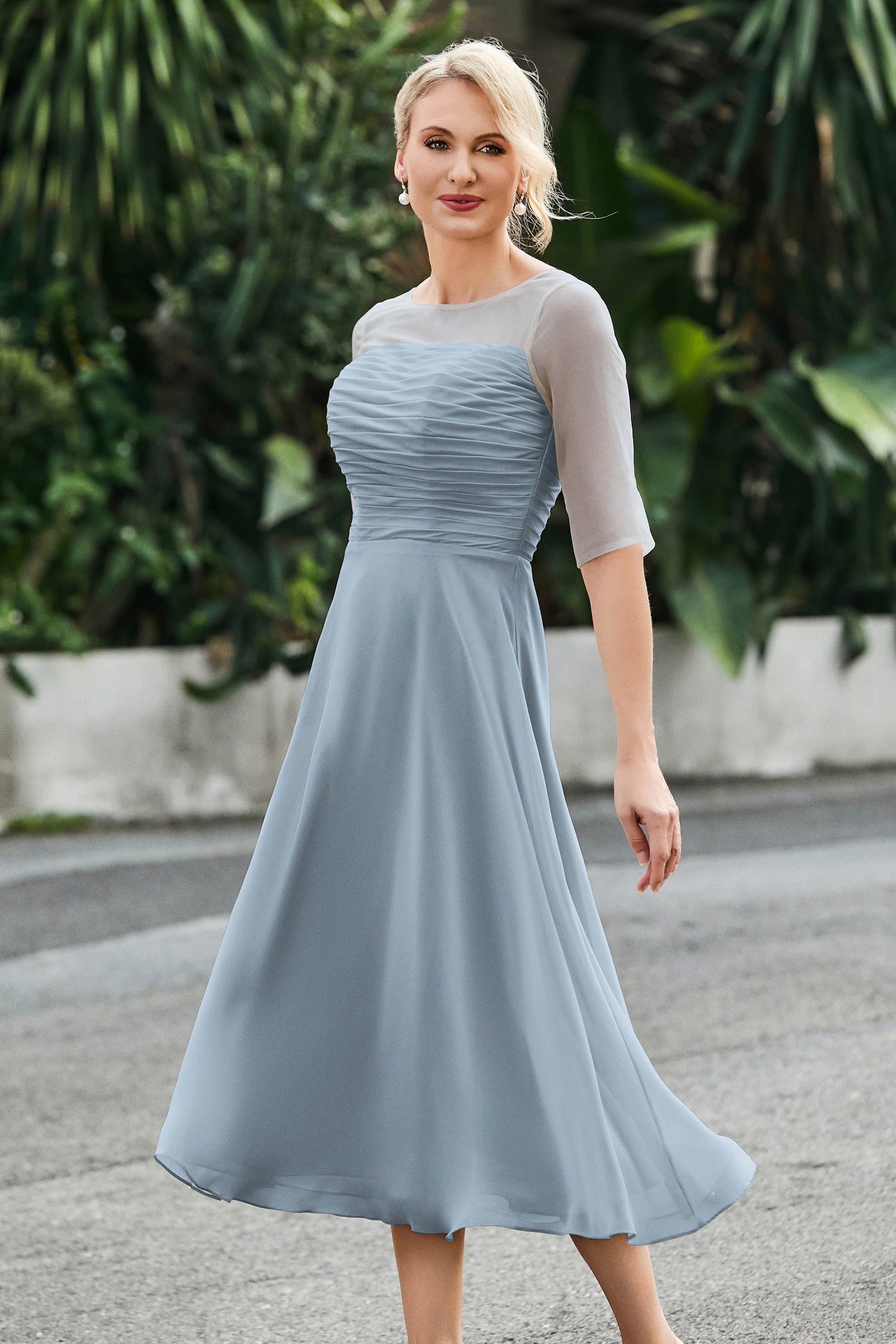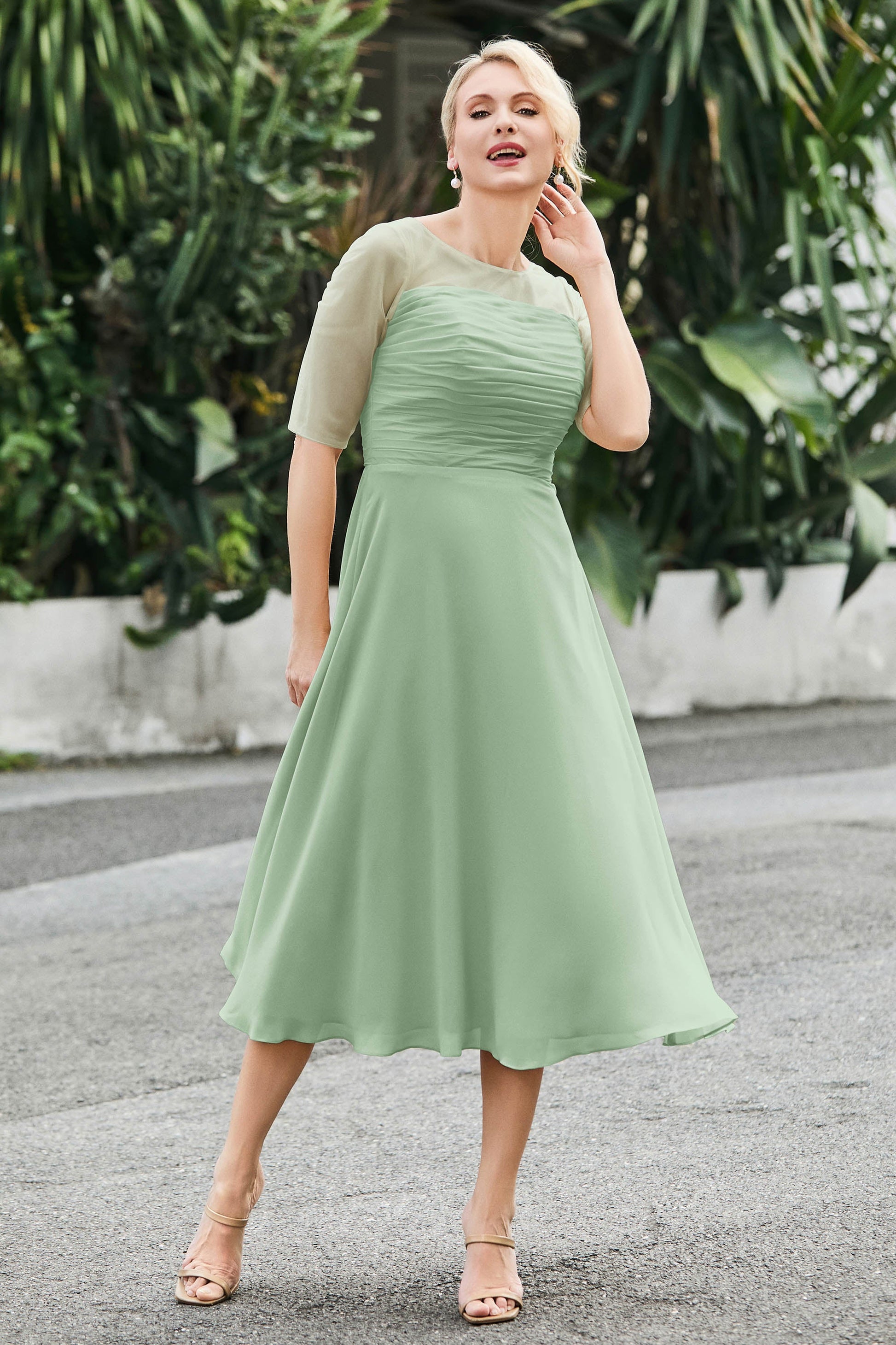 Tea-Length Pleated Chiffon Illusion Neck Dress