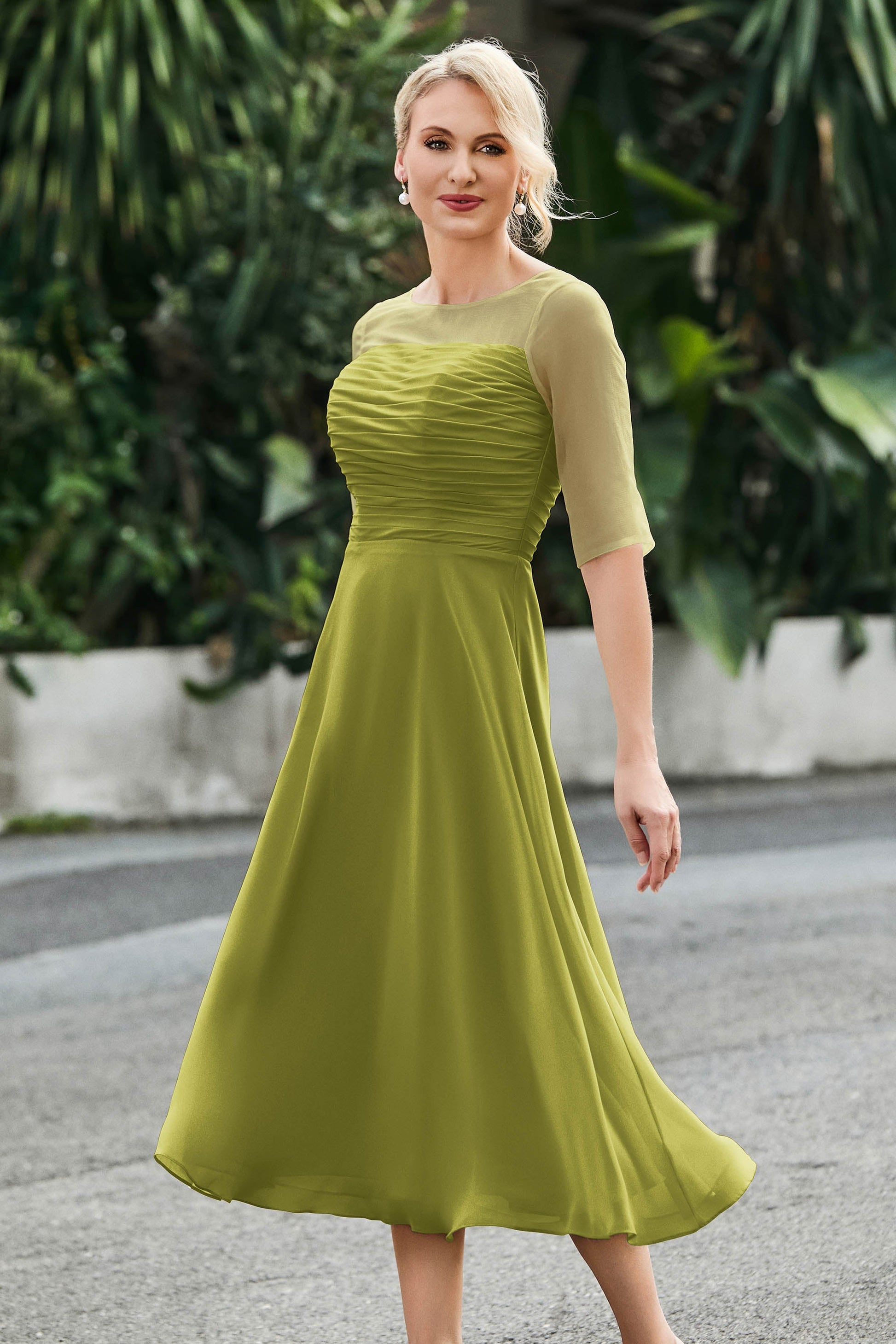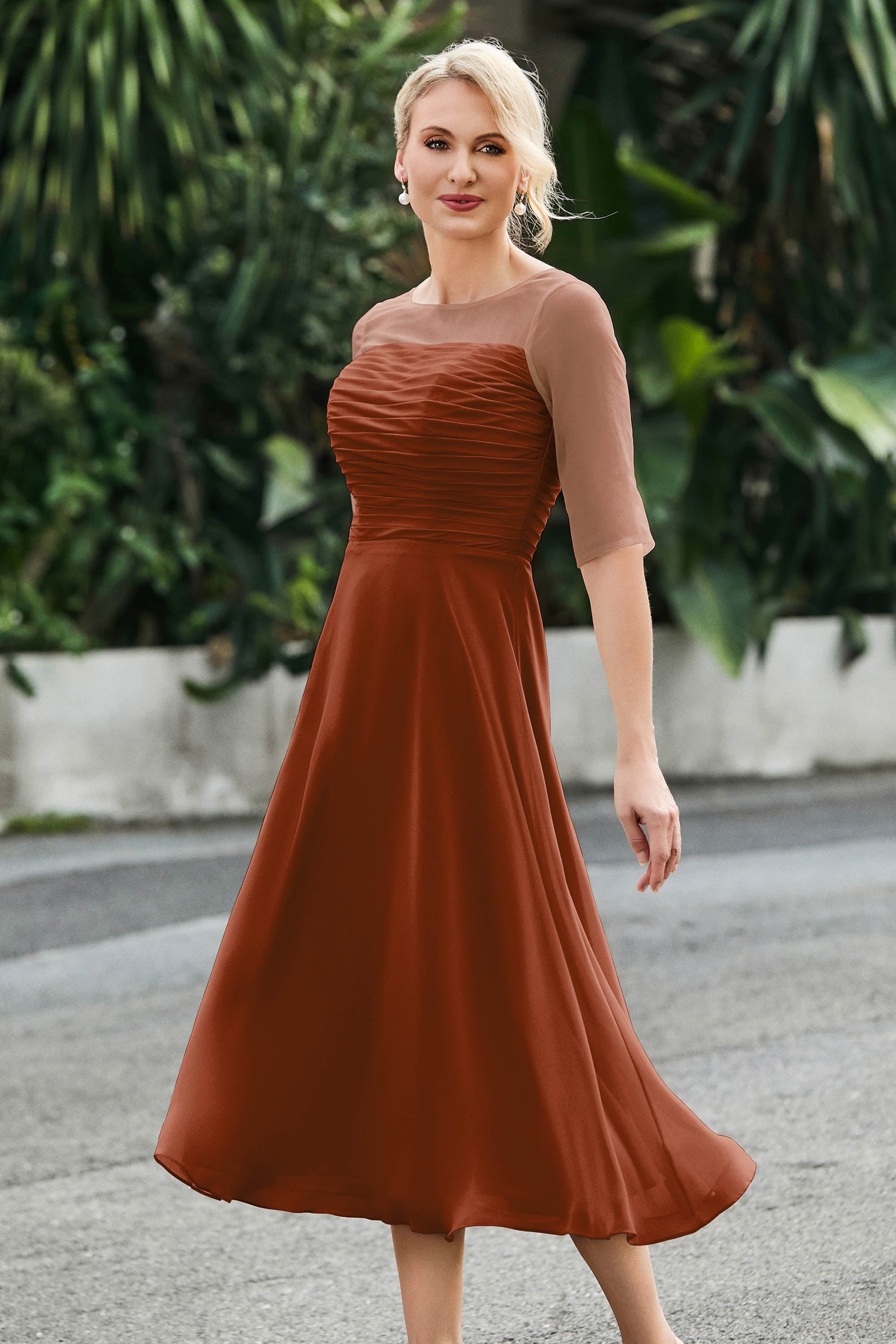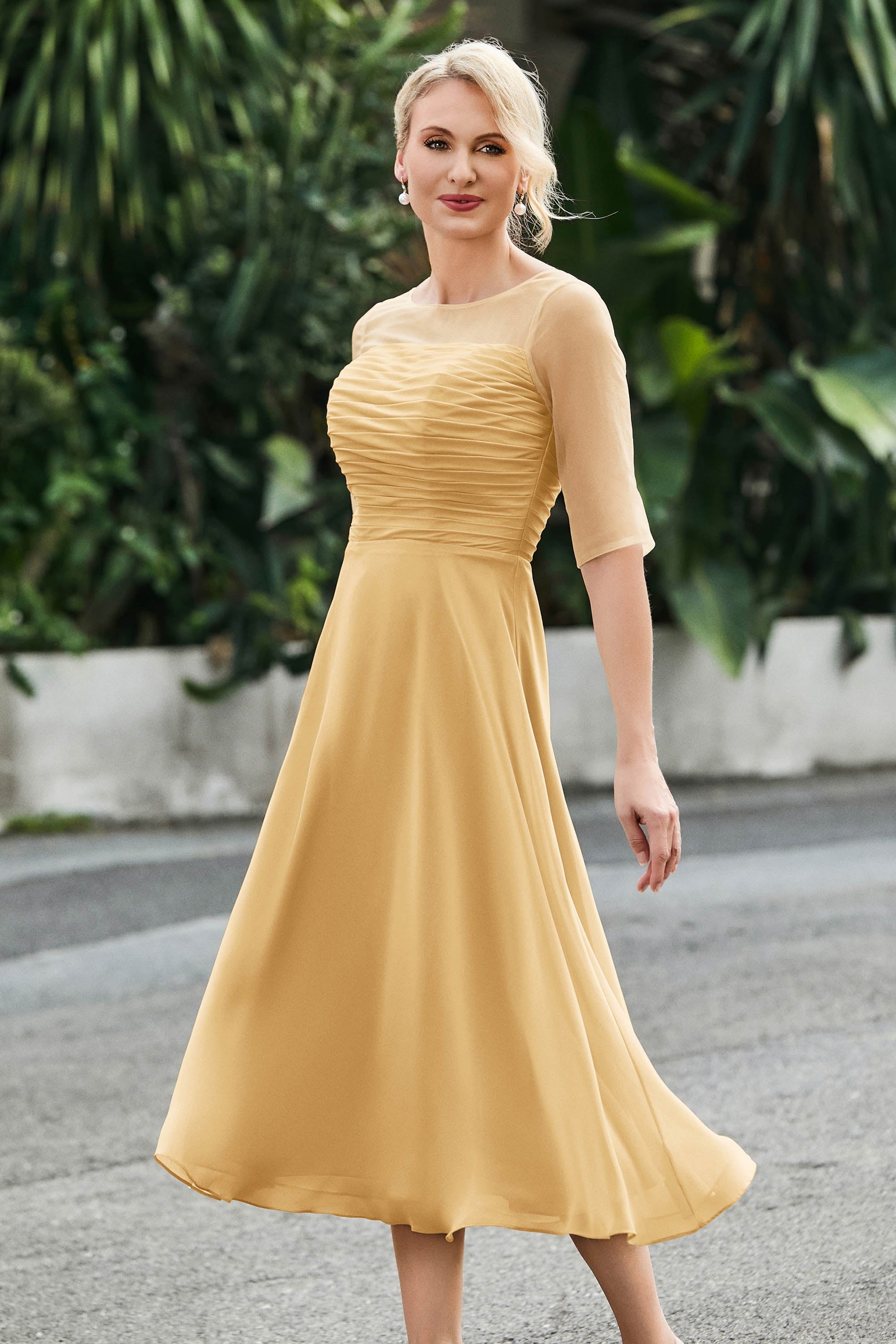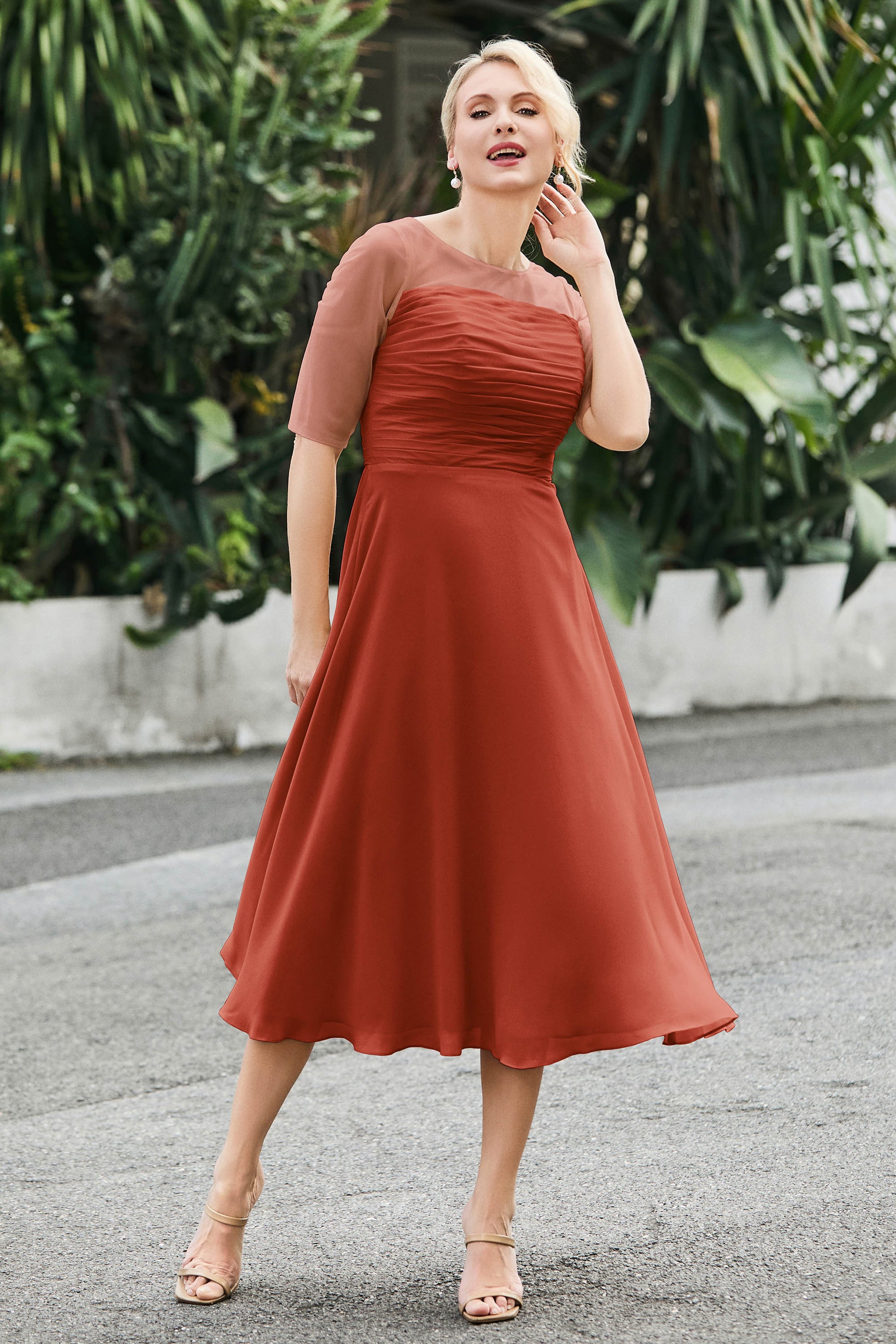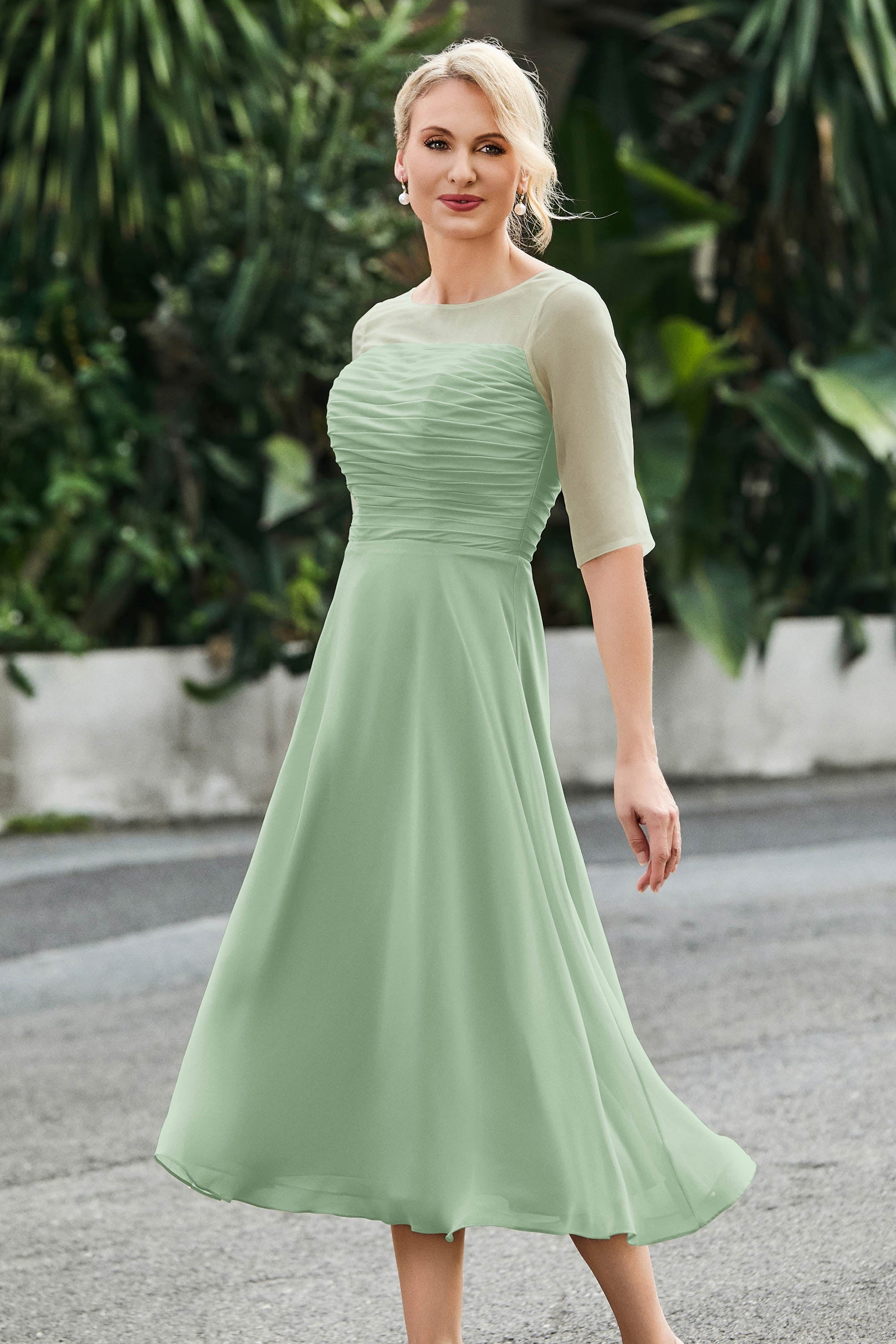 Tea-Length Pleated Chiffon Illusion Neck Dress