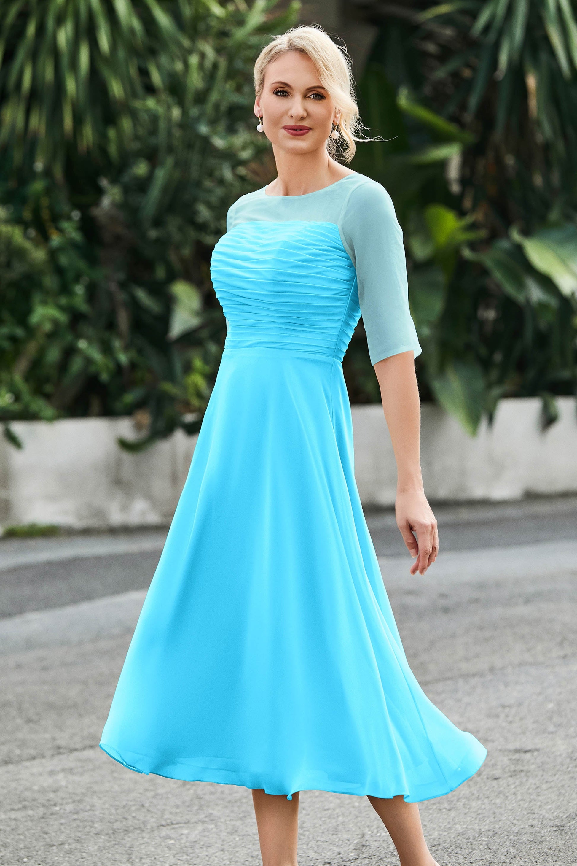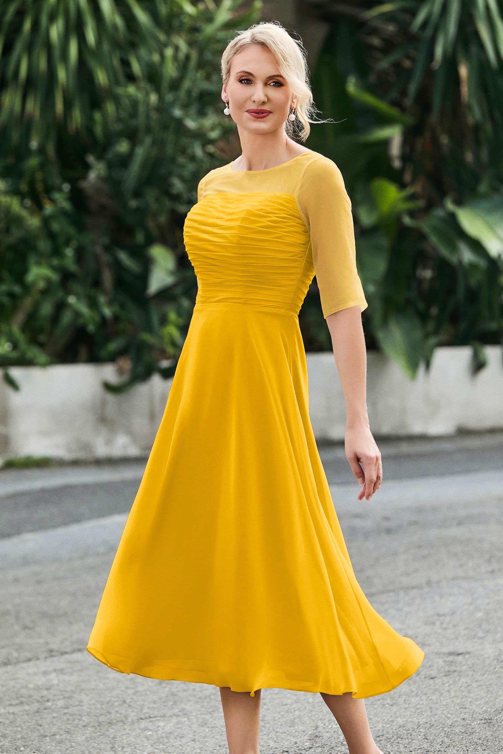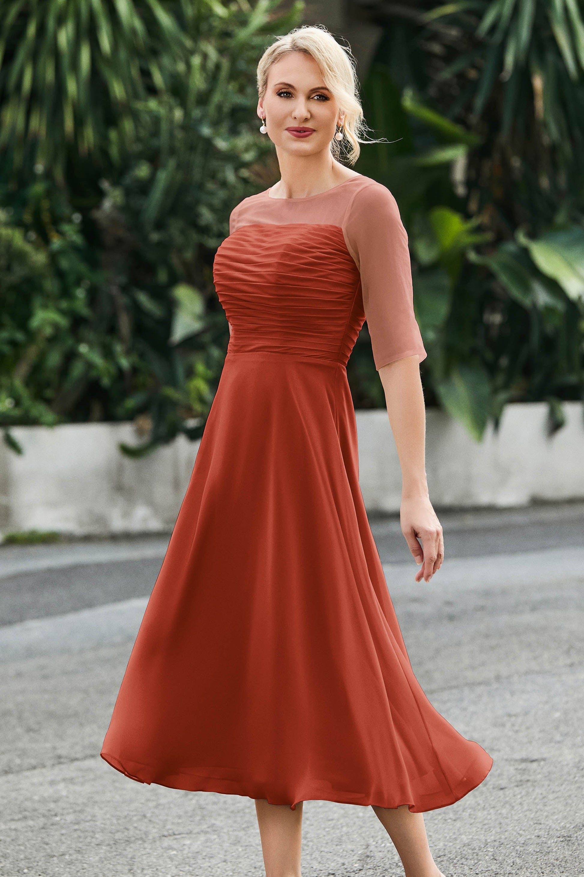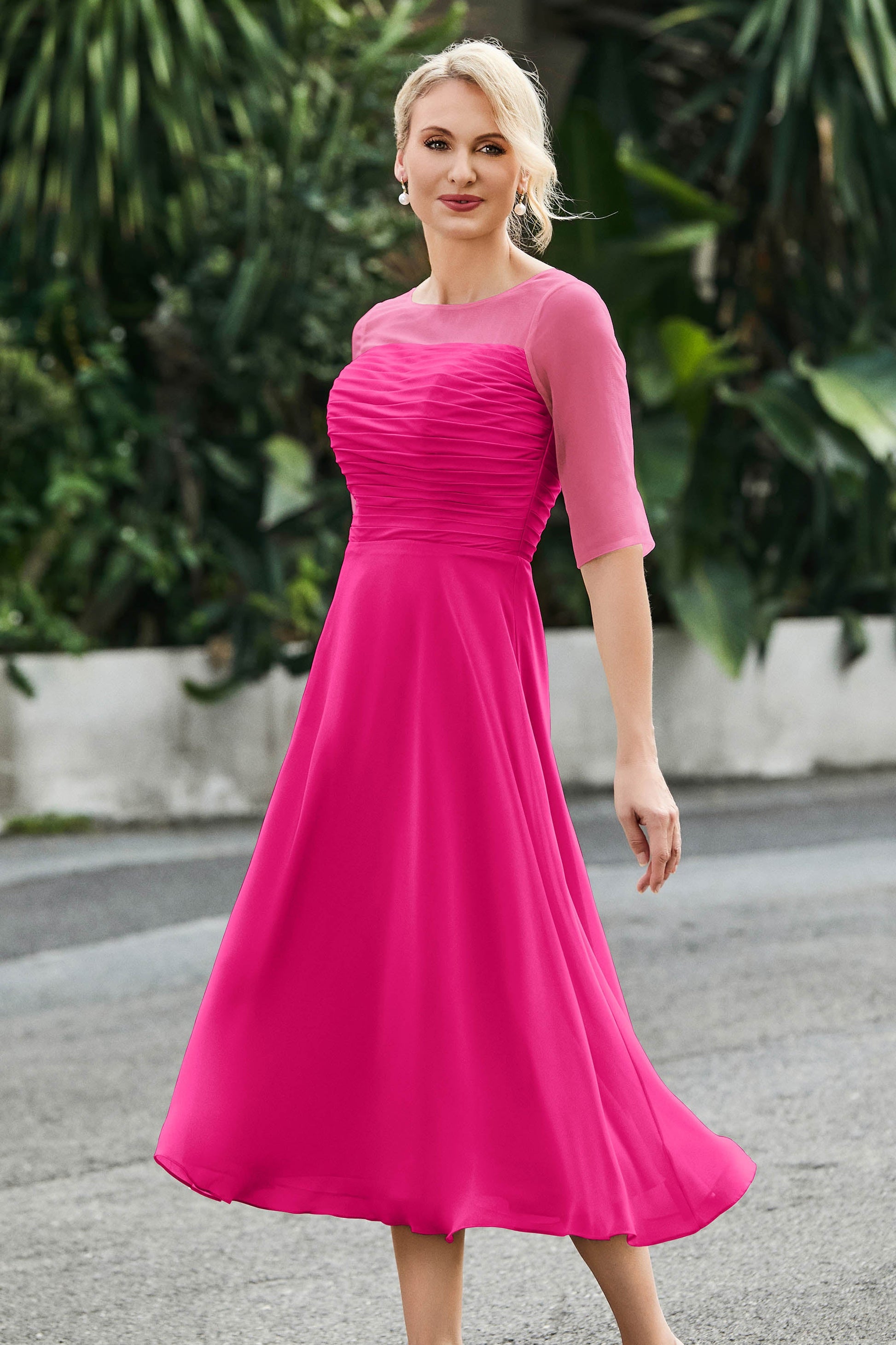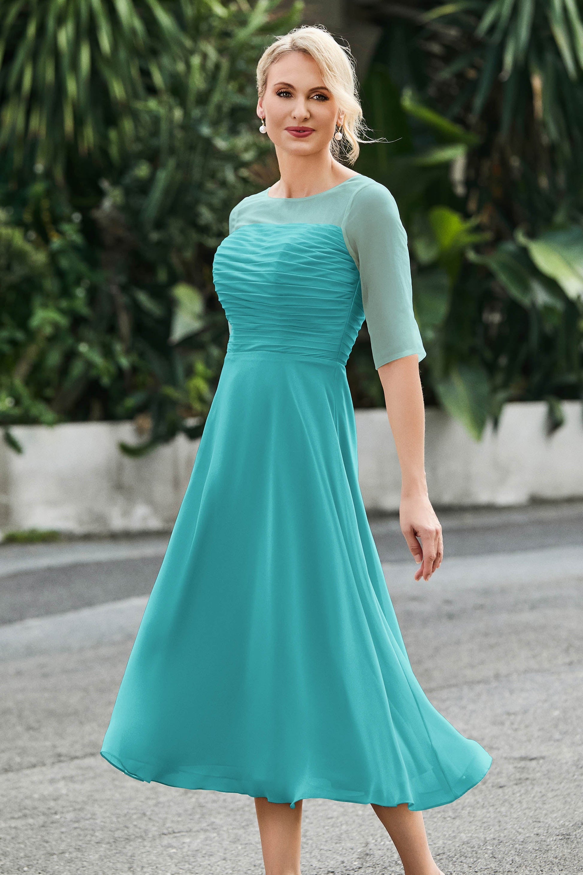 Tea-Length Pleated Chiffon Illusion Neck Dress
