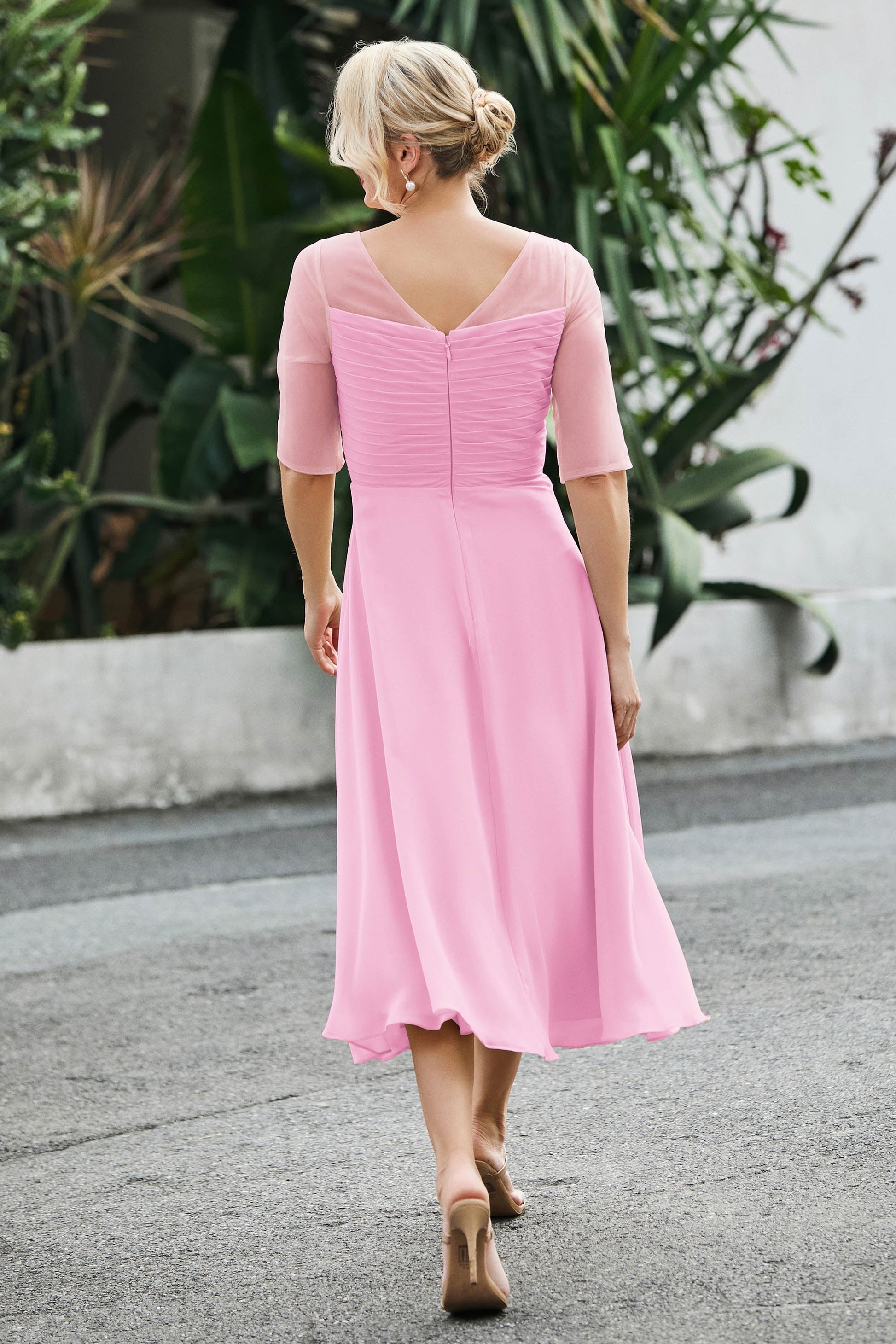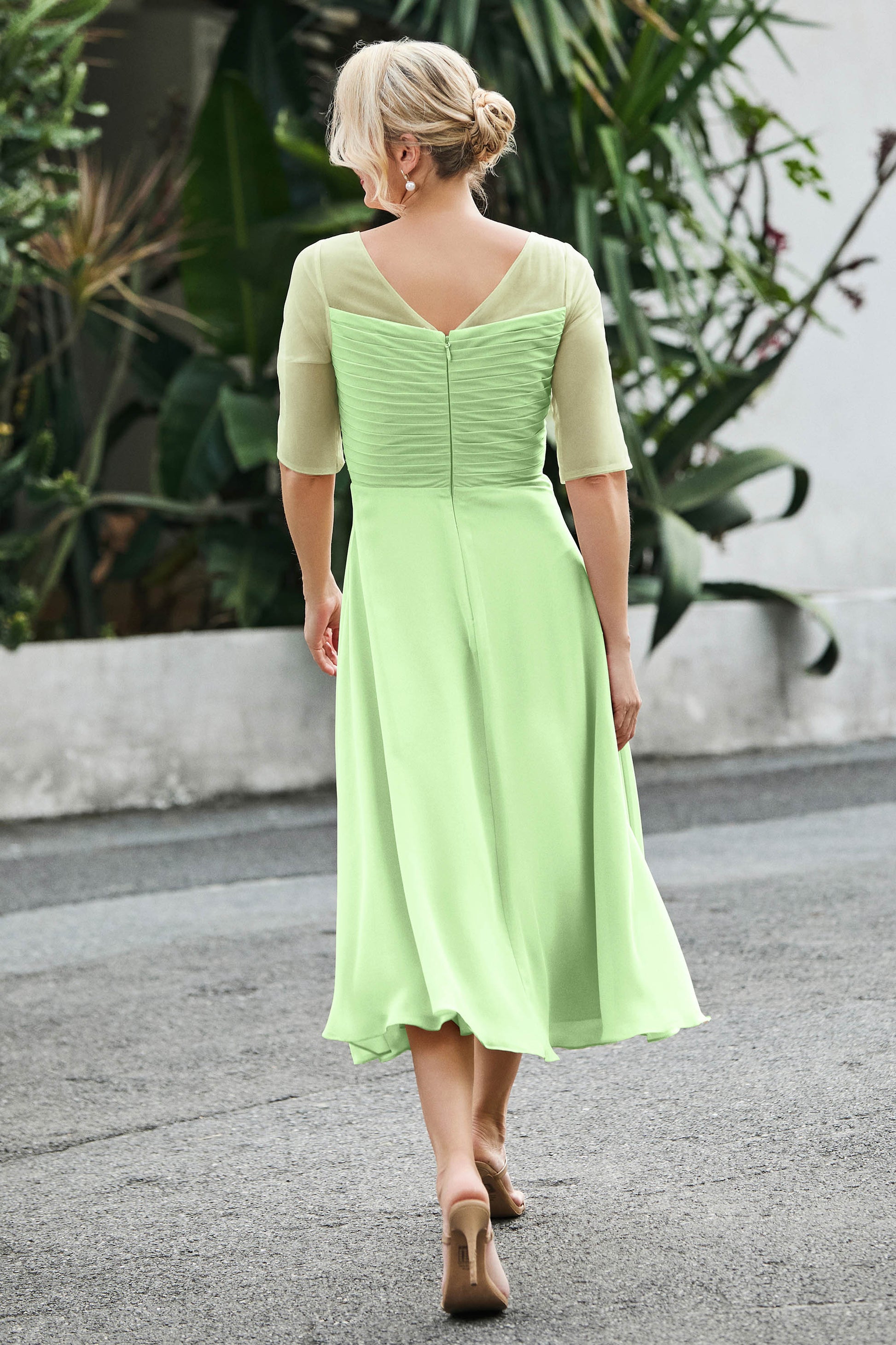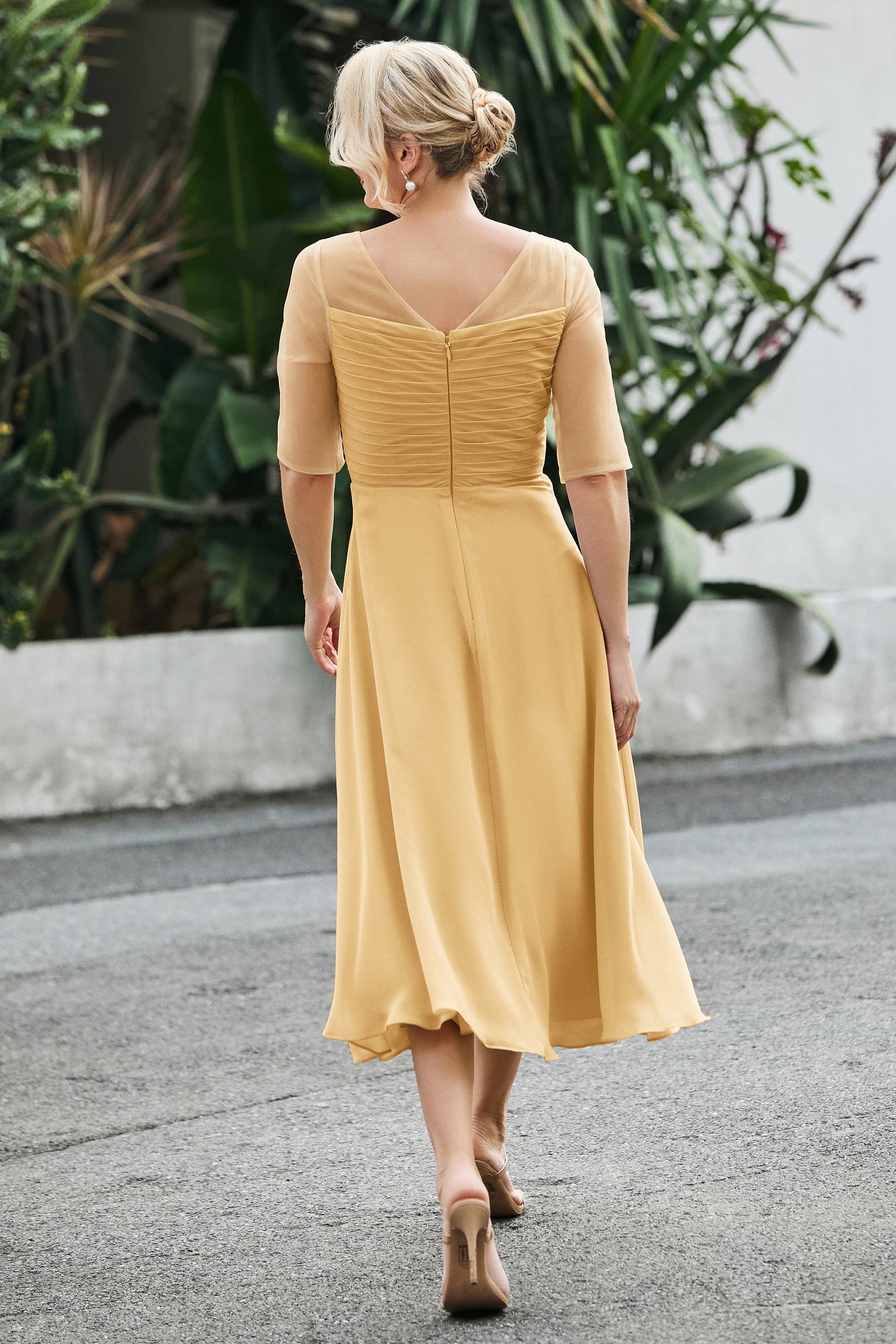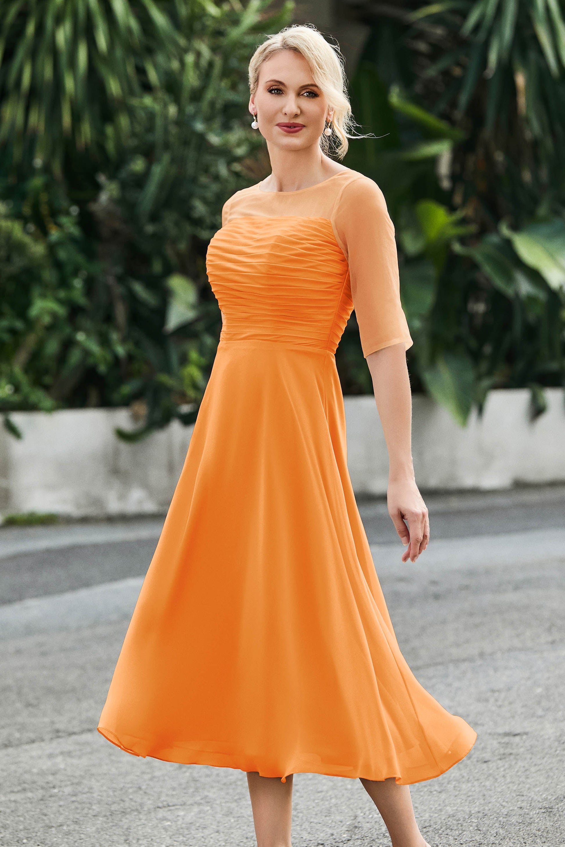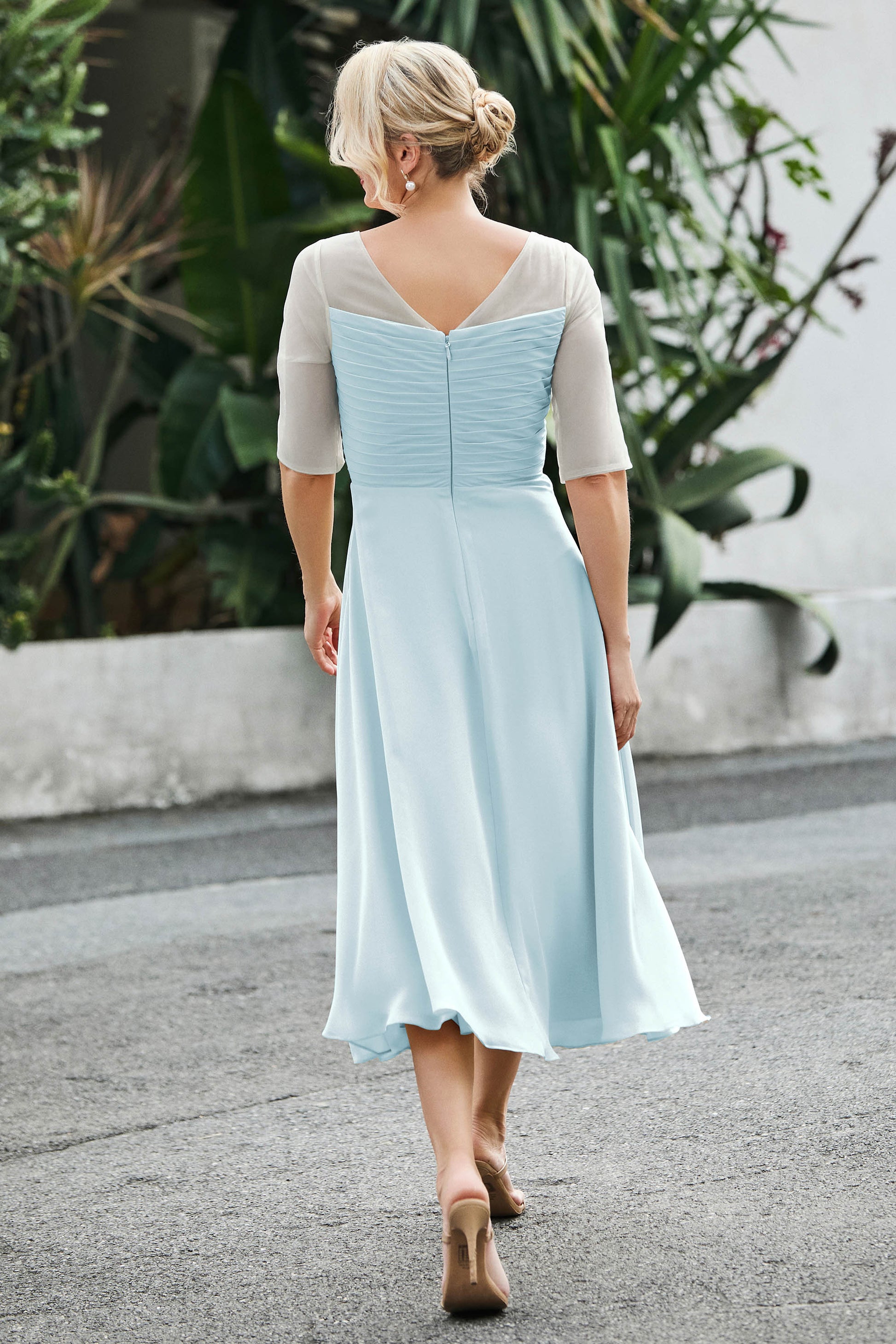 Tea-Length Pleated Chiffon Illusion Neck Dress