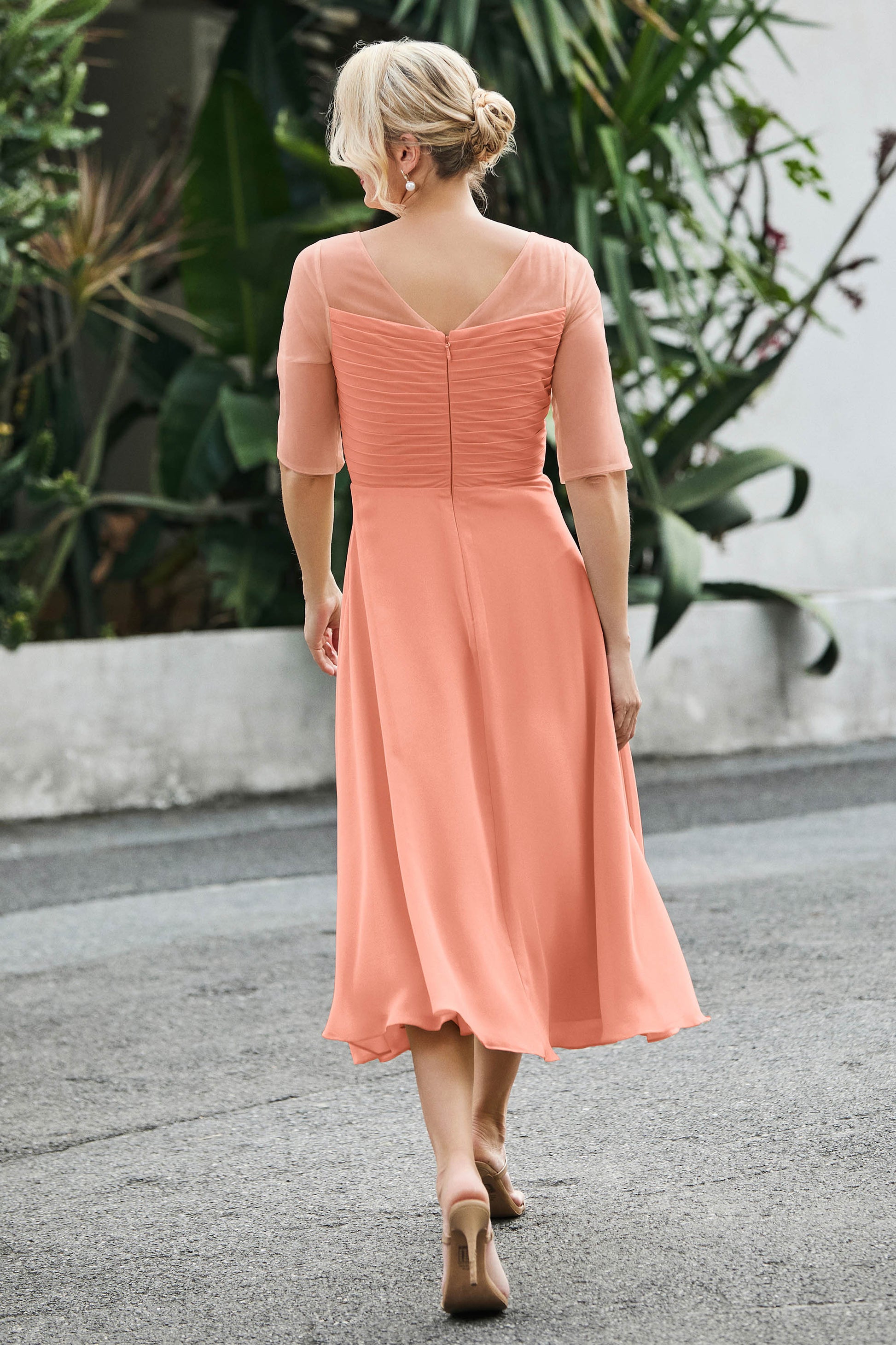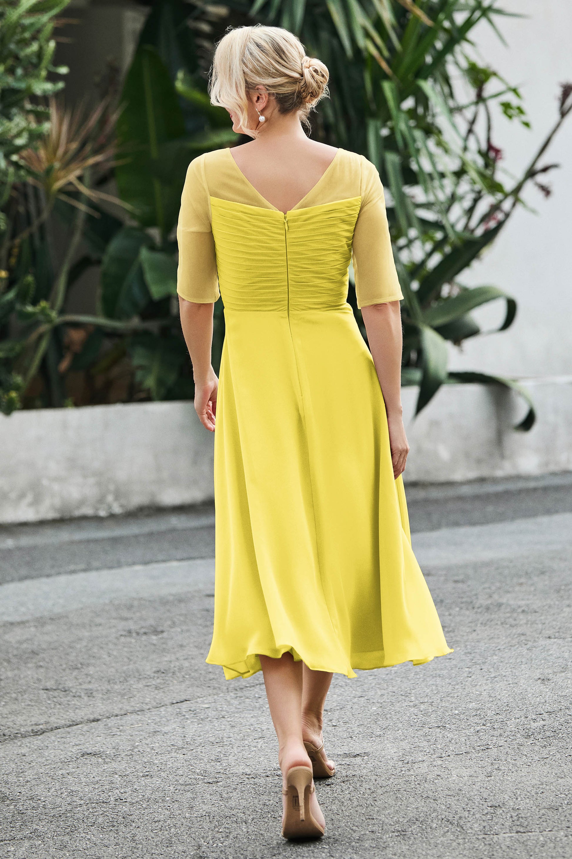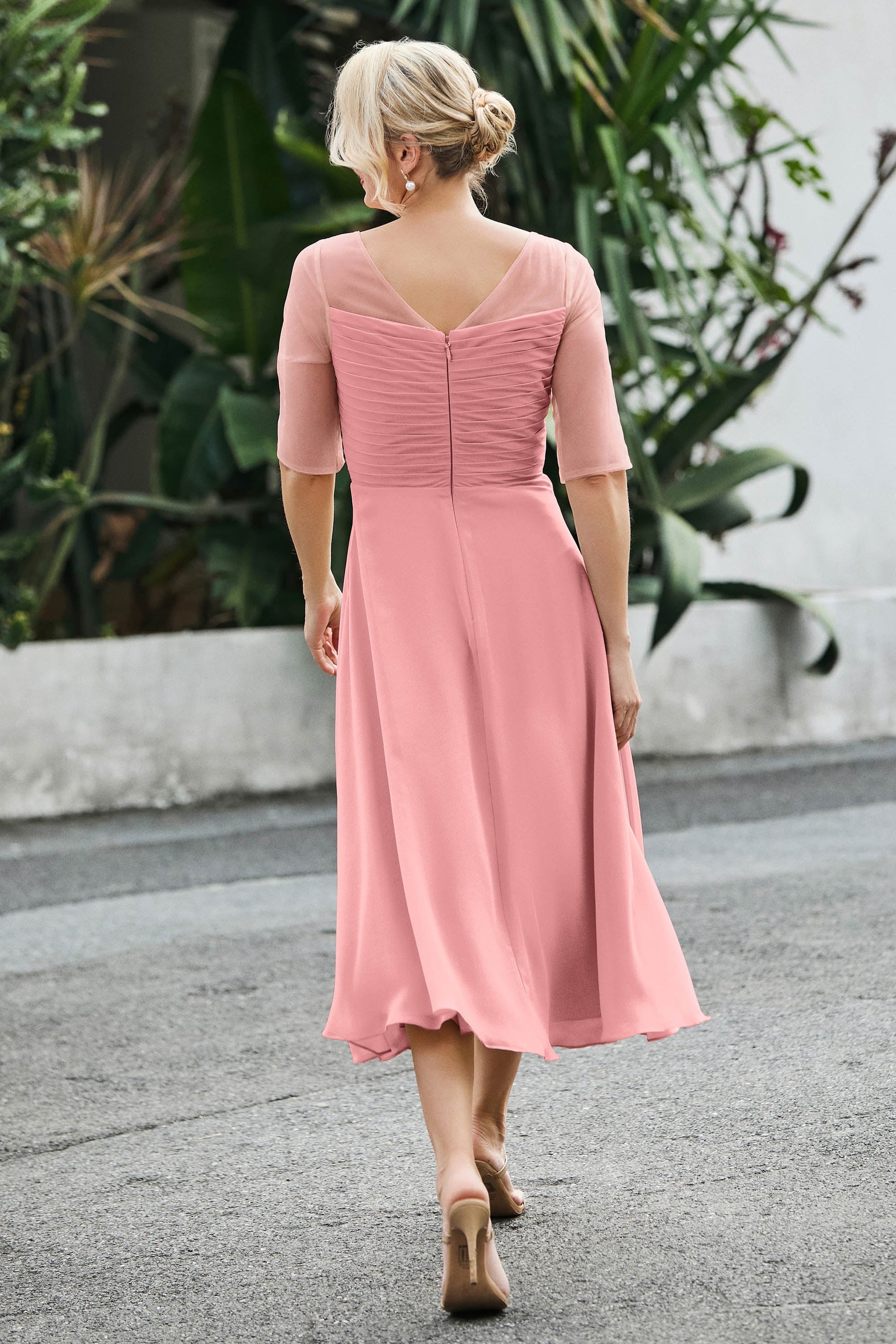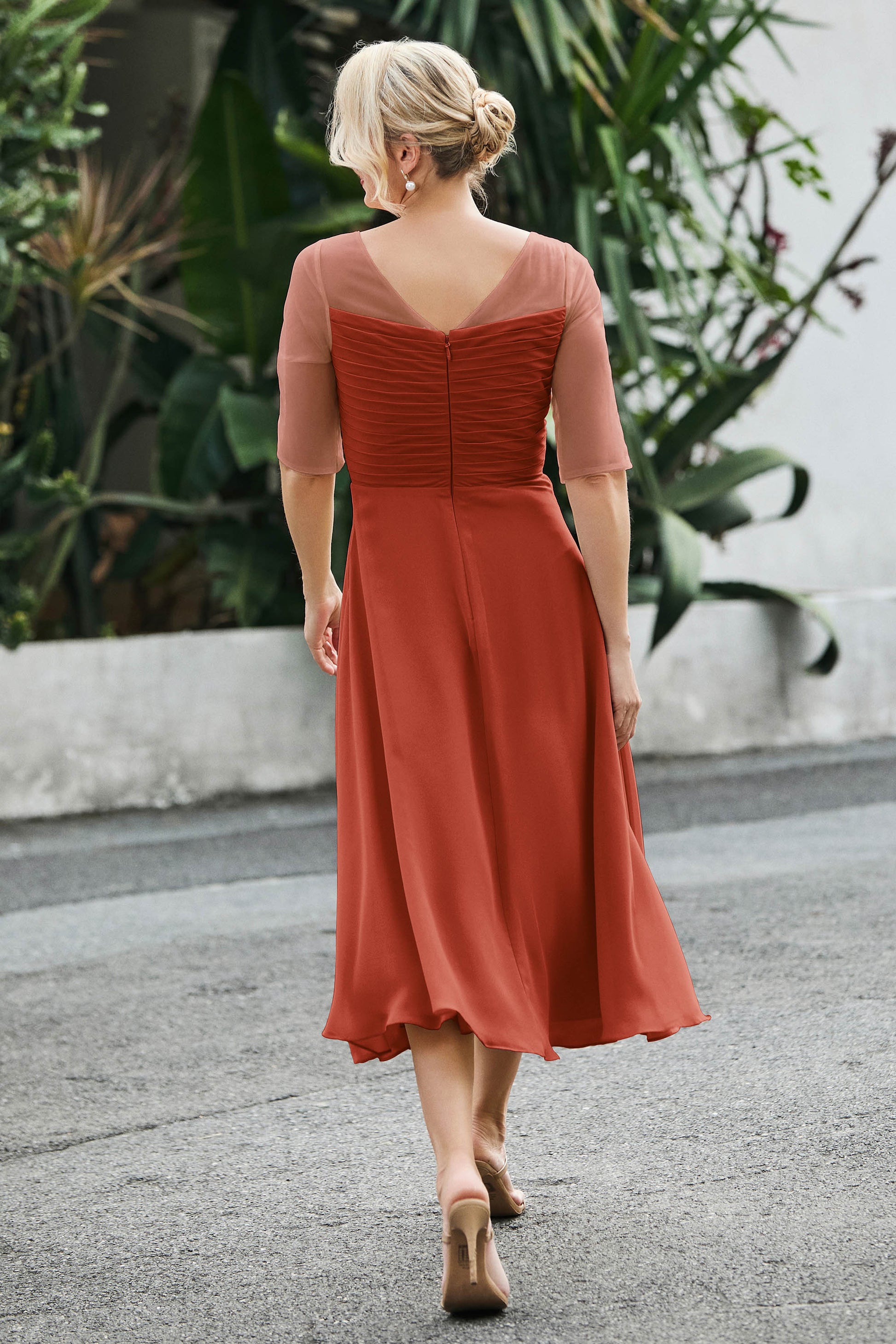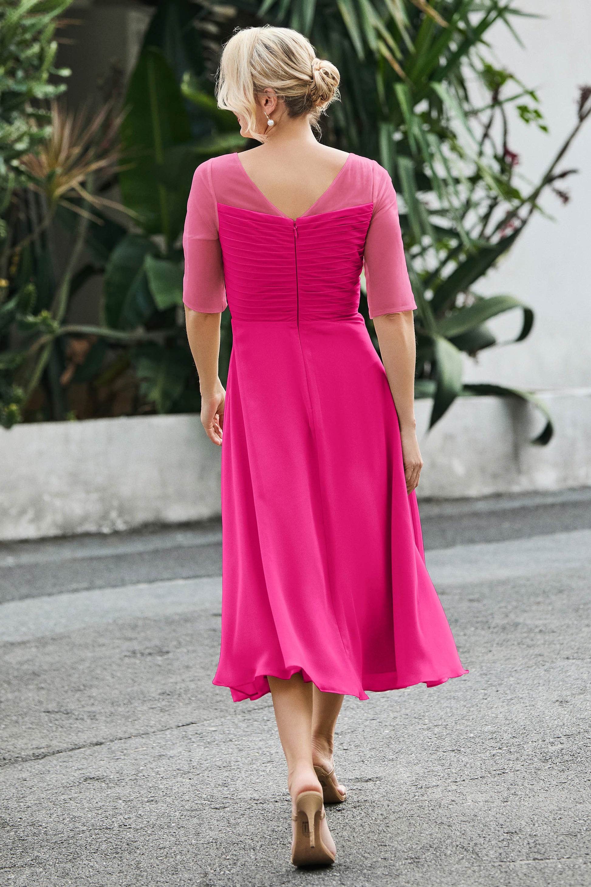 Tea-Length Pleated Chiffon Illusion Neck Dress