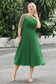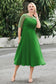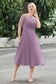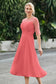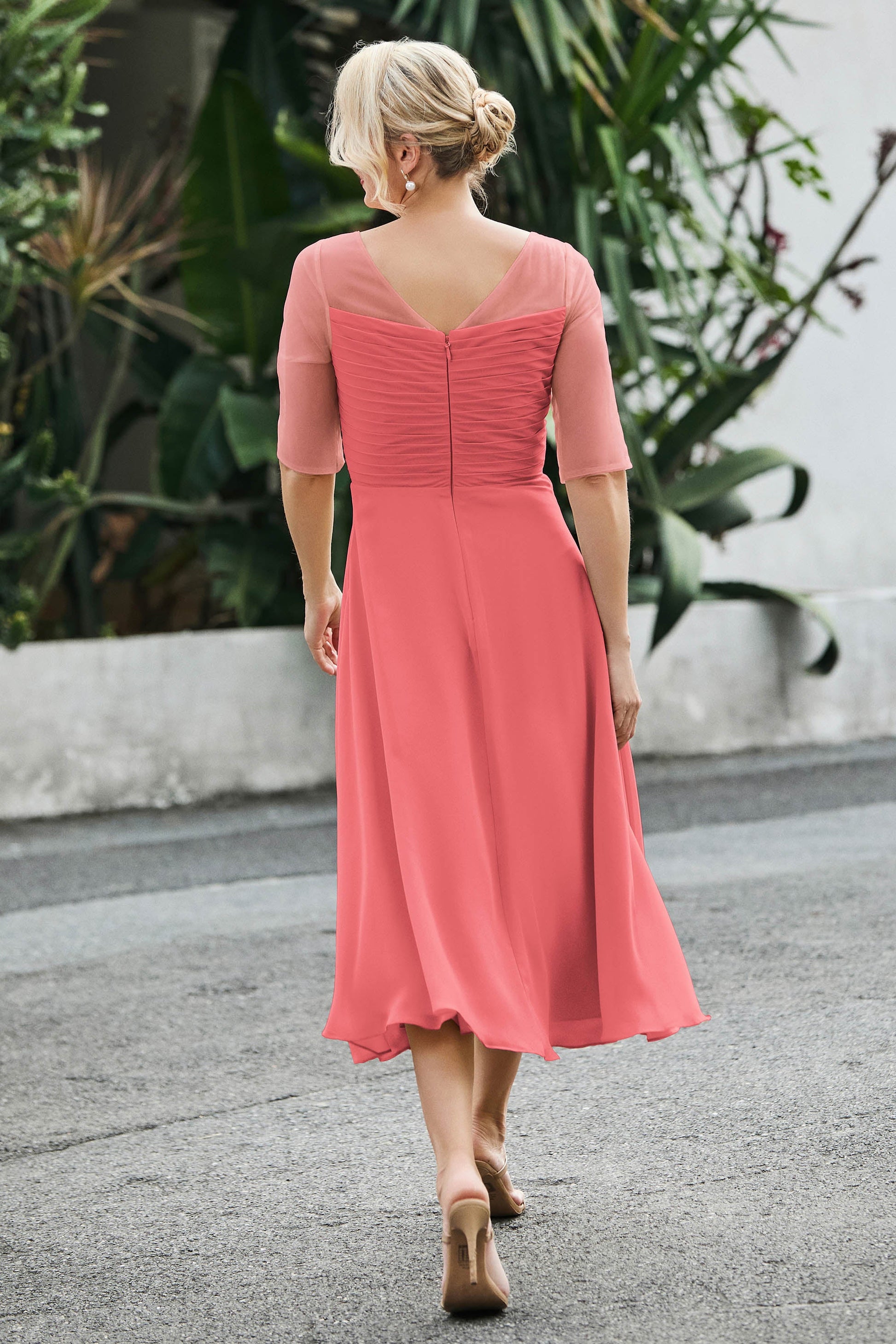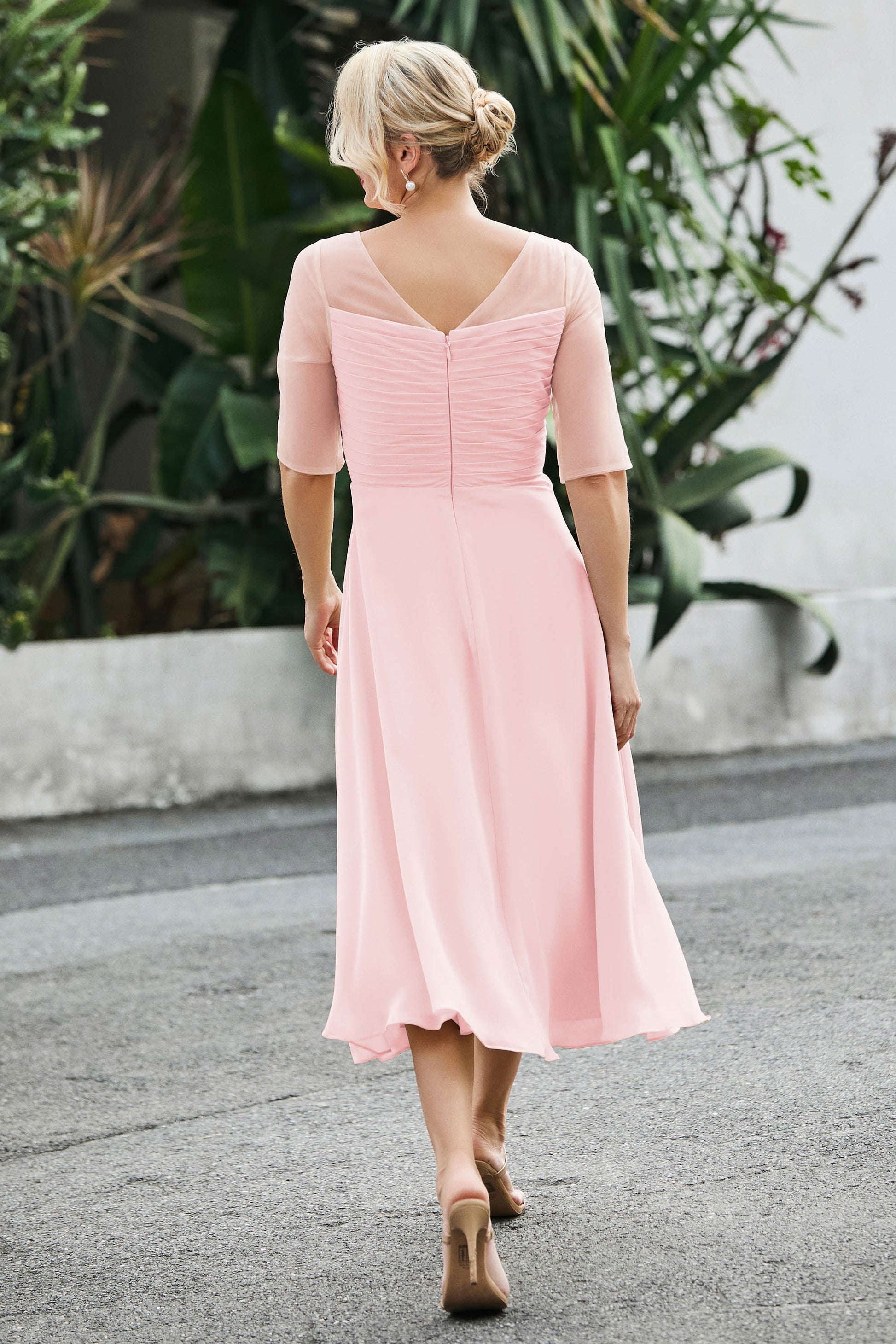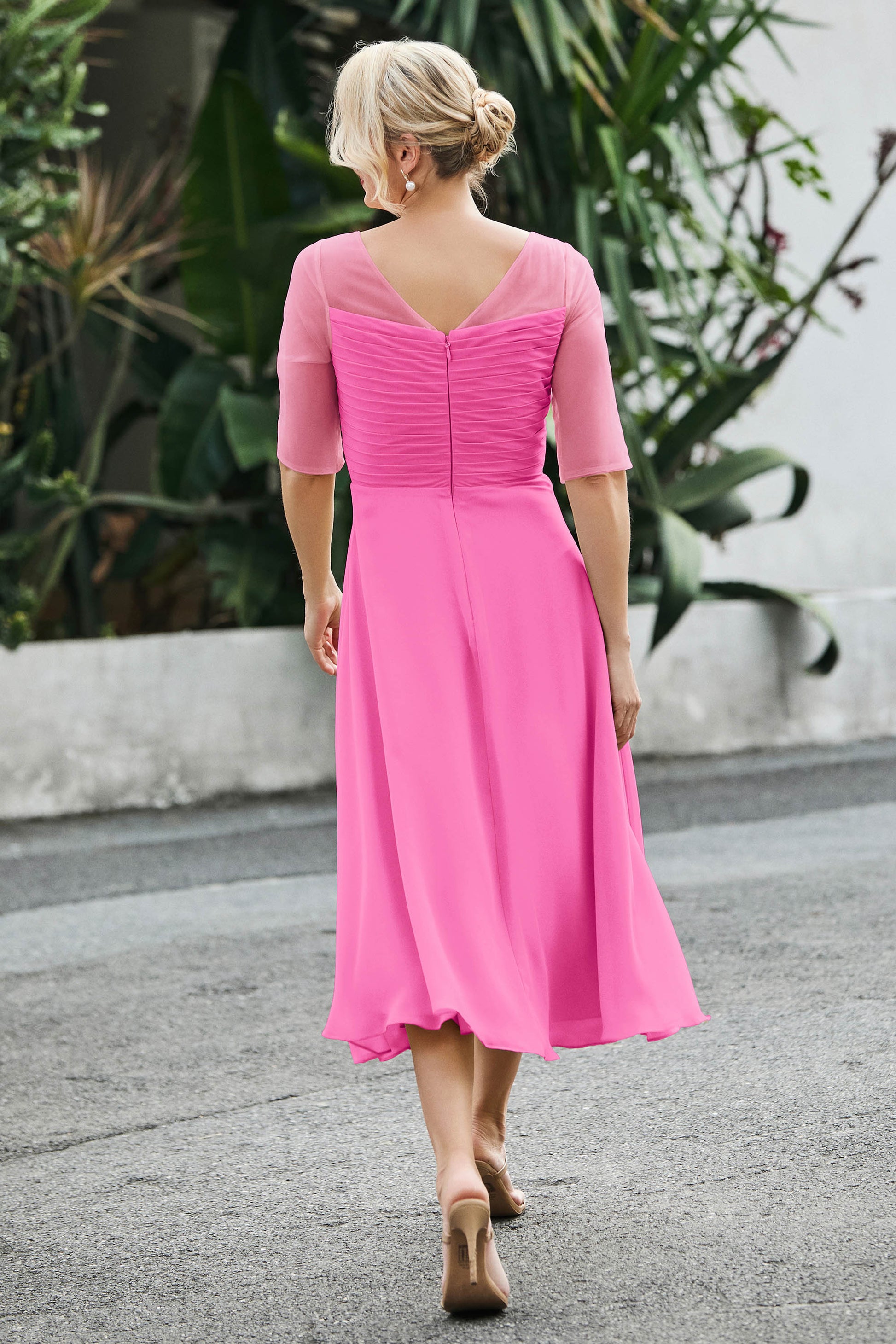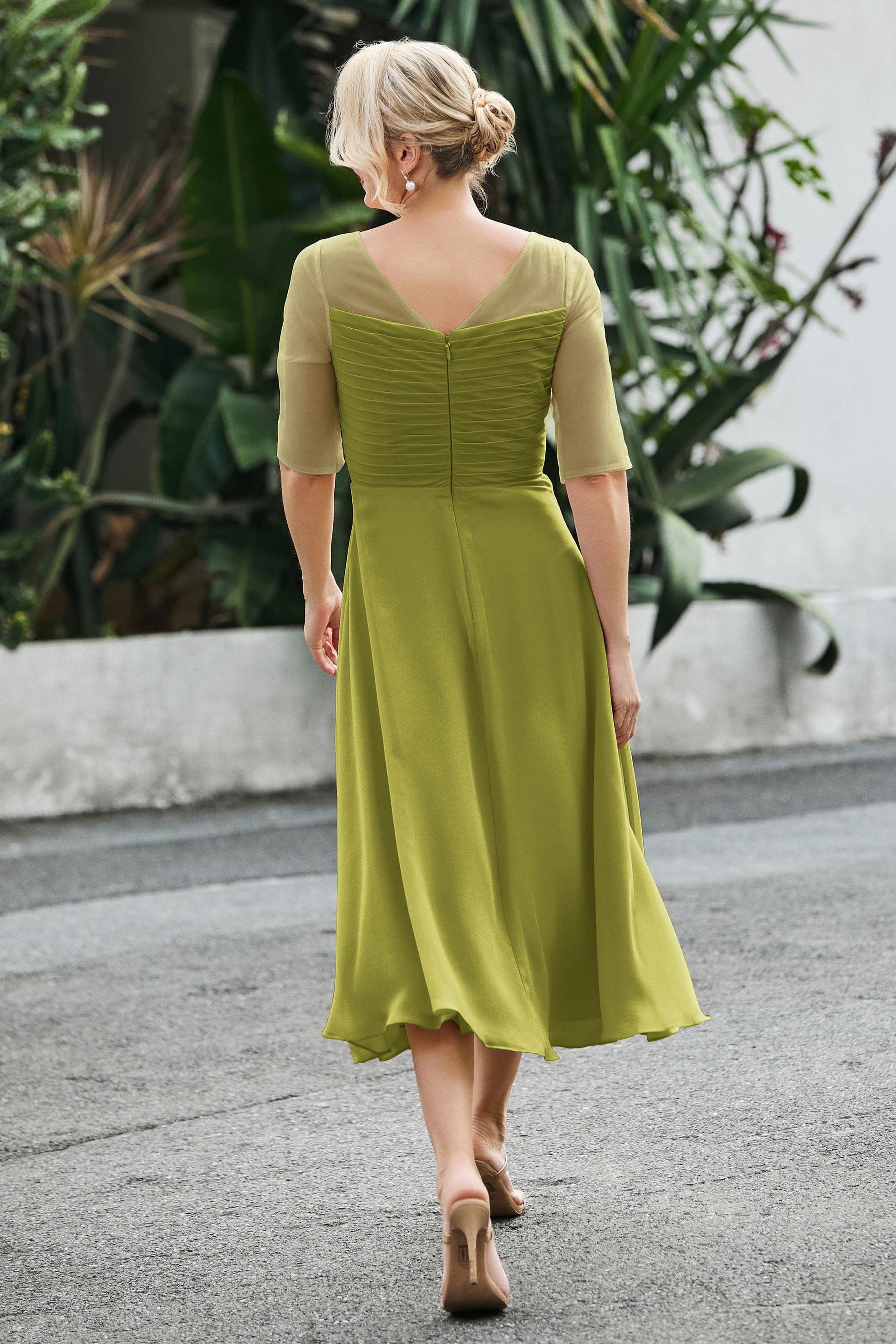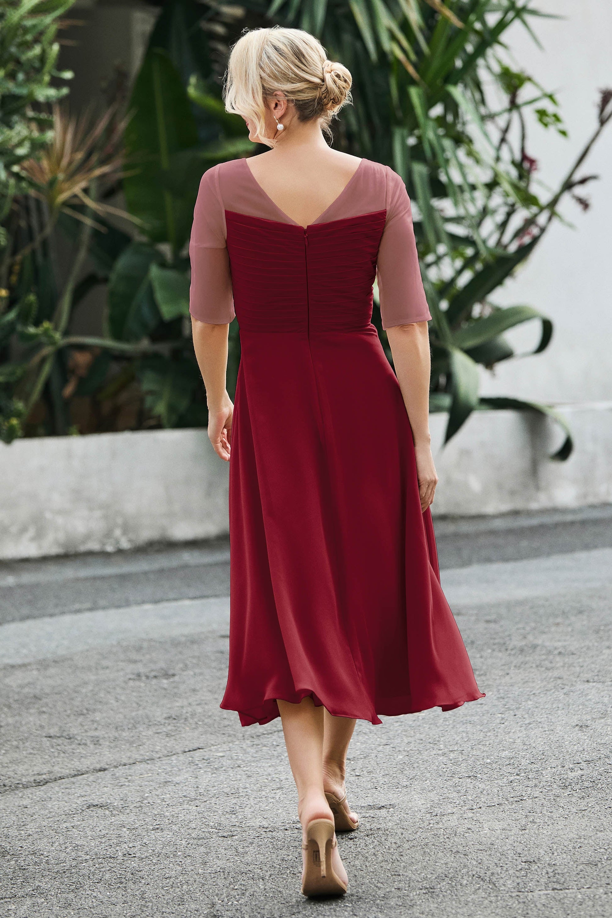 Tea-Length Pleated Chiffon Illusion Neck Dress